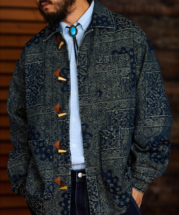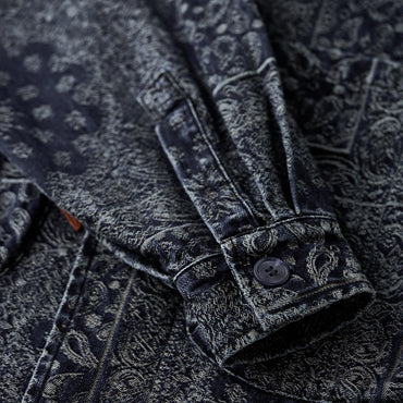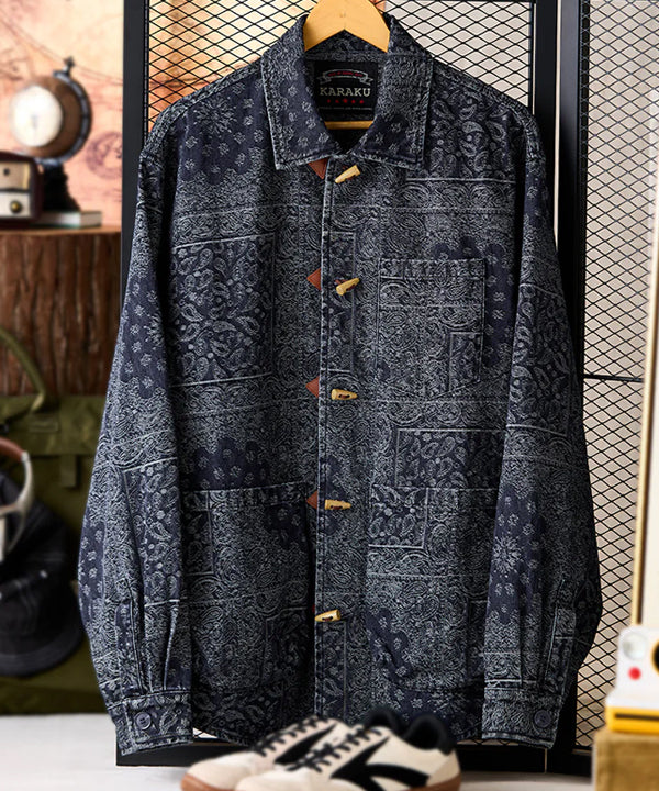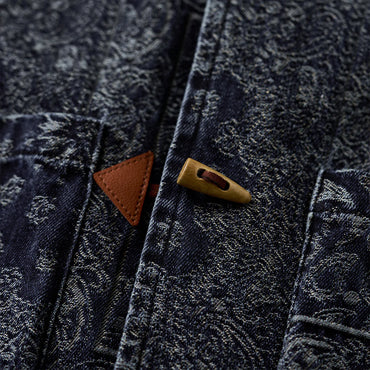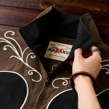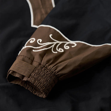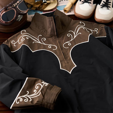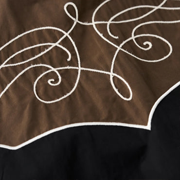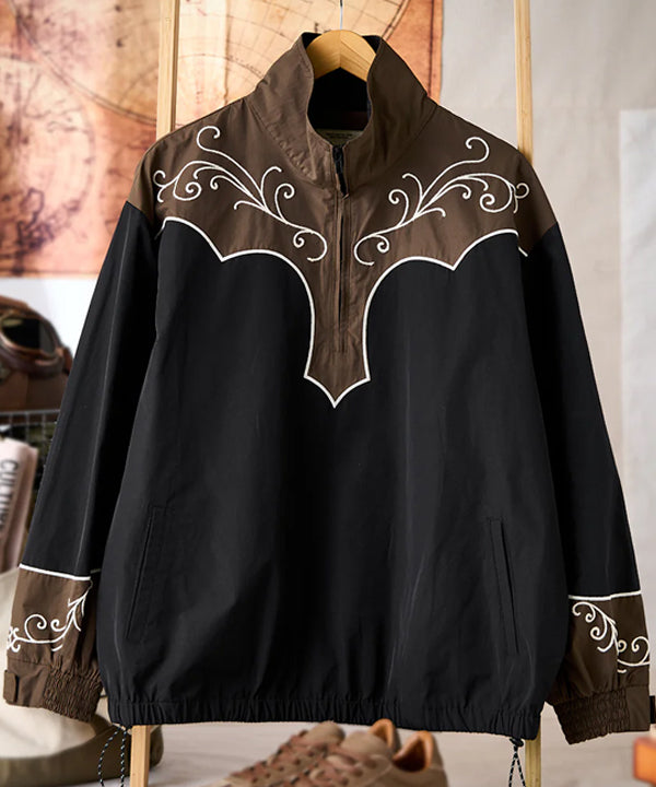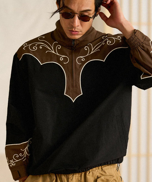 ウエスタンムード漂うハーフジップ仕様のプルオーバースウェット。ブラウンとブラックの大胆なバイカラー切り替えが特徴で、カジュアルながらも力強い印象を演出します。胸元と袖には、アイボリーカラーの蔓草模様をチェーンステッチ刺繍で表現し、クラシカルなウエスタンスタイルを際立たせました。
