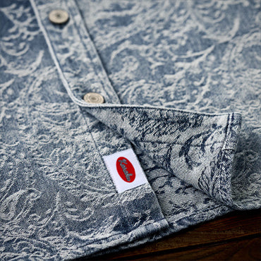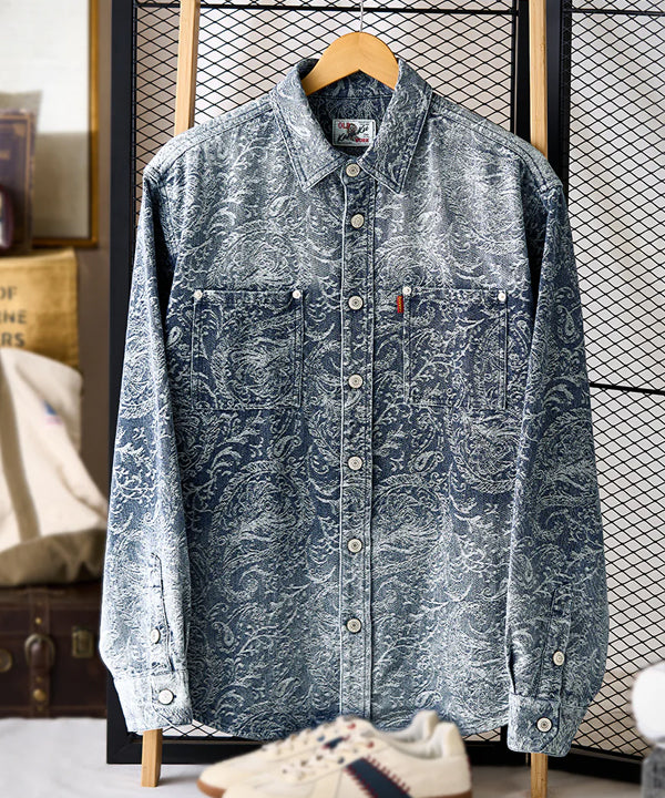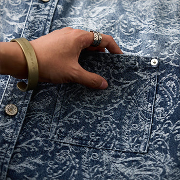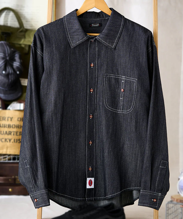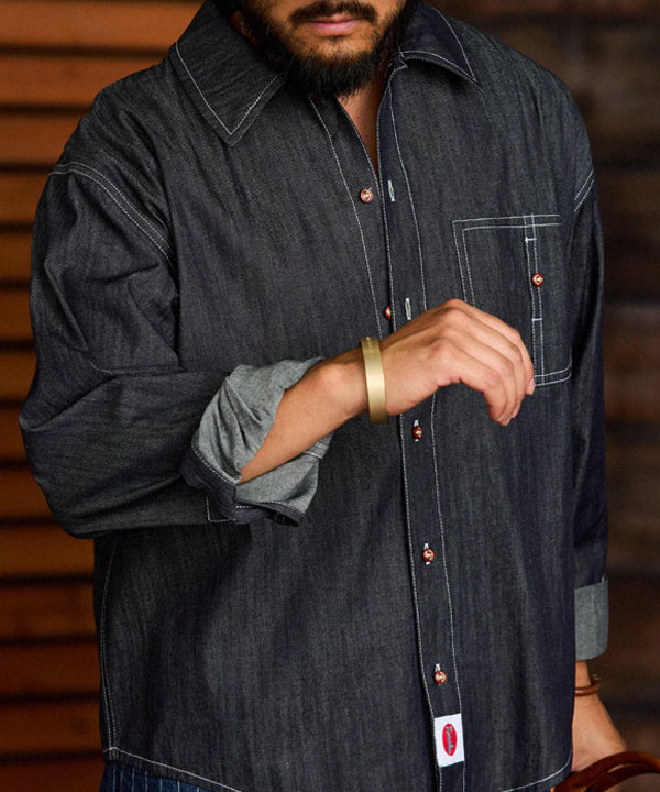 遊び心とディテールで差をつける、こだわりの一枚。定番のデニムシャツ裾に、「赤ヒモ」というさりげないアクセントを効かせた、個性が光る長袖シャツ。マリンテイスト漂うアンカーモチーフのボタンと、随所に施されたホワイトステッチが、表情豊かな一着に仕上げています。