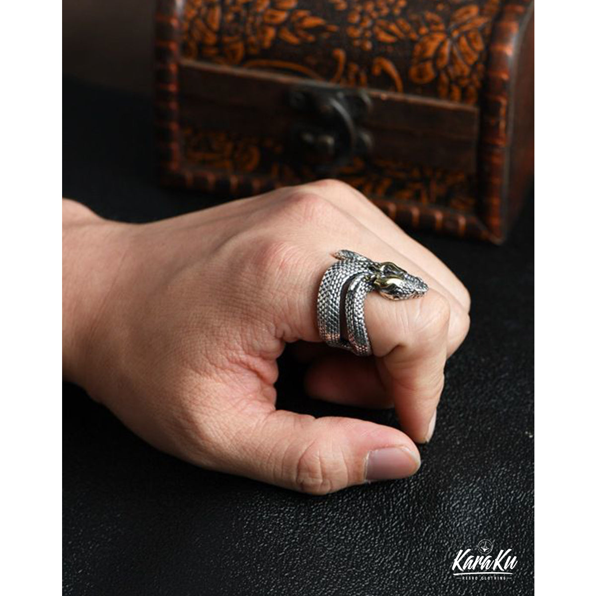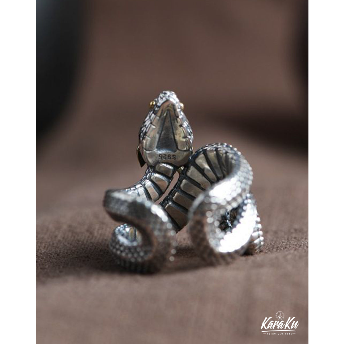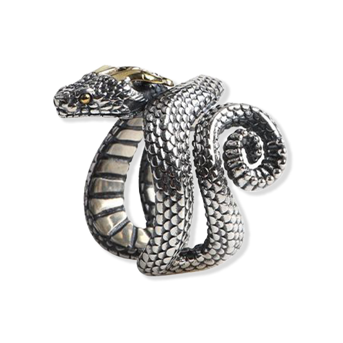 シルバー925を使用して、高級感と重厚感がある。 表面はテクスチャ加工が施されて、ヘビの鱗の質感をリアルに表現し、 マットな質感と光沢のある部分の組み合わせが、奥行きのあるデザインを生み出している。