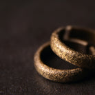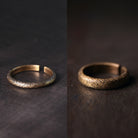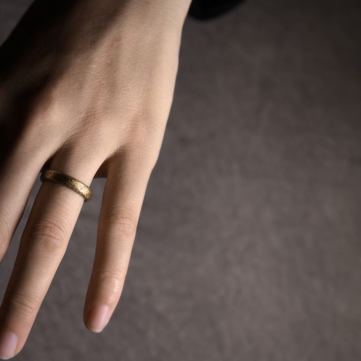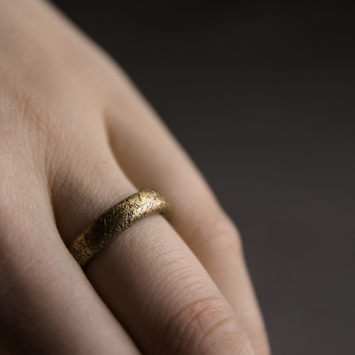 真鍮を使用したリングで、温かみのあるゴールドトーンが特徴。表面にはランダムなテクスチャが施されて、手作業で仕上げられたような独特の風合いを持っています。