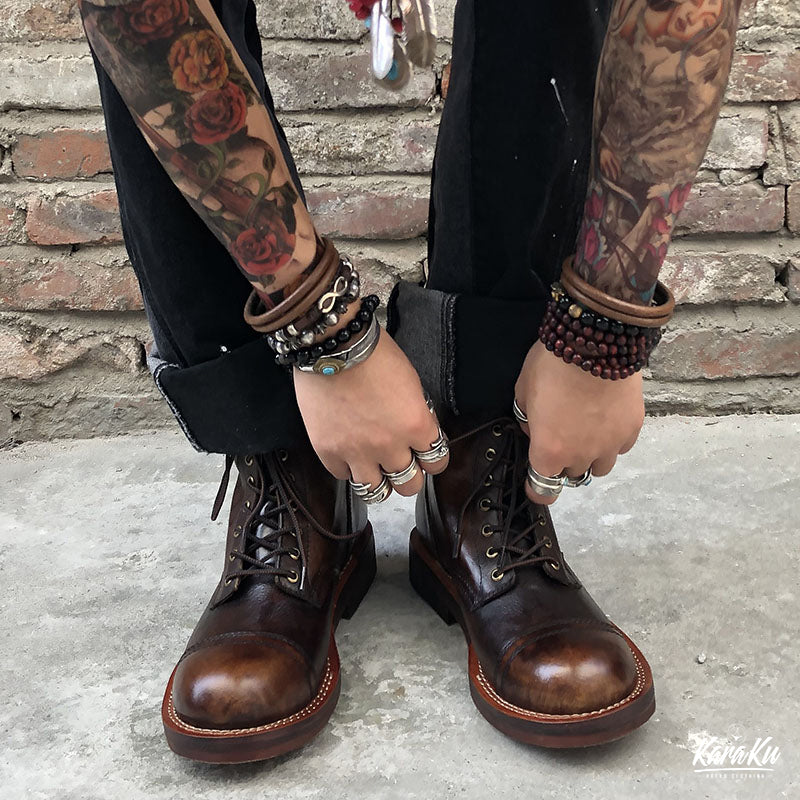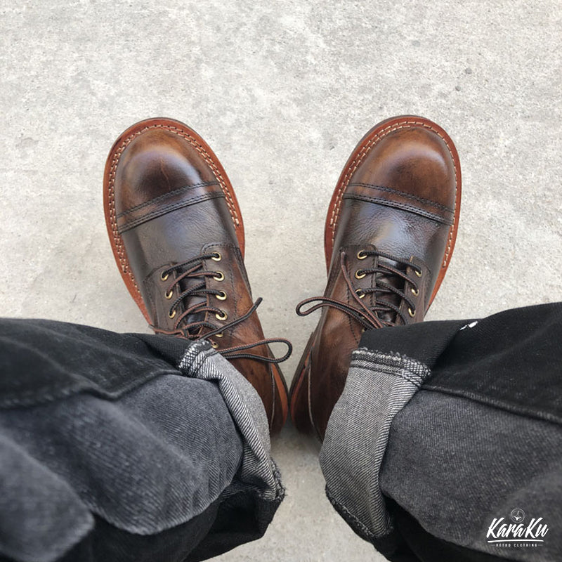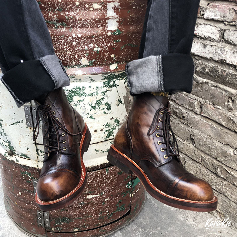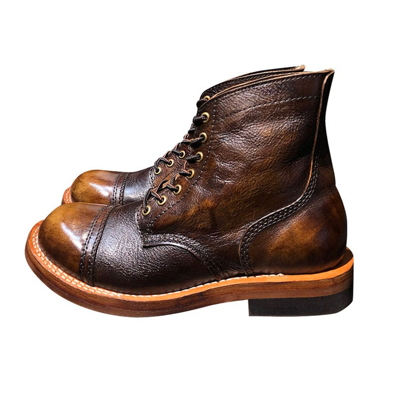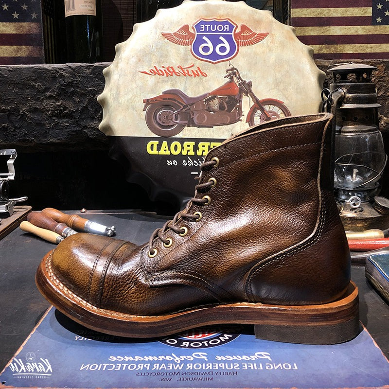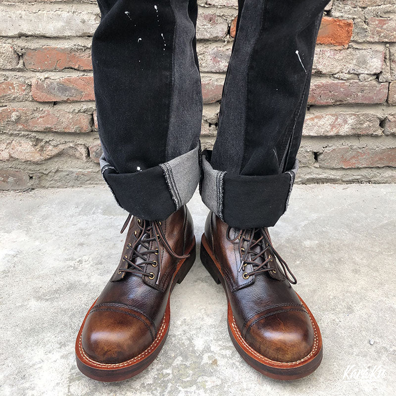 Menggabungkan reka bentuk bahagian atas yang ringkas dengan material tapak yang berat, but kasual ini mempunyai rasa yang mewah. Kulit kulit lembu disamak dengan teliti menggunakan penyamakan sayuran, yang memerlukan banyak masa dan usaha, serta sangat tahan lama. Tekstur semula jadi bahan itu menyerlah, dan semakin anda memakainya, semakin anda boleh menikmati penuaan. Tapak getah juga penting untuk ketahanan dan kekuatan. Sepasang kasut yang boleh digunakan untuk segala-galanya daripada gaya biker maskulin hingga ke perjalanan.