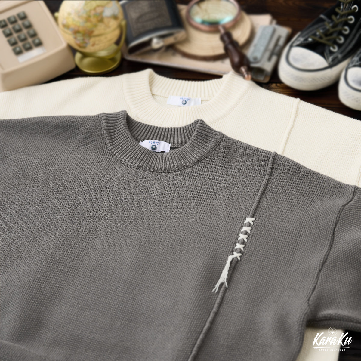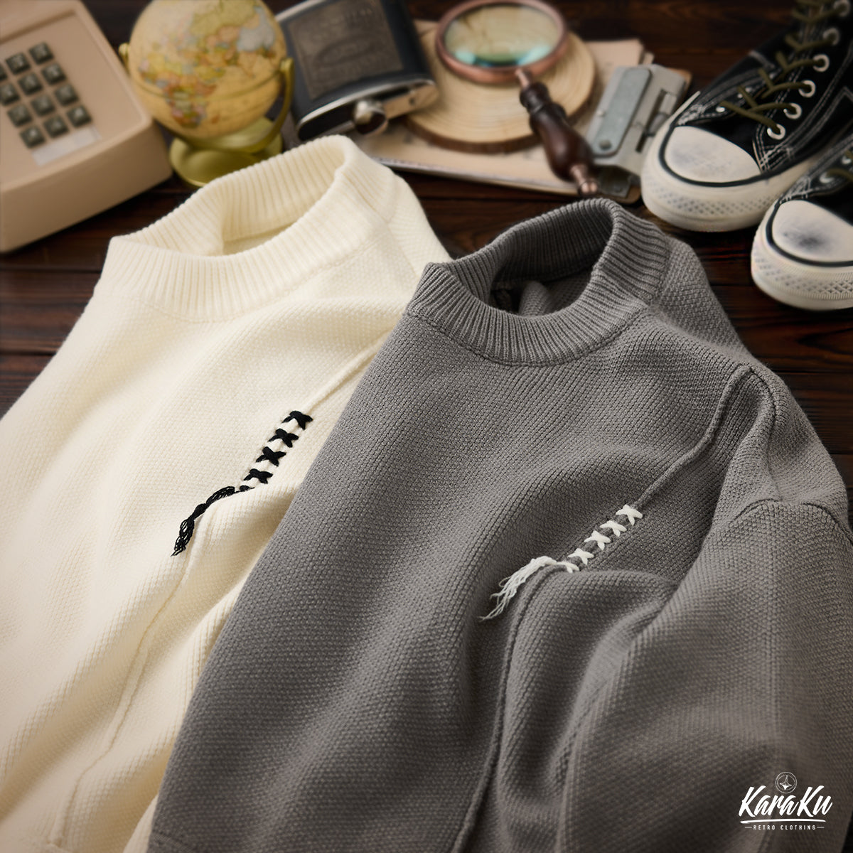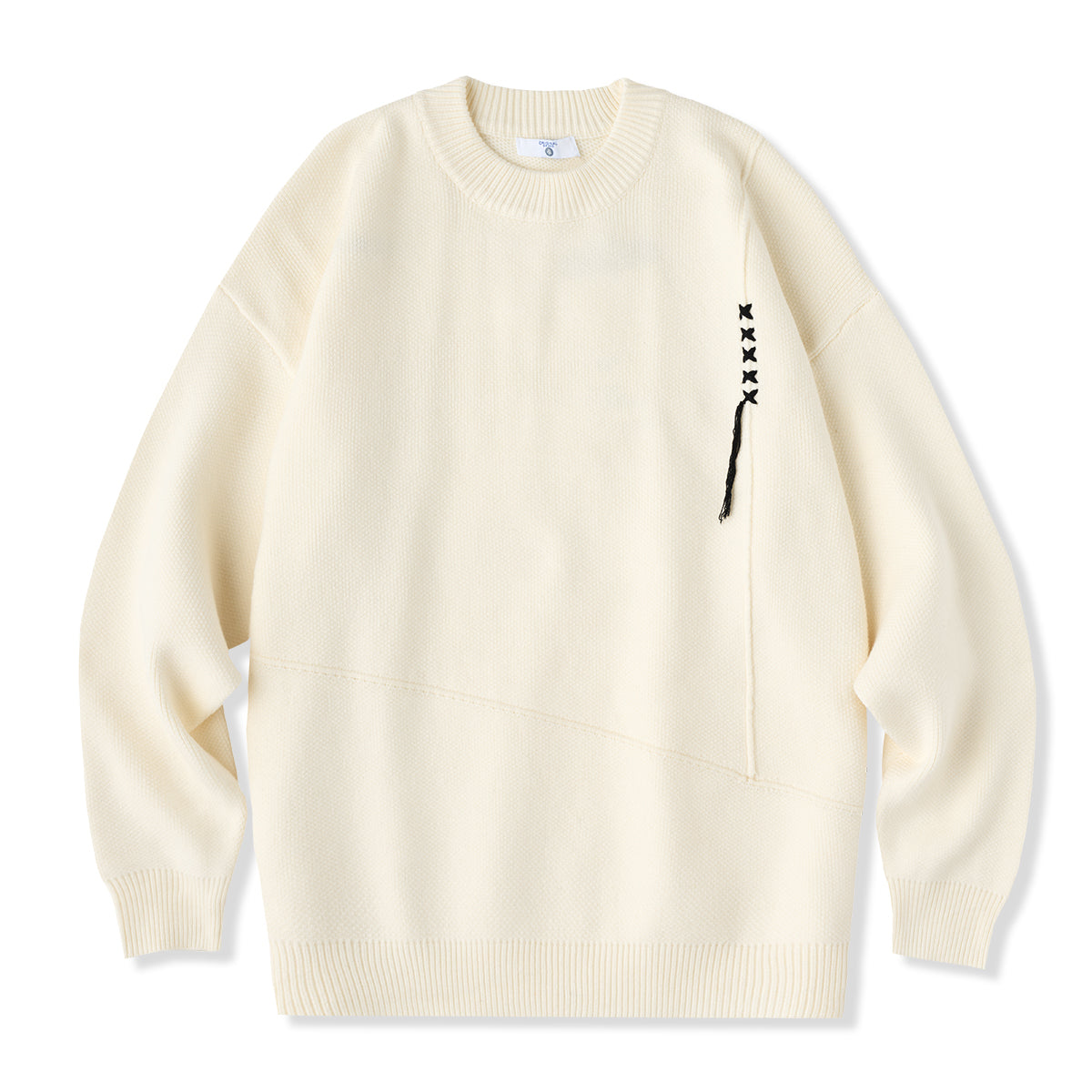 Sweater ini menggabungkan reka bentuk dekonstruksi dan menampilkan bentuk dan butiran yang unik. Bahu, hadapan dan kedua-dua belah belakang direka bentuk dengan lengkok, mencipta garisan yang mengalir dan rasa tiga dimensi yang tidak terdapat dalam baju sejuk biasa. Jahitan berwarna di bahagian hadapan menyerlah, dan jahitan yang menggabungkan warna berbeza memberikan irama keseluruhan, menambah rupa unik pada rajutan ringkas. Reka bentuk mempunyai keseimbangan sempurna antara jahitan yang teliti dan skema warna yang suka bermain, menjadikannya mudah dipadankan dengan kedua-dua gaya kasual dan bergaya.