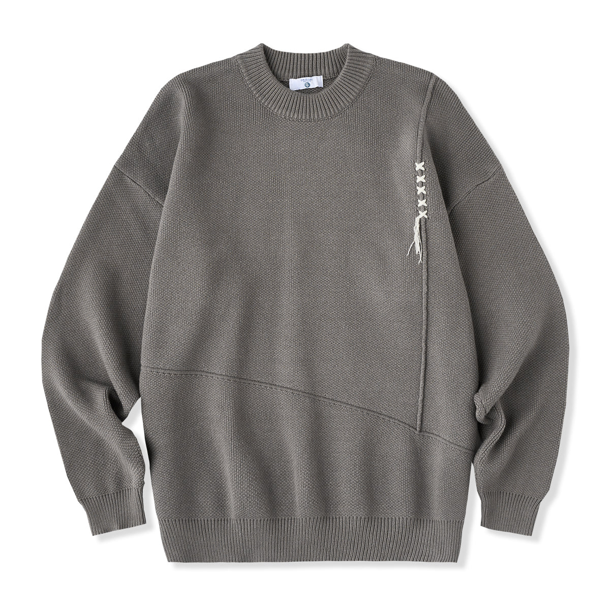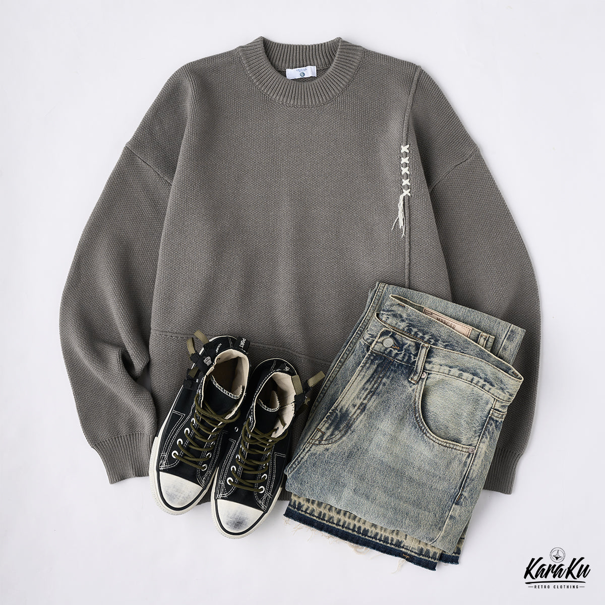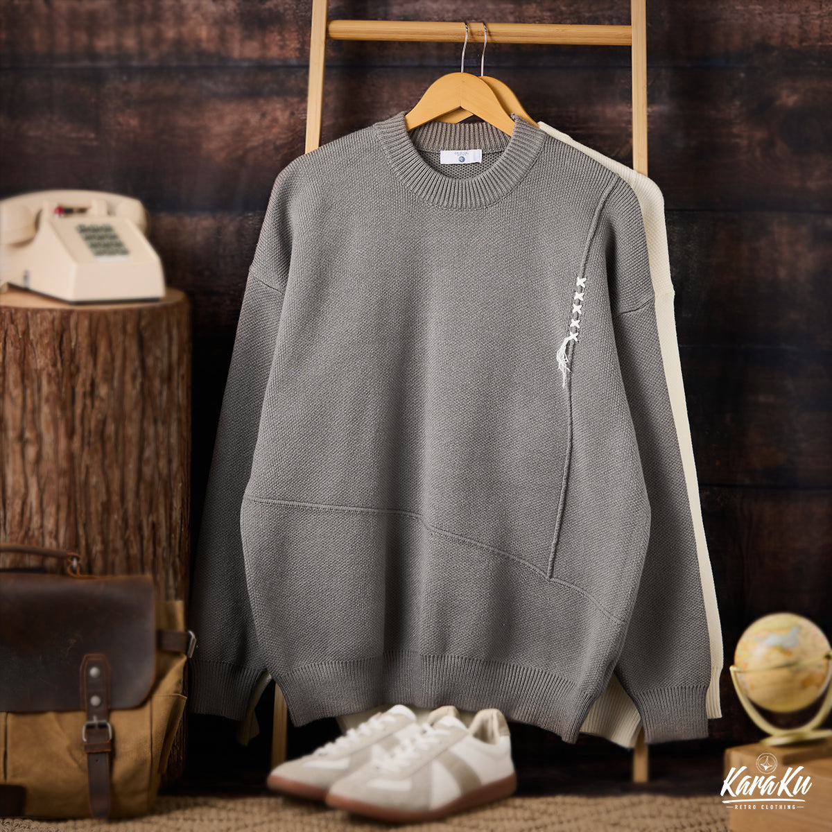 Sweater ini menggabungkan reka bentuk dekonstruksi dan menampilkan bentuk dan butiran yang unik. Bahu, hadapan dan kedua-dua belah belakang direka bentuk dengan lengkok, mencipta garisan yang mengalir dan rasa tiga dimensi yang tidak terdapat dalam baju sejuk biasa. Jahitan berwarna di bahagian hadapan menyerlah, dan jahitan yang menggabungkan warna berbeza memberikan irama keseluruhan, menambah rupa unik pada rajutan ringkas. Reka bentuk mempunyai keseimbangan sempurna antara jahitan yang teliti dan skema warna yang suka bermain, menjadikannya mudah dipadankan dengan kedua-dua gaya kasual dan bergaya.