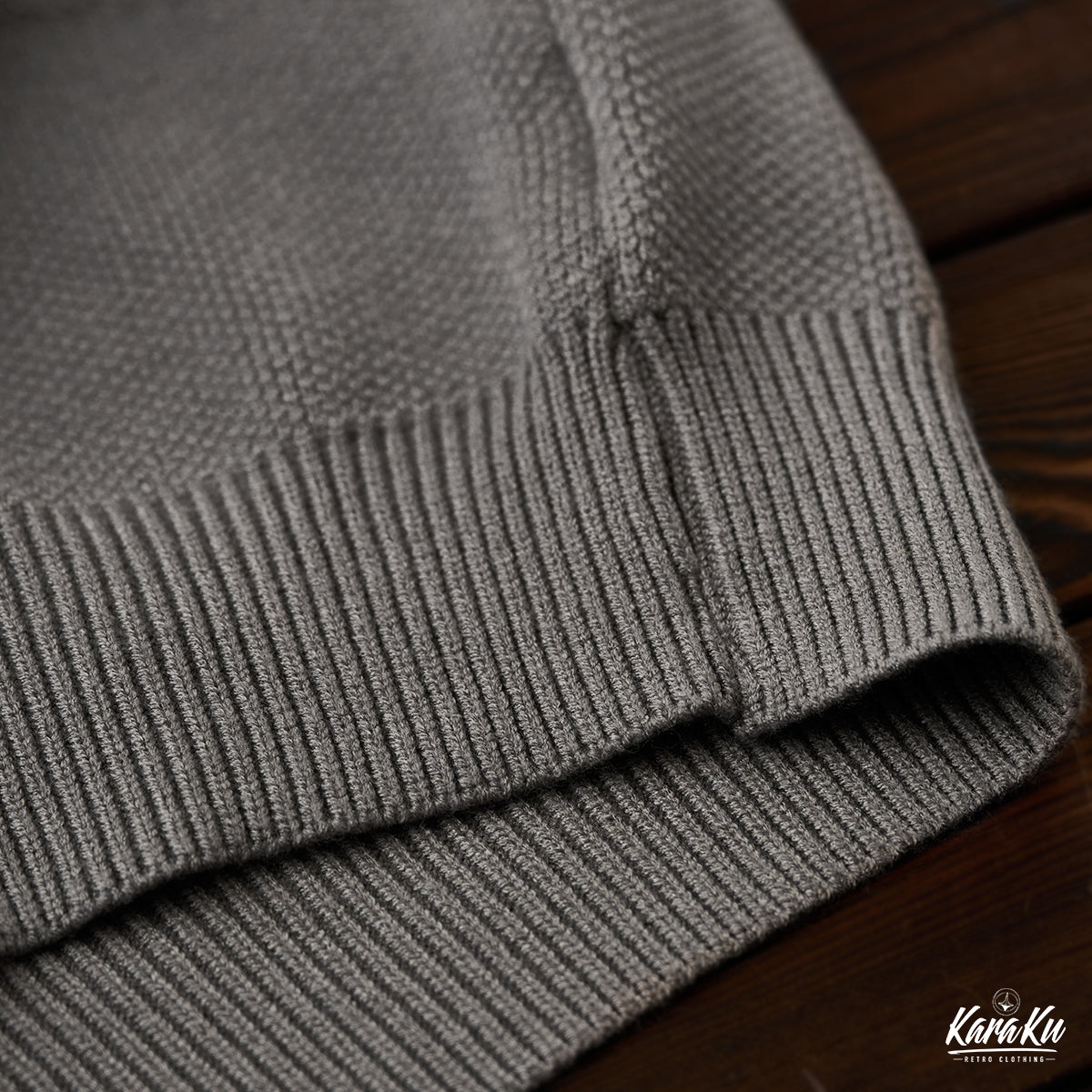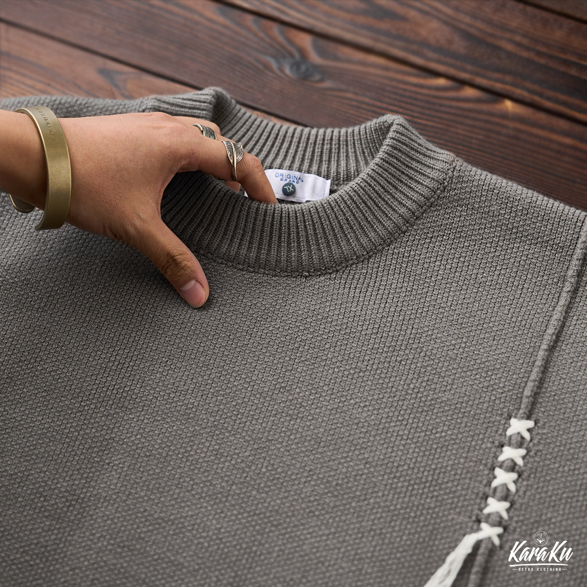 Sweater rajut leher krew yang telah dibongkar dengan jahitan warna