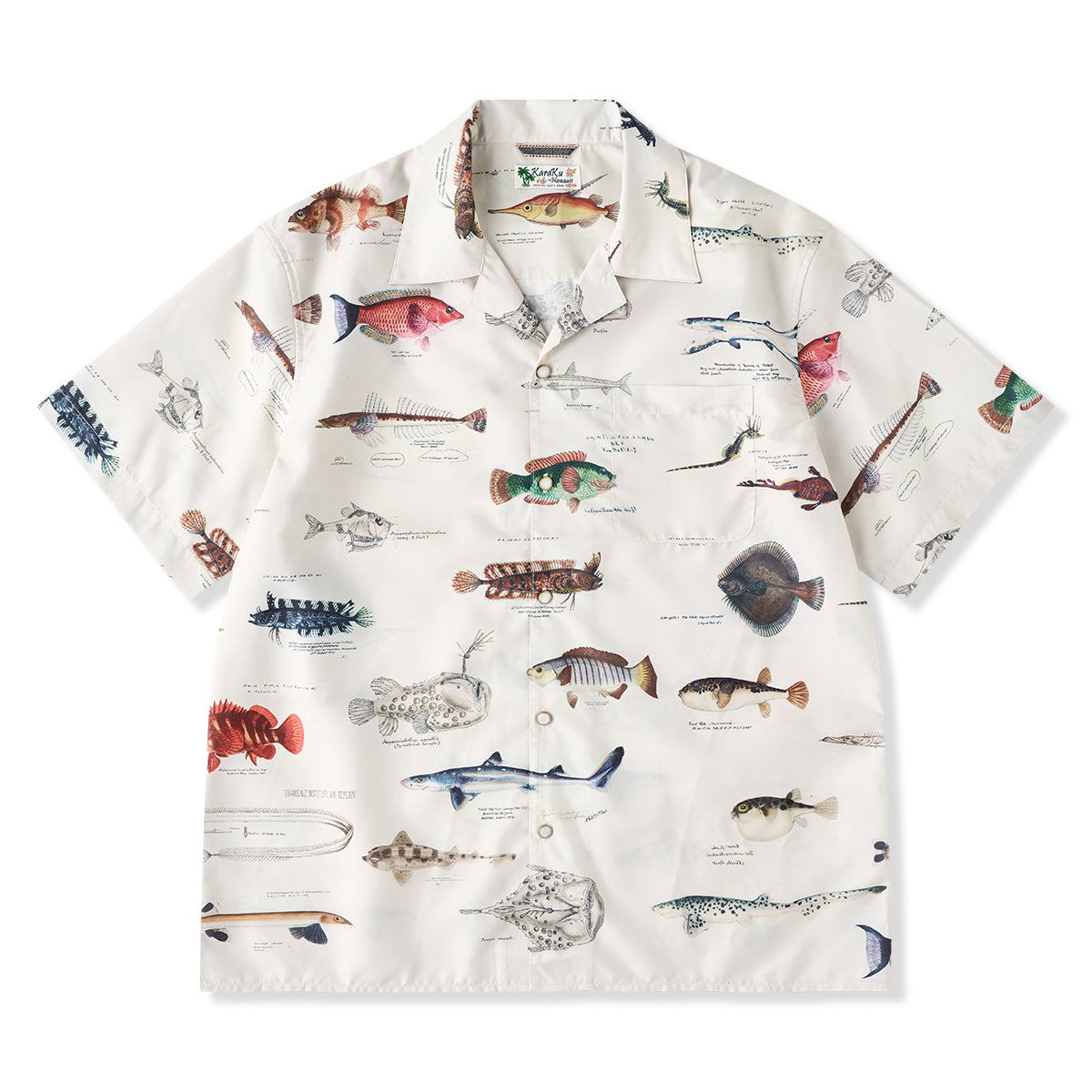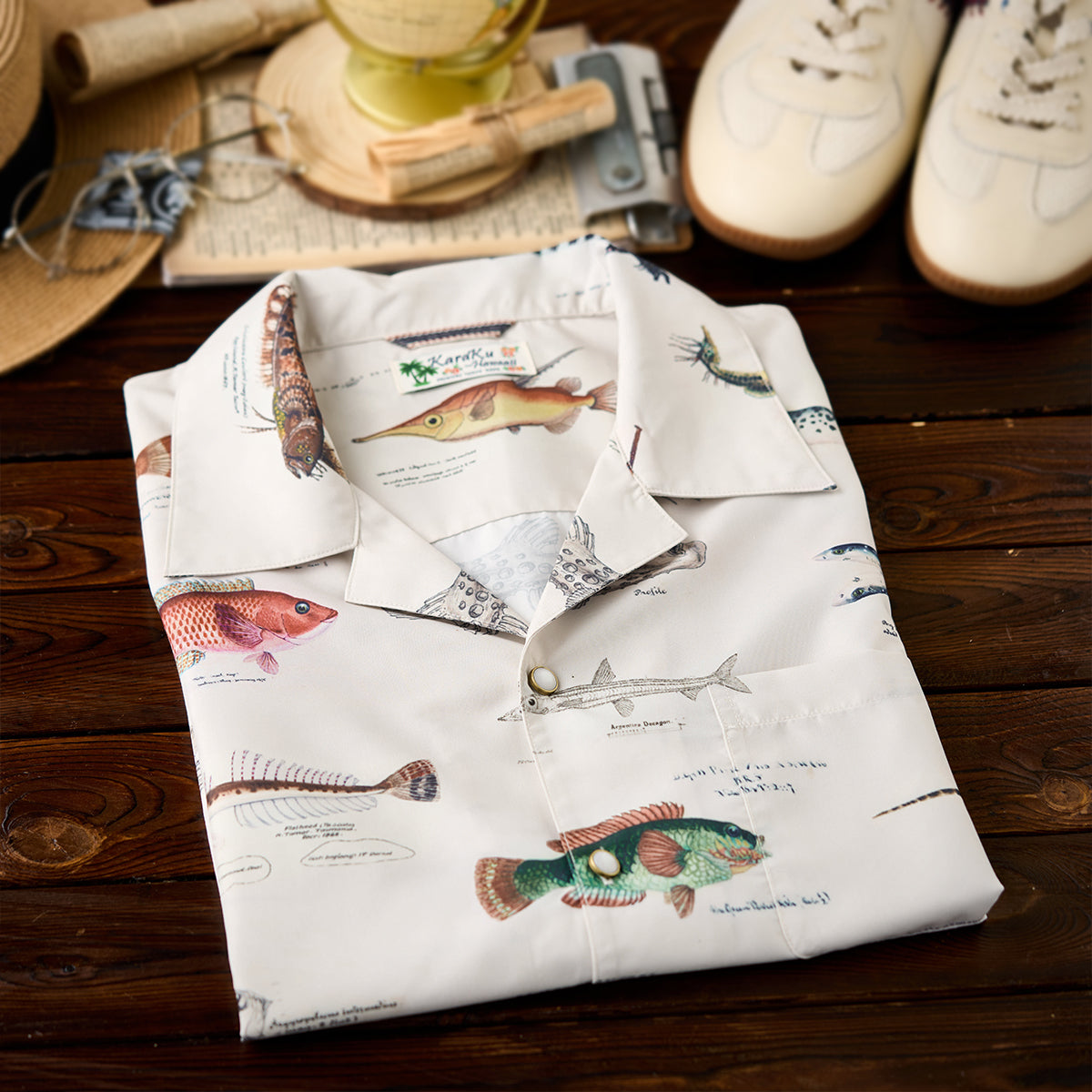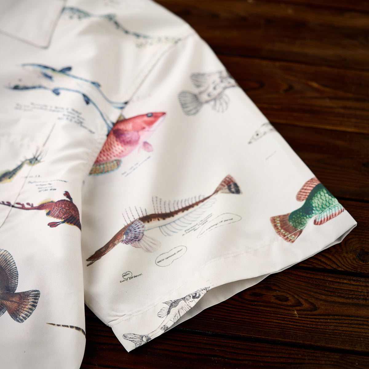 「博物図鑑・深海魚」総柄 パール調ボタン付きオープンカラーシャツ