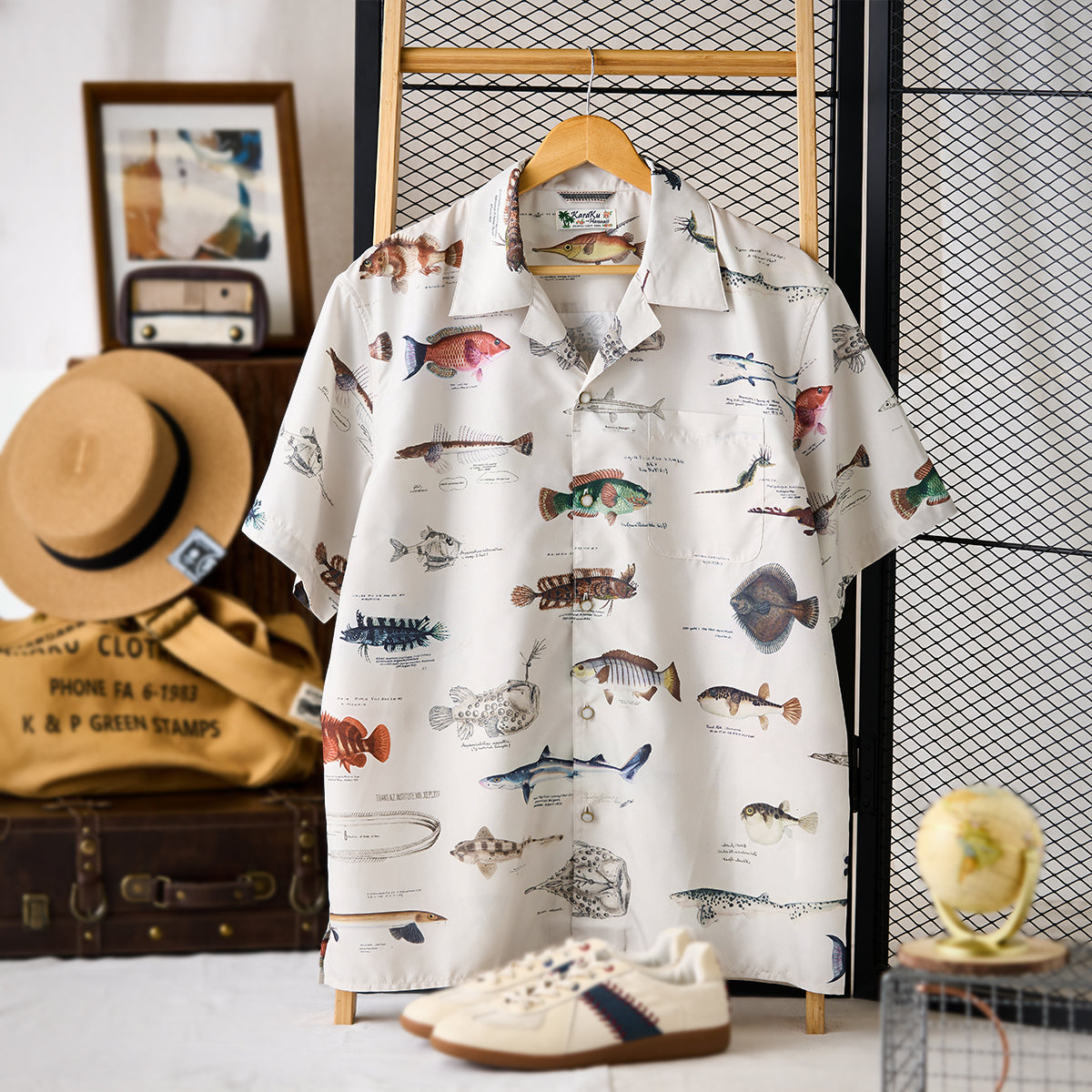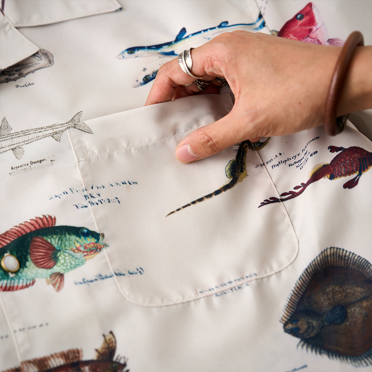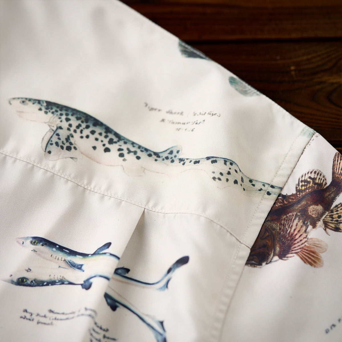 「博物図鑑・深海魚」総柄 パール調ボタン付きオープンカラーシャツ