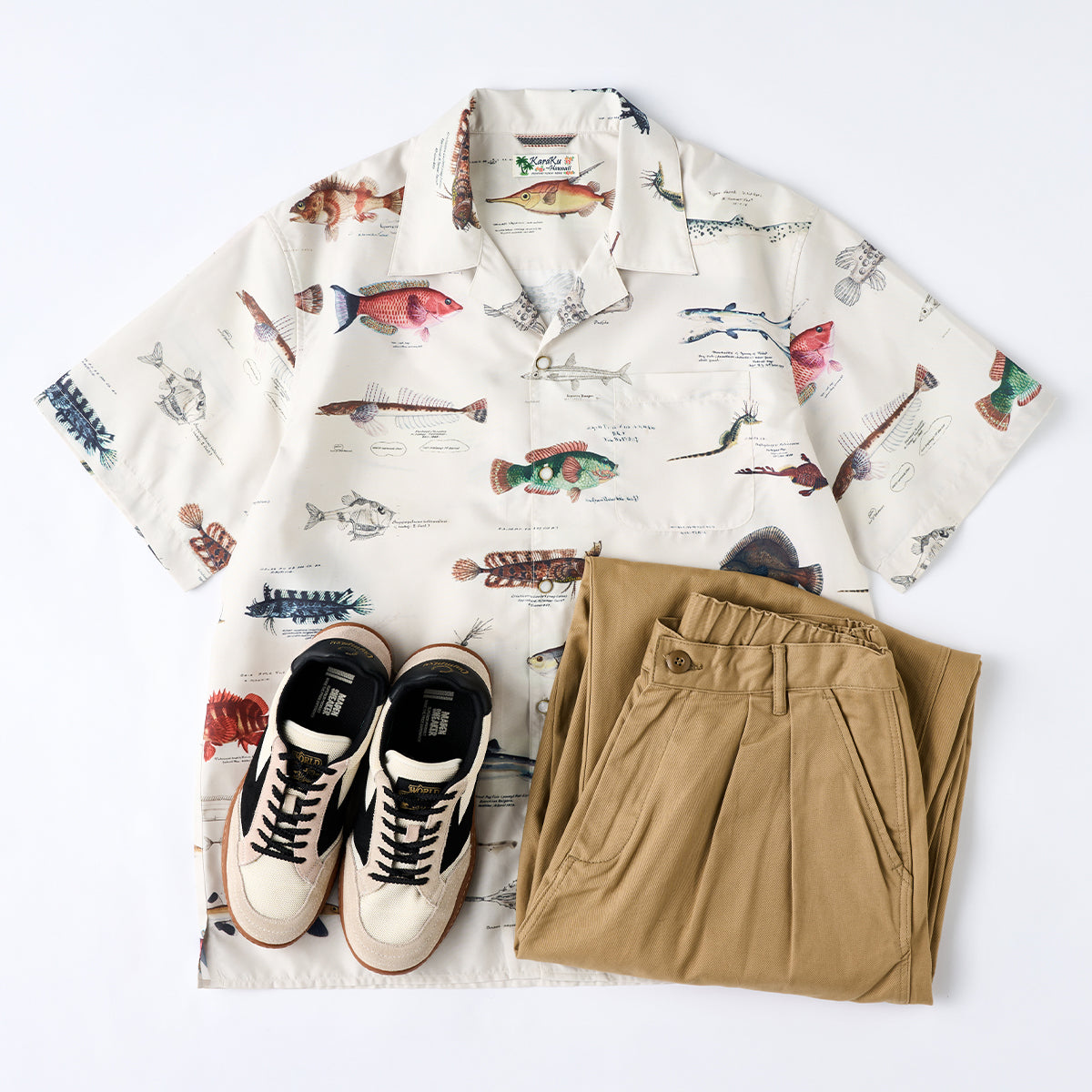 一見派手な総柄ながら、内容は非常に学術的。自然史博物館や図鑑を愛する層への訴求力が高い。チノパンやスリムフィットのパンツと合わせ、街中でも着用可能なスタイルに。スニーカーやローファーでモダンな印象をプラス。