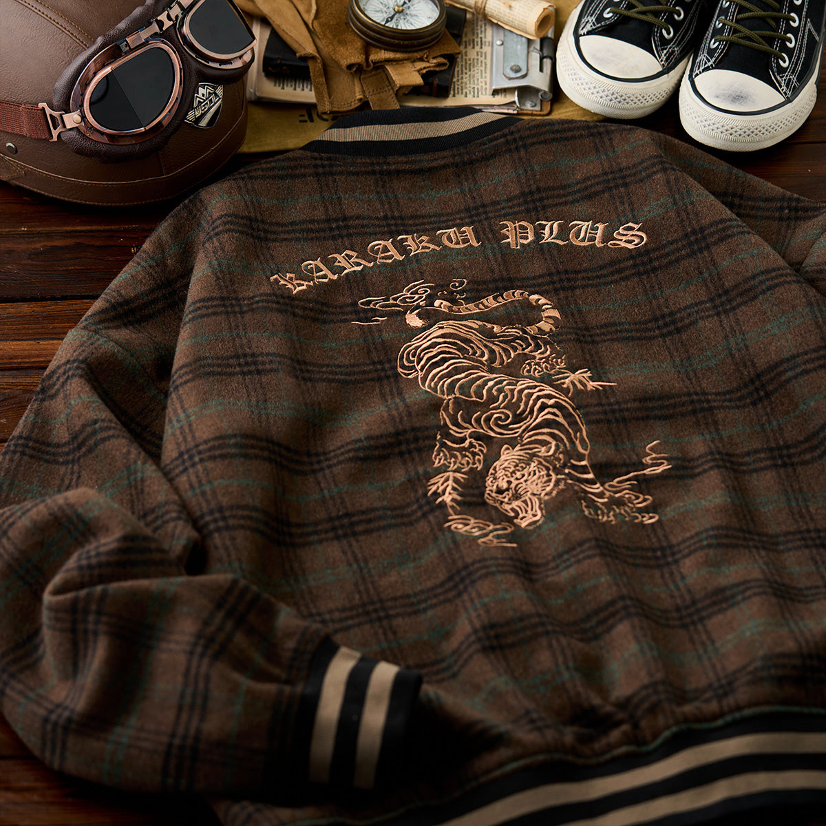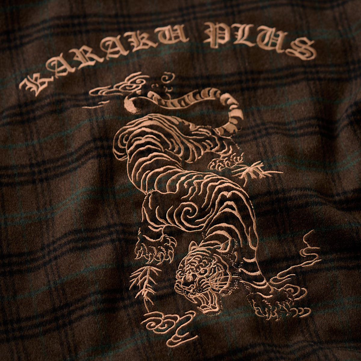 左胸元の刺繍は虎の顔が中央に配置され、その周囲に竹の葉や「KARAKU PLUS」の文字が刺繍されている。背中全面にわたる大きな虎の刺繍は、力強い動きのあるポーズが特徴で、ダイナミックなデザイン。