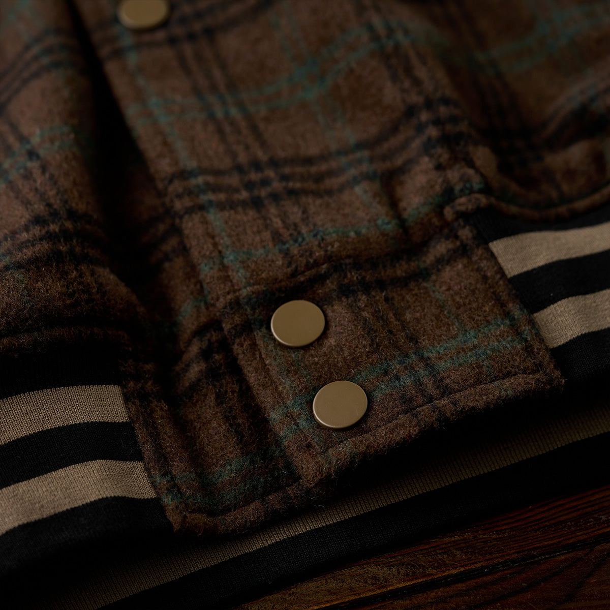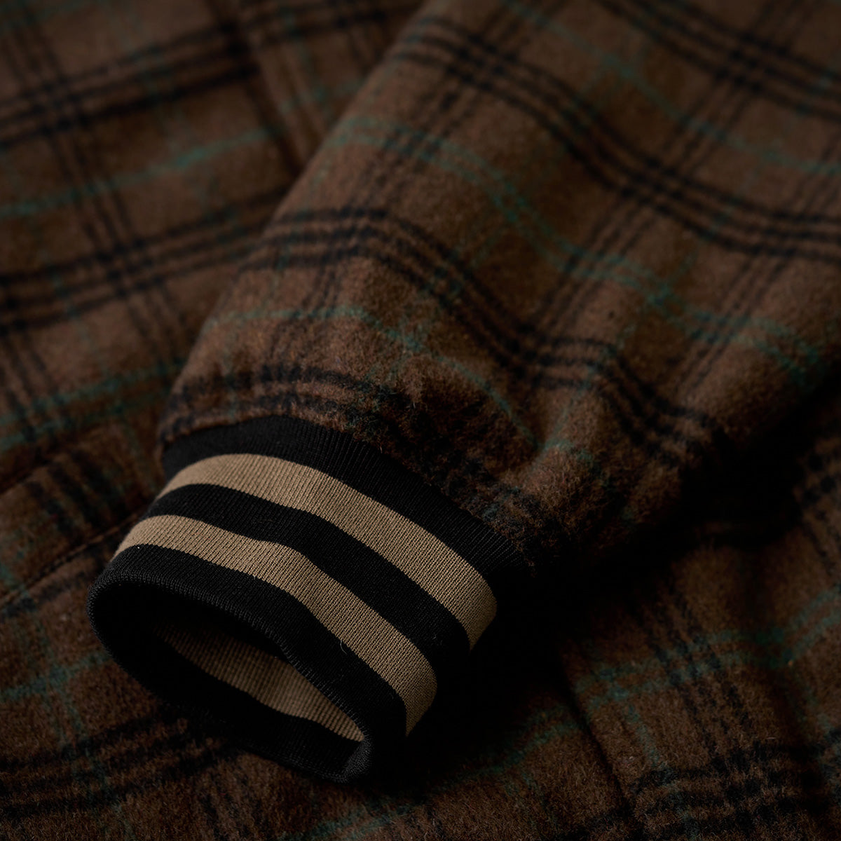 袖口、裾、襟元のリブはベージュとブラックのボーダーで構成されて、スポーティな要素を加えつつ、全体のデザインを引き締める役割を果たしている。
