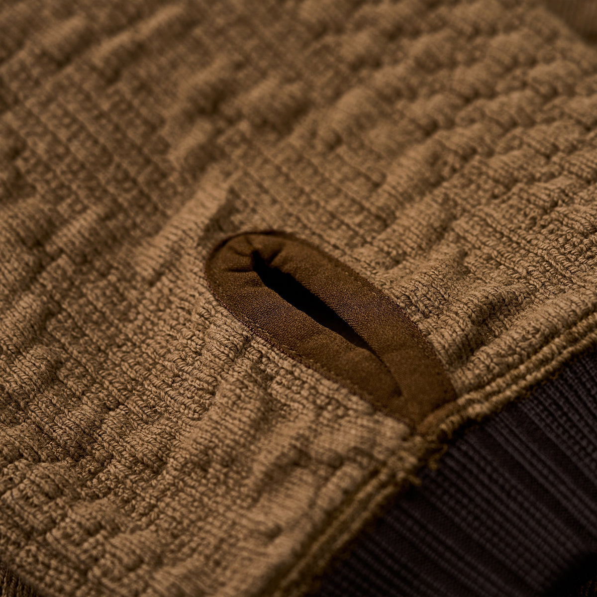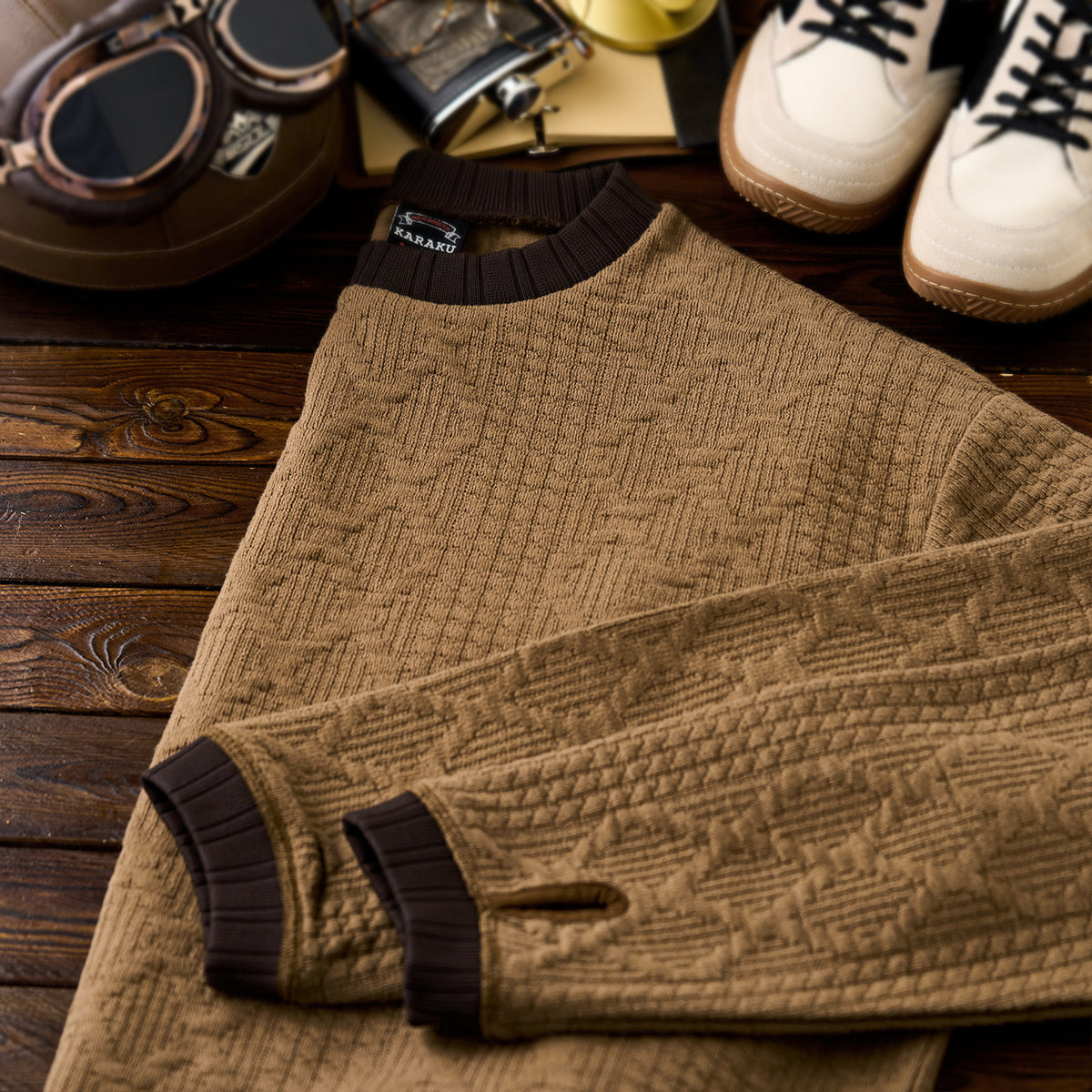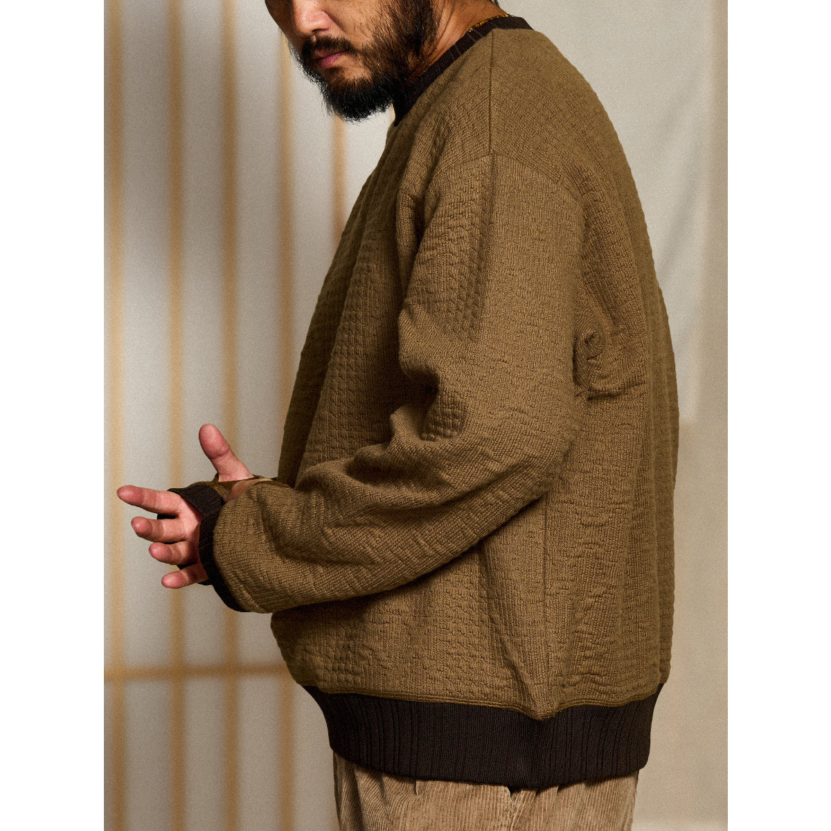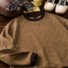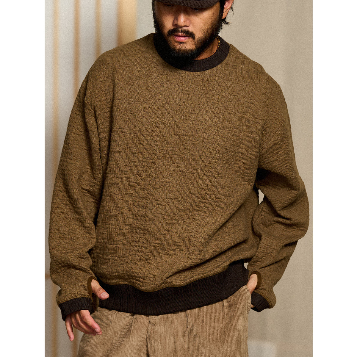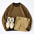 ケーブル編みニットを思わせる立体感のある編地を、スウェット素材で表現した一着。柔らかな着心地と扱いやすさを兼ね備え、デイリーに取り入れやすいデザインです。襟や裾に施した配色切替がアクセントとなり、シンプルながらもスタイリングに変化を加えてくれます。袖先にはサムホールを備え、アウトドアやアクティブなシーンにも快適に対応。ニットライクな表情とスウェットならではの実用性を融合させた、秋冬シーズンに活躍する万能スウェットです。