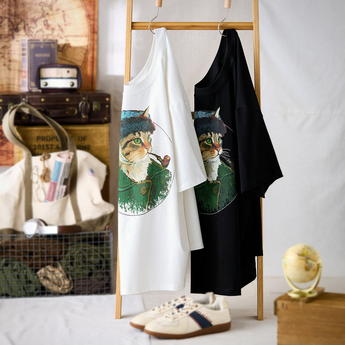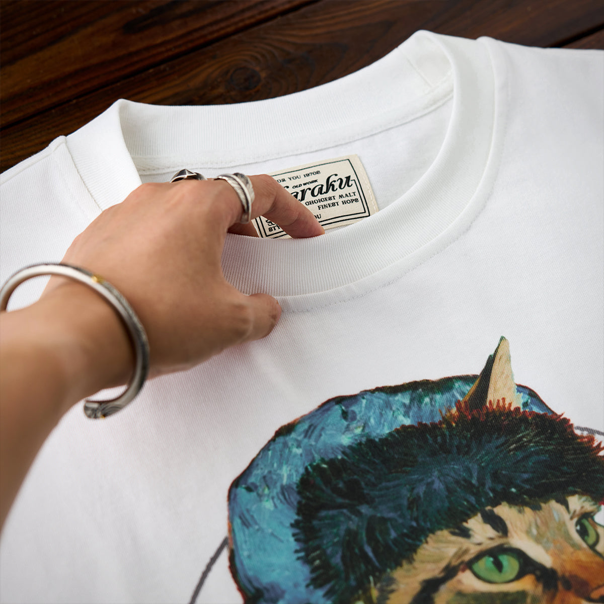 シンプルながら強烈なパロディ性があり、アートファンや猫好きの双方にアピール。カジュアルなスタイルにぴったり、日常はキャンバススニーカーと合わせても気軽に出掛けたくなります。