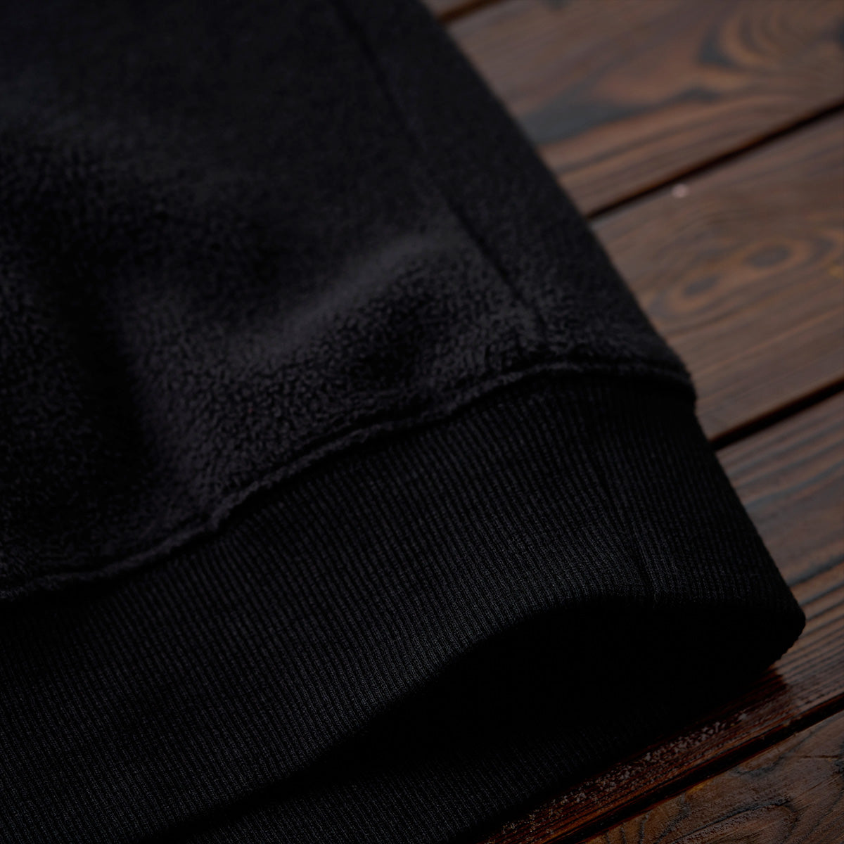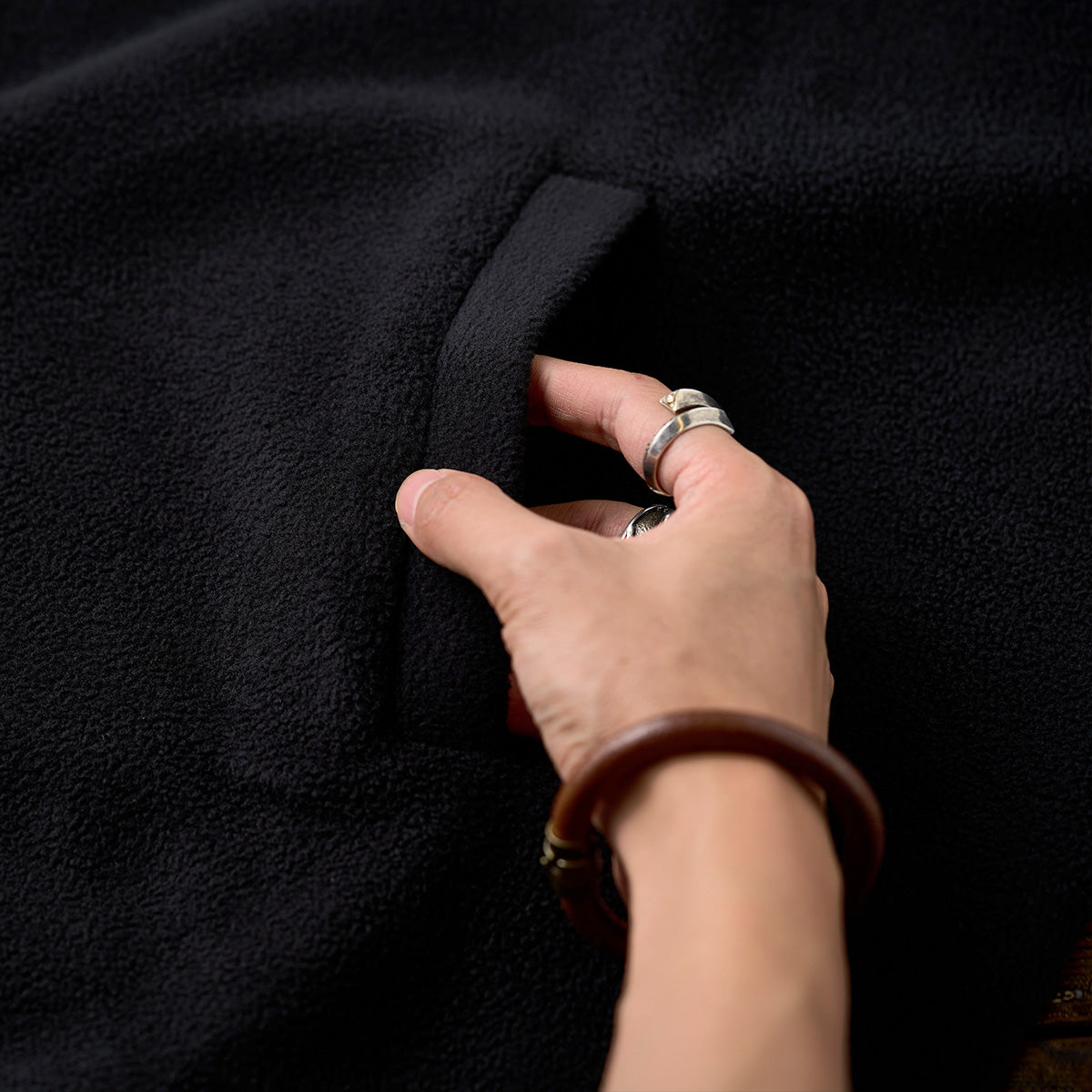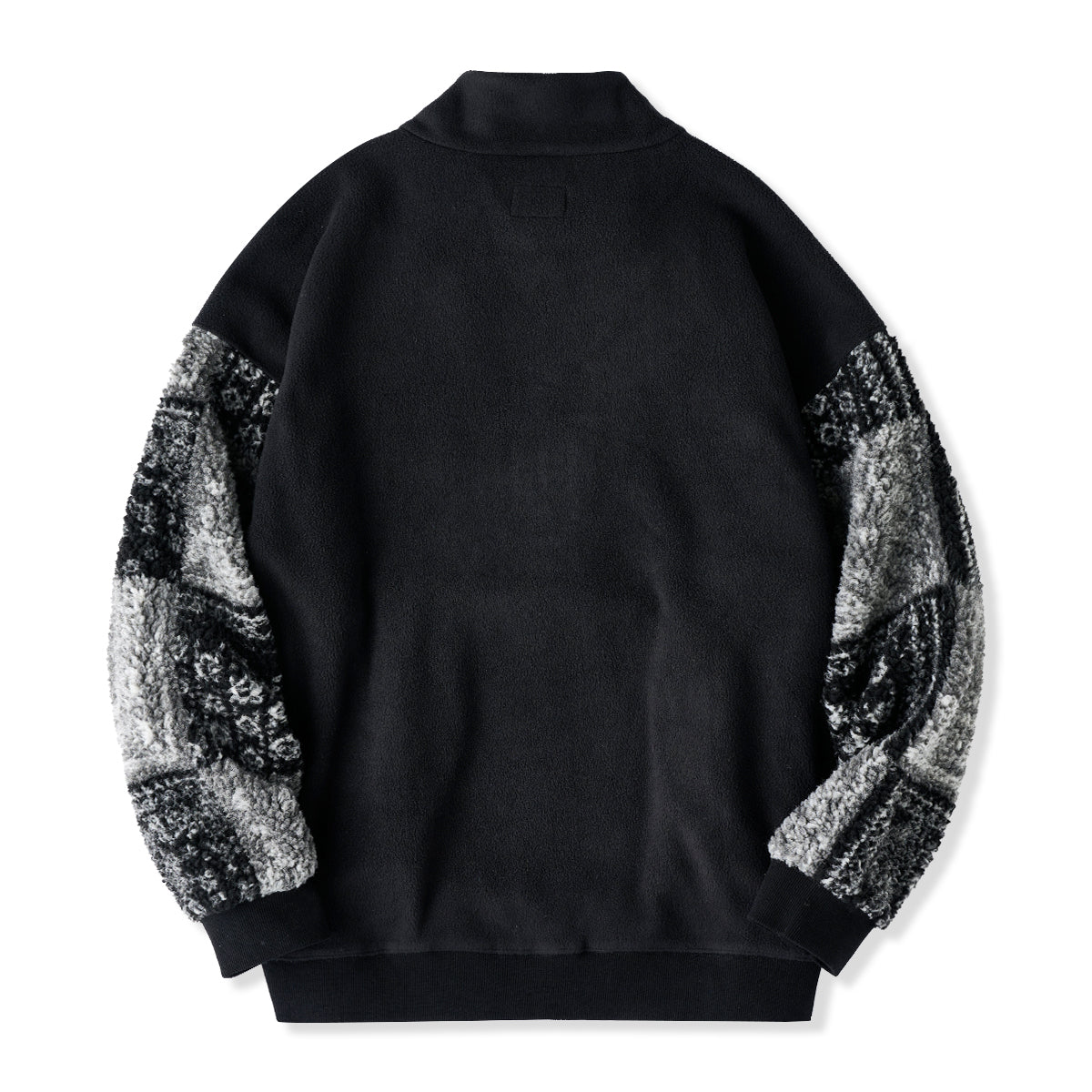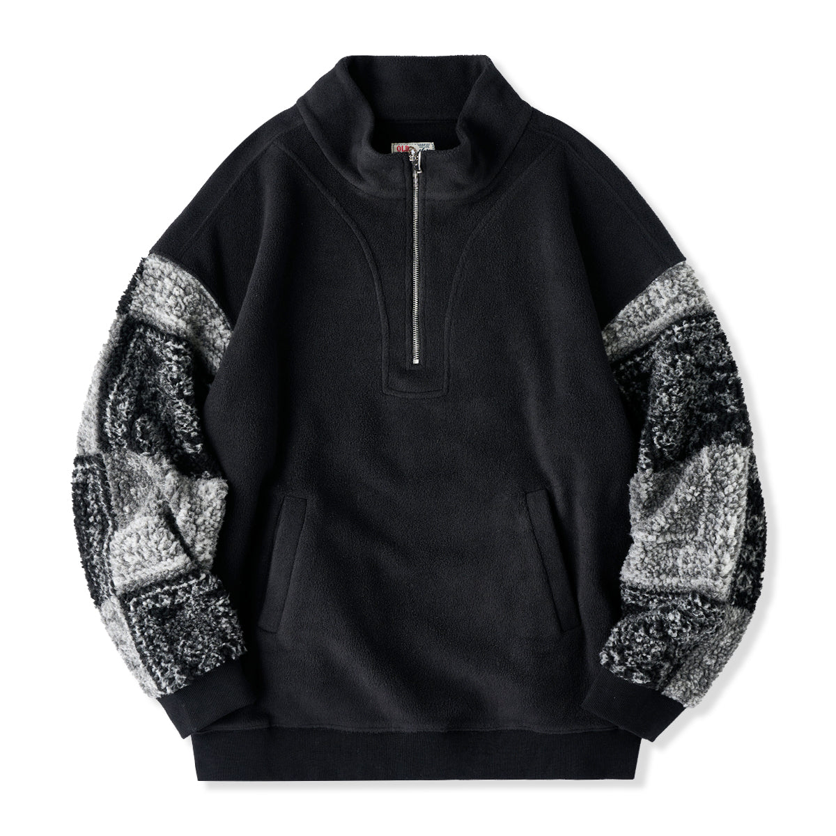 ボディ部分はフリース素材を使用して、保温性と軽量感が特徴。袖部分には白黒を基調としたペイズリー柄が施されて、ボア素材でデザインされています。この切替デザインにより、シンプルなフリースにアクセントが加えられています。