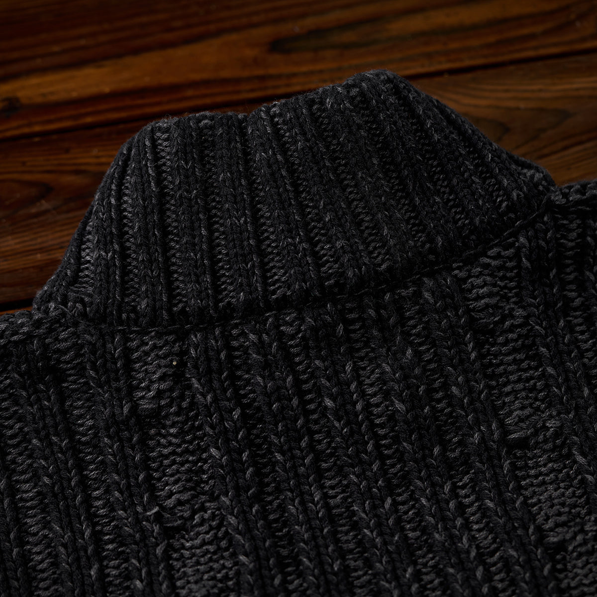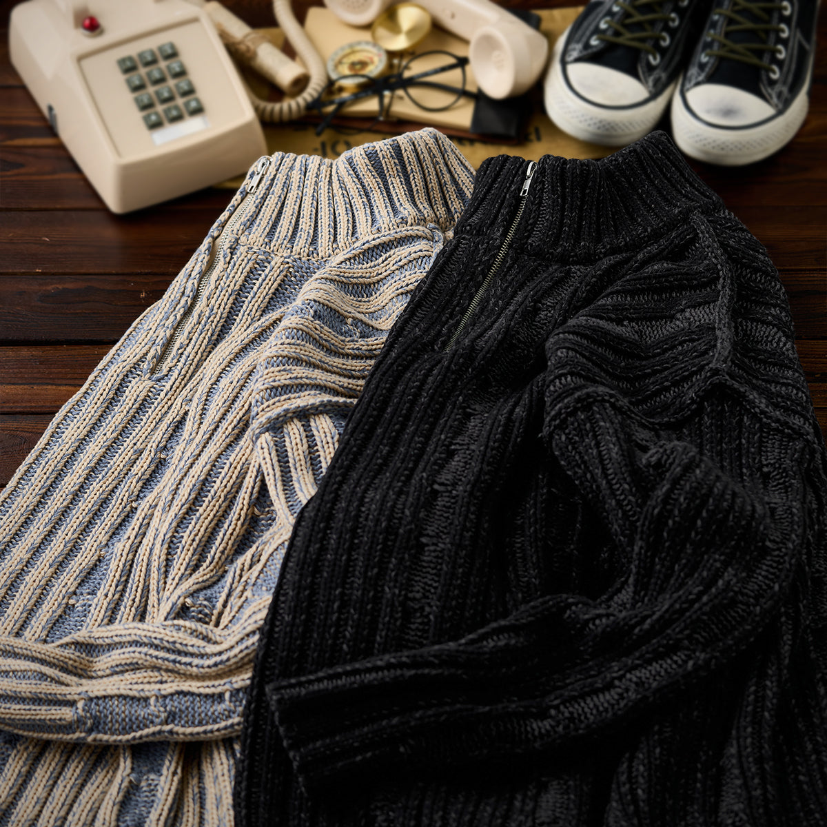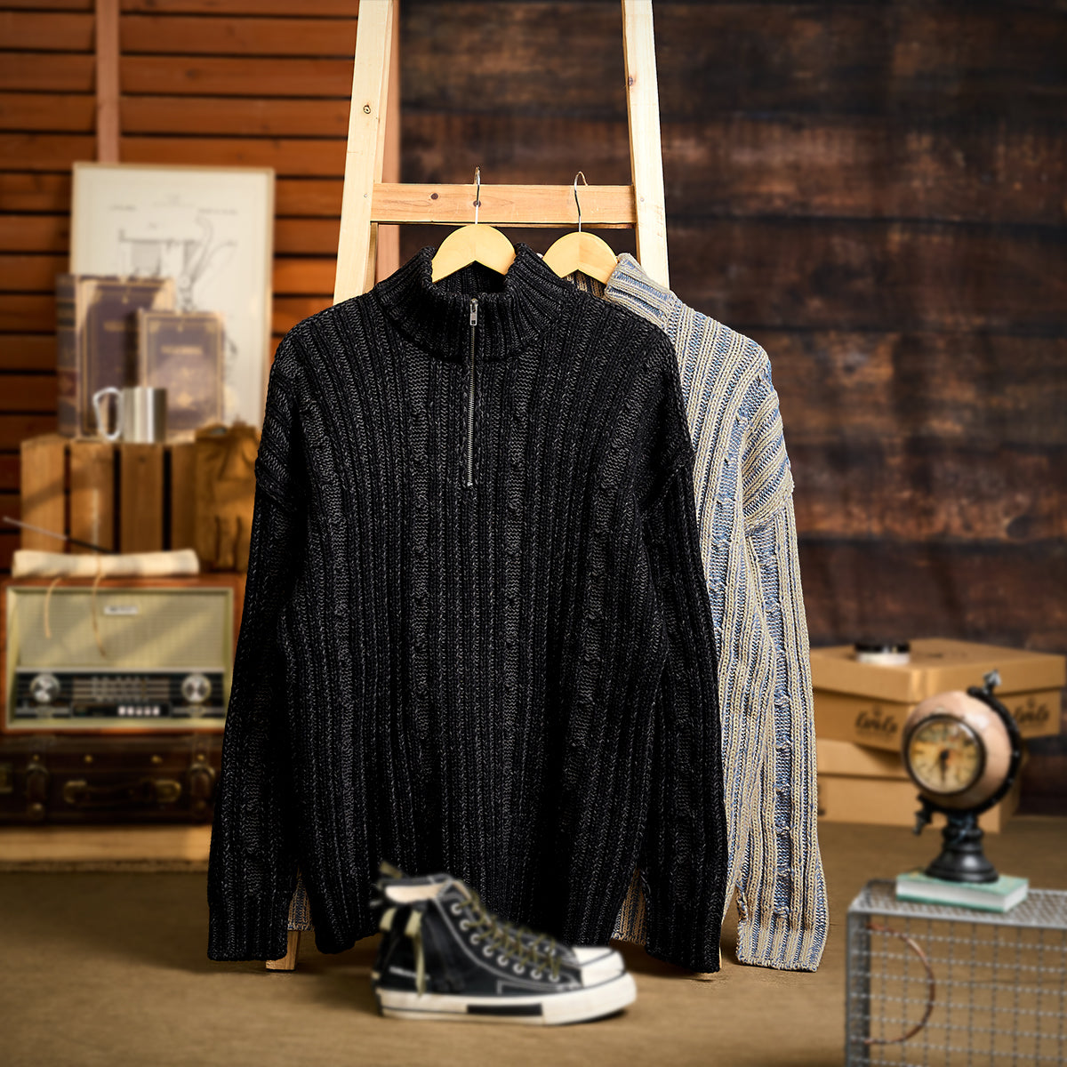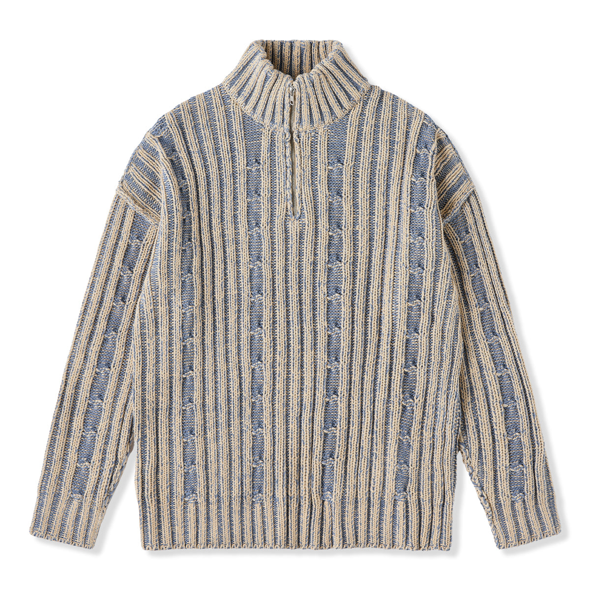 高めの襟が特徴で、首元をしっかり覆うデザインです。寒い季節の防寒性を高めると同時に、洗練された印象を与えます。ハーフジップ仕様で、機能性が高いです。袖口と裾はリブ編みで仕上げられて、伸縮性があるため着用時にフィットしやすい。ストライプの間に凹凸が生まれるような編み方が施されて、デザインに奥行きを与えています。特に、リブ編みの間に入るブルーの編み地がアクセントとなり、単調さを回避しています。2色が融合したミックス糸を使用して、自然なムラ感があり、ヴィンテージ感やクラシックな雰囲気が漂う仕上がりになっています。