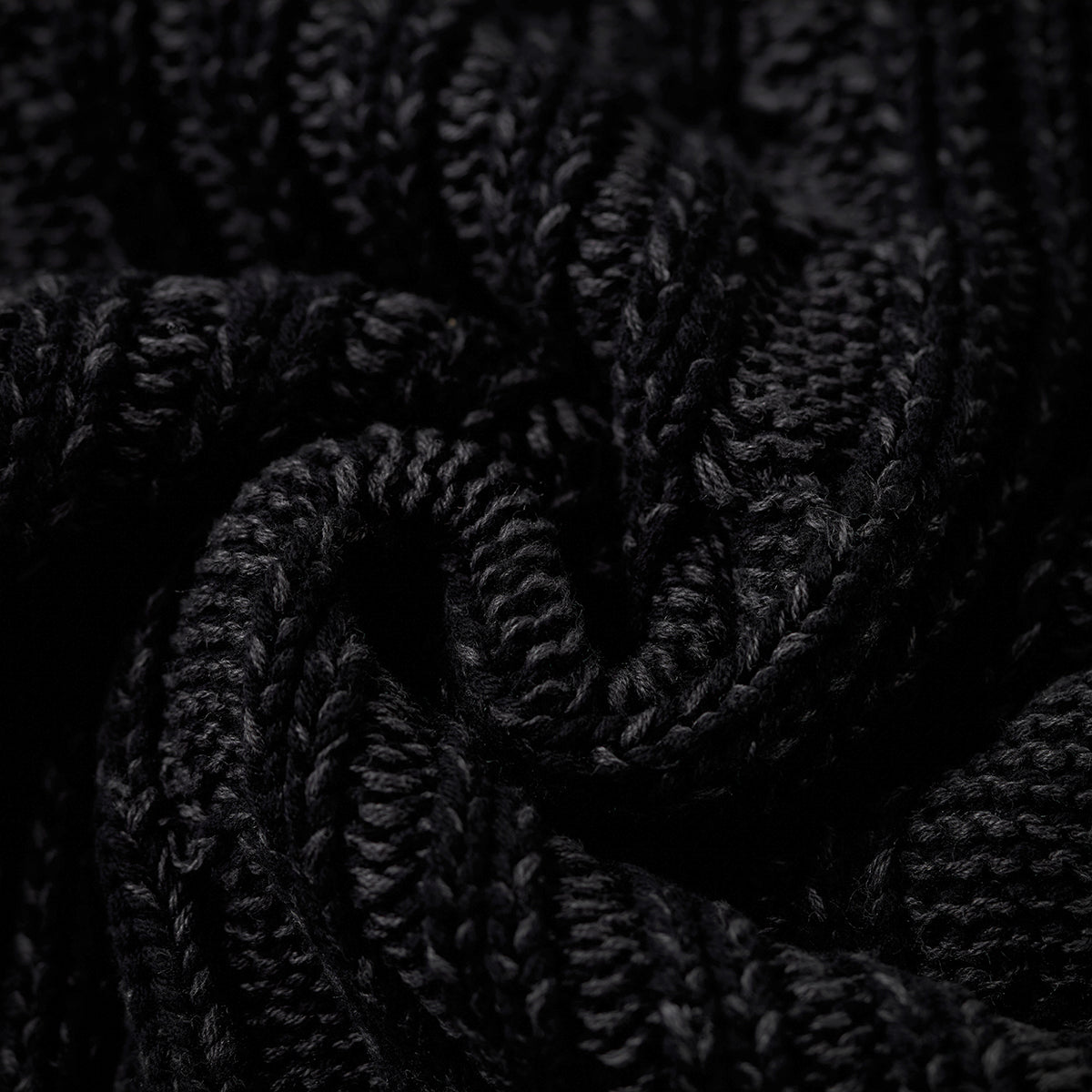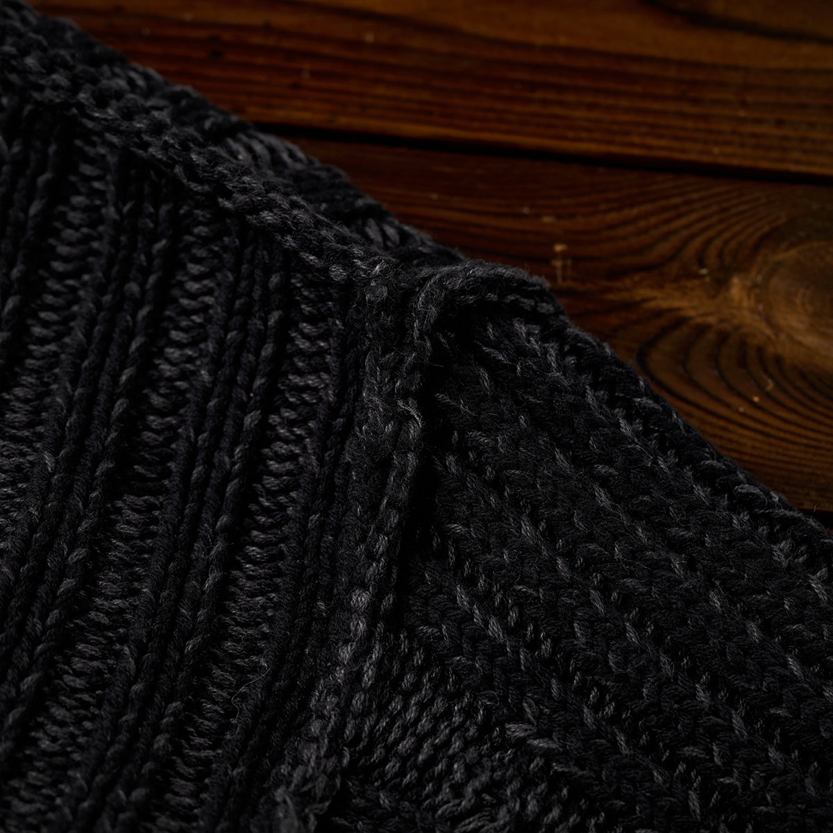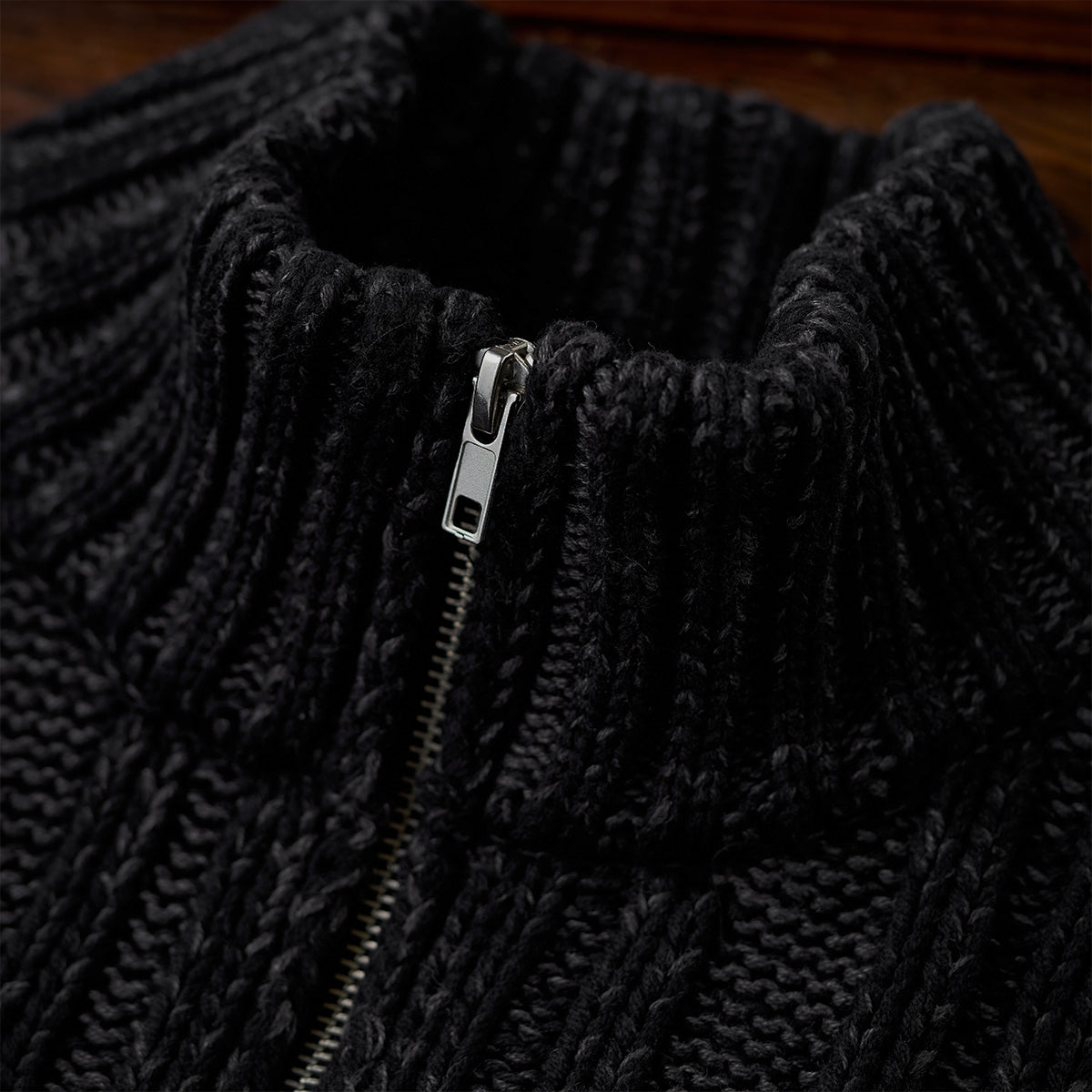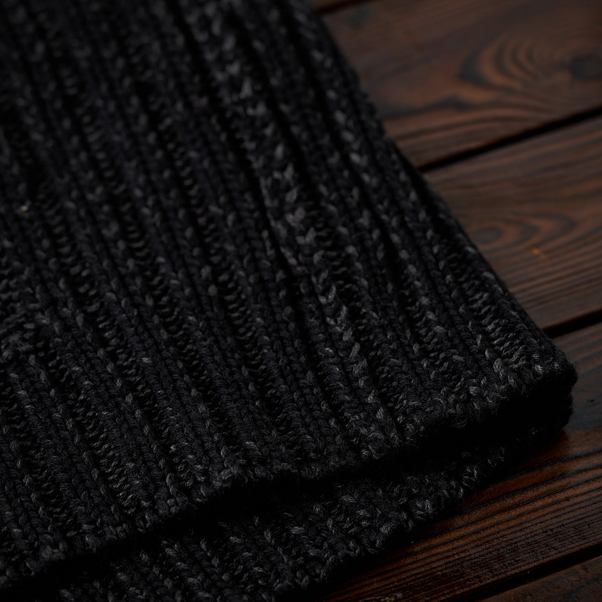 高めの襟が特徴で、首元をしっかり覆うデザインです。寒い季節の防寒性を高めると同時に、洗練された印象を与えます。ハーフジップ仕様で、機能性が高いです。袖口と裾はリブ編みで仕上げられて、伸縮性があるため着用時にフィットしやすい。ストライプの間に凹凸が生まれるような編み方が施されて、デザインに奥行きを与えています。特に、リブ編みの間に入るブルーの編み地がアクセントとなり、単調さを回避しています。2色が融合したミックス糸を使用して、自然なムラ感があり、ヴィンテージ感やクラシックな雰囲気が漂う仕上がりになっています。