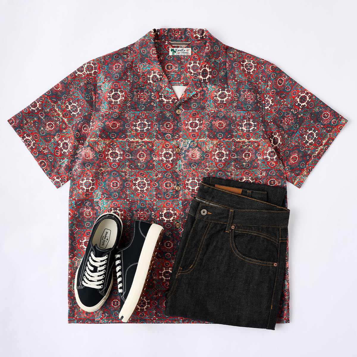 デニムやショートパンツ、サンダルと合わせることで、リラックスしたカジュアルスタイルが完成します。無地のホワイトやベージュのパンツと合わせ、シャツの柄を際立たせます。