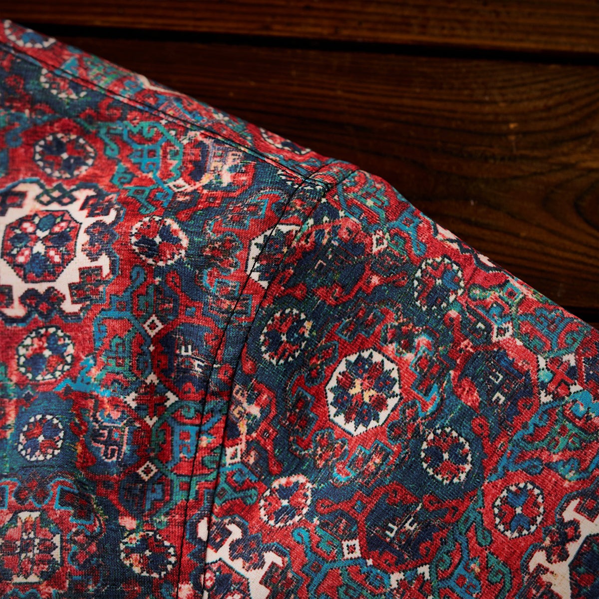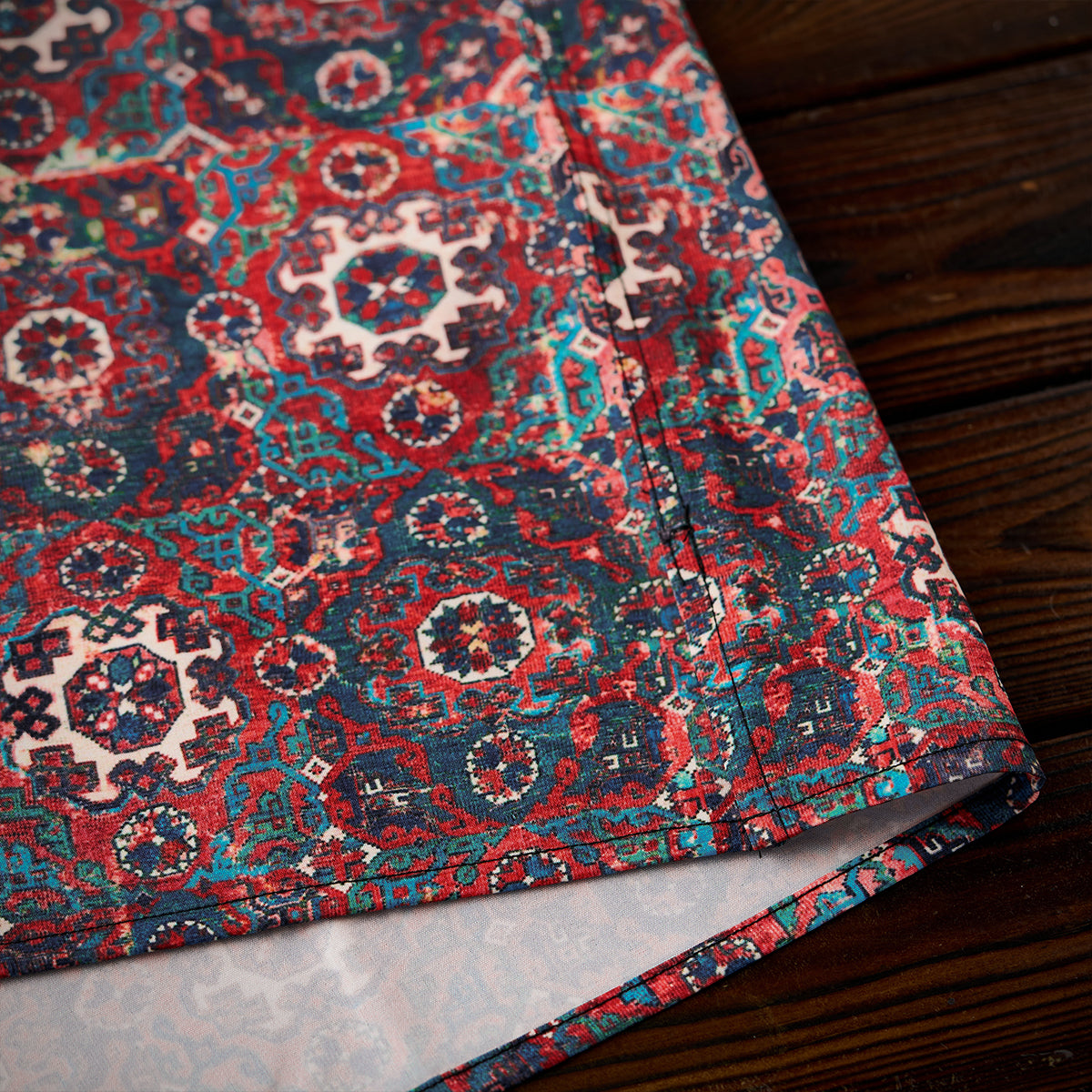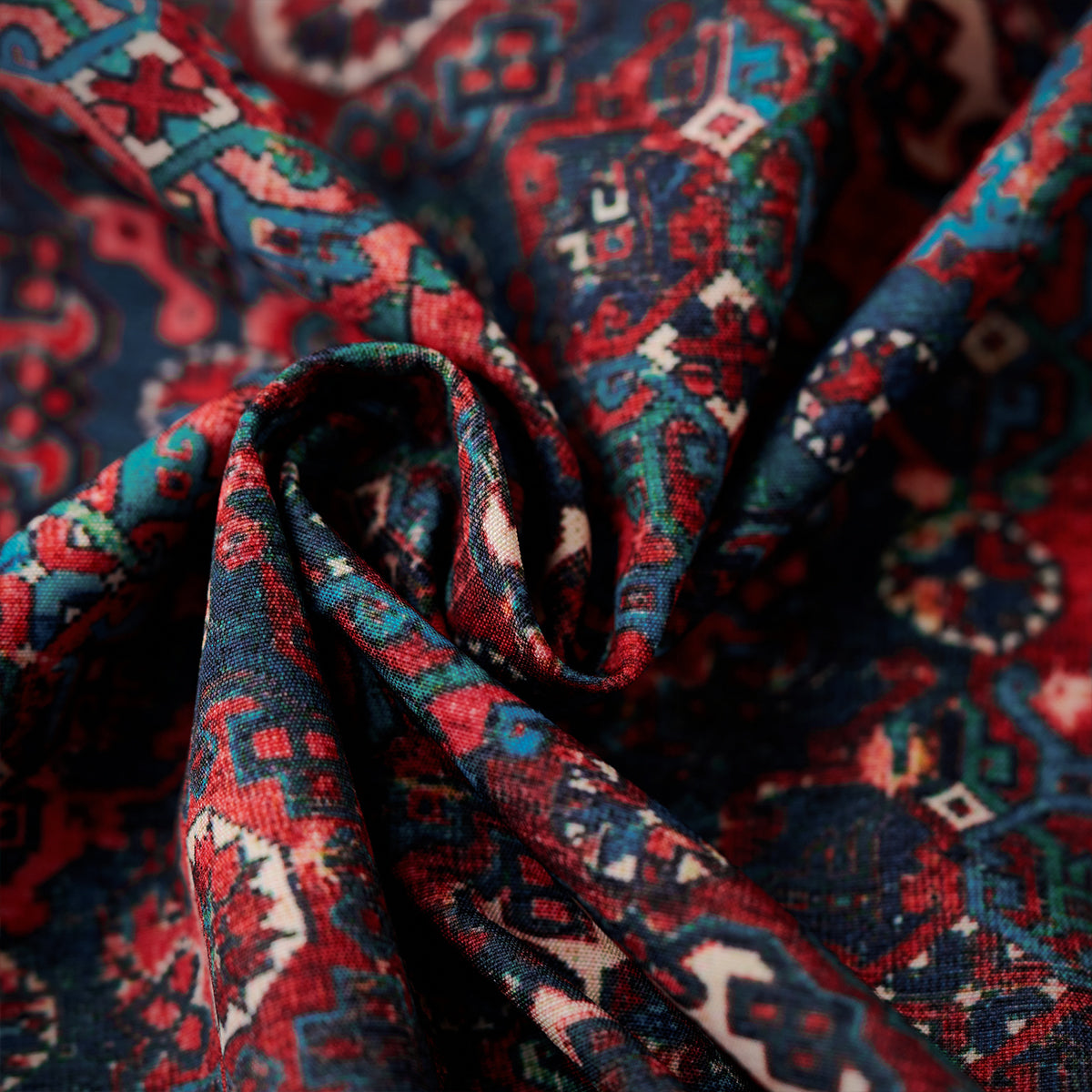 ペルシャエスニック調の伝統的な幾何学模様が、総柄として使用されています。模様はシンメトリックで、細部まで非常に緻密なデザインが施されています。中央に円形モチーフが配され、それを囲むように花や植物のような装飾が見られます。