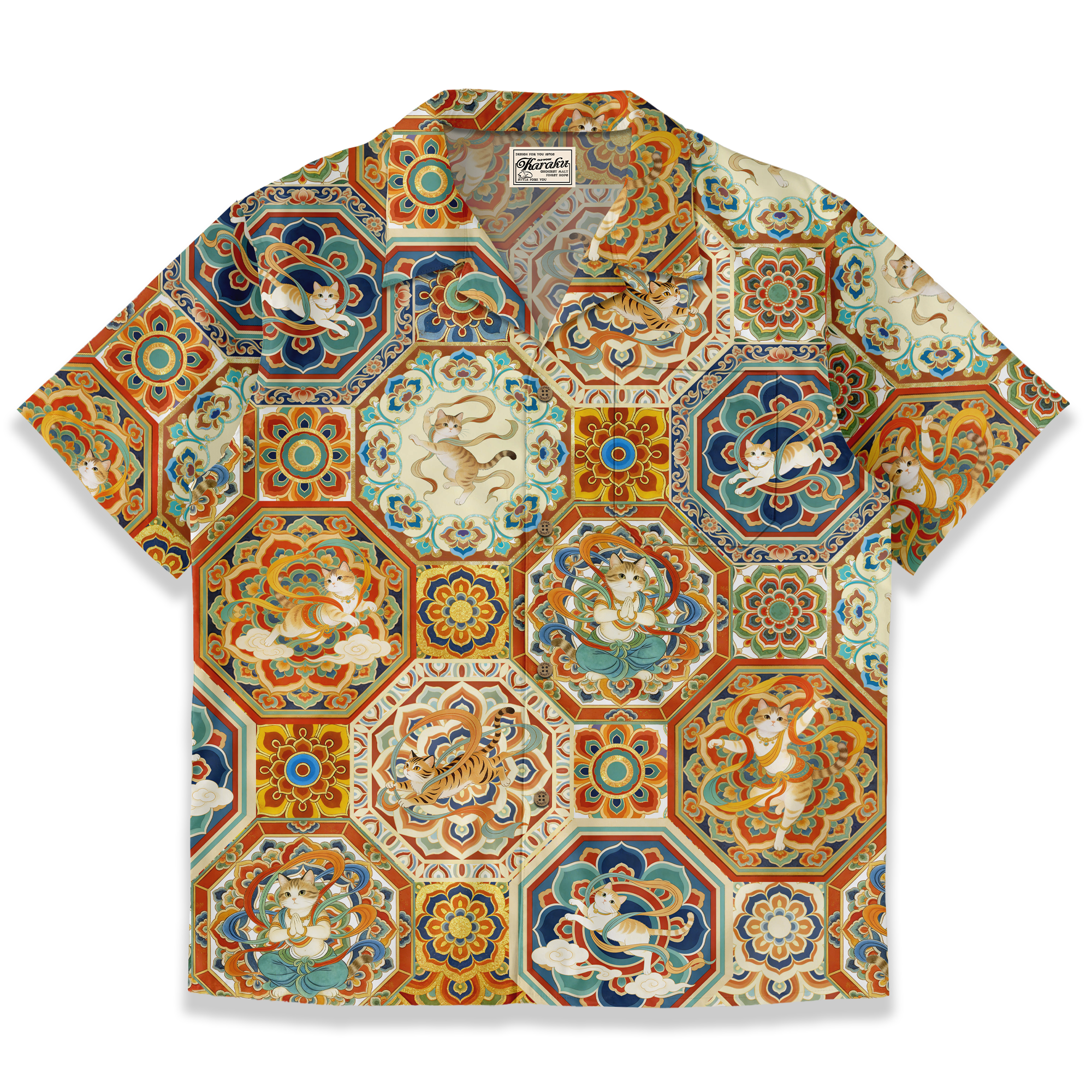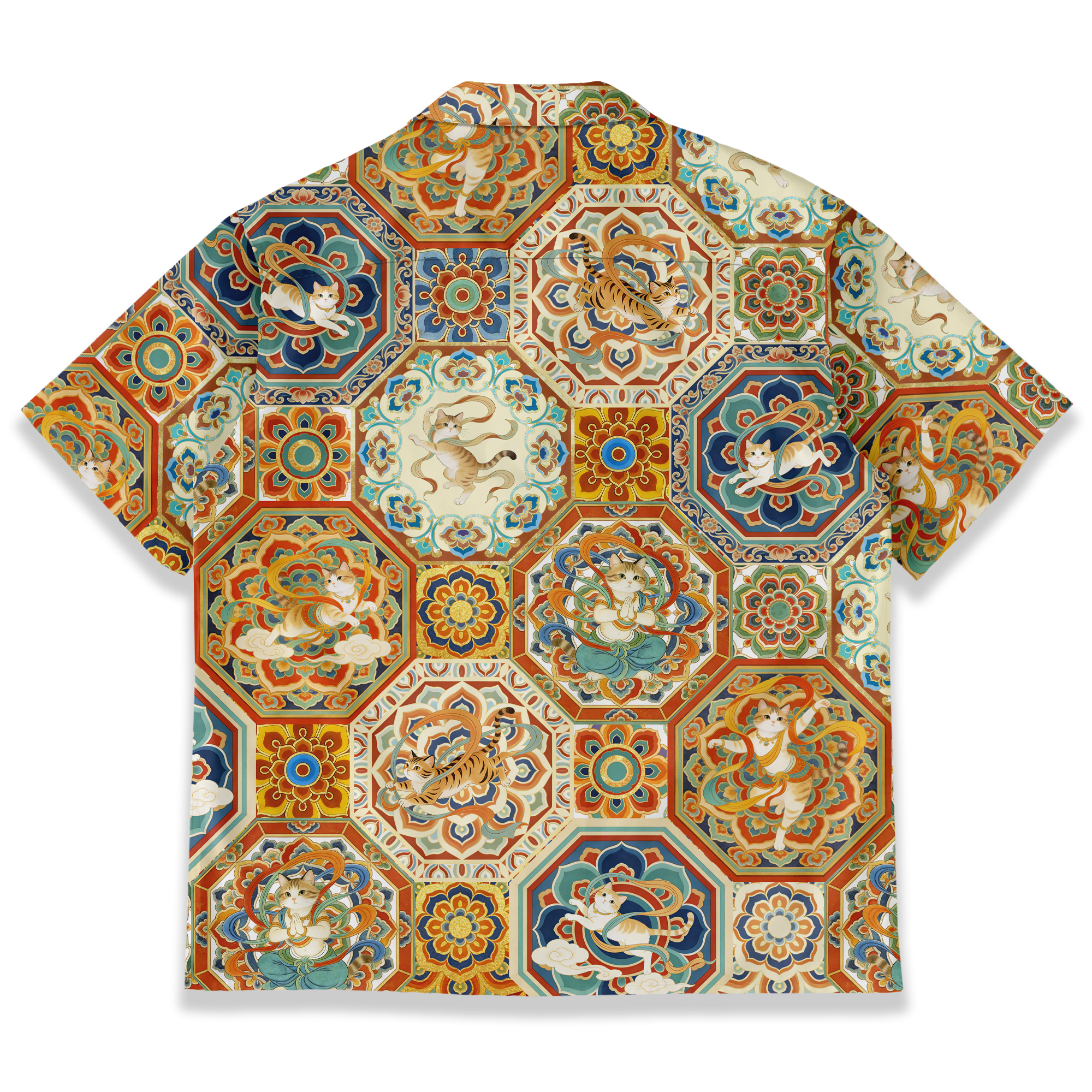 敦煌壁画の代表的なモチーフである「飛天」が、このシャツの猫たちに投影されています。猫を主題に置き換えることで、現代的でユーモラスなアプローチを加えています。飛天は、仏教経典を守護する天界の存在で、しなやかで優美な姿勢で天を舞う姿が特徴です。このシャツでは、飛天のようなリボン状の装飾が猫の周囲を舞っており、仏教美術の優雅な雰囲気を見事に再現しています。暖色系の赤や橙、黄色は、敦煌壁画の風化したけれども鮮やかさを残す色調を彷彿とさせます。