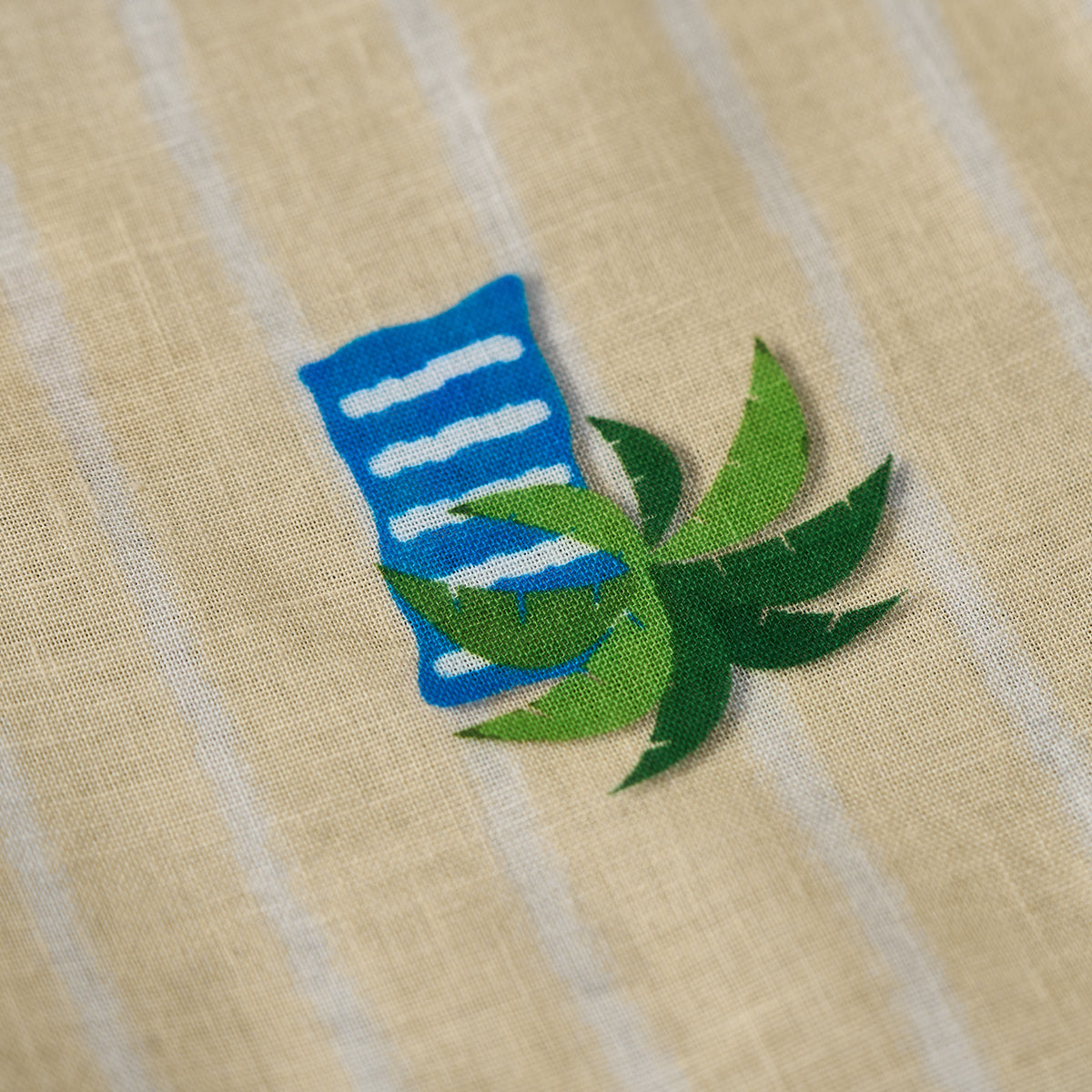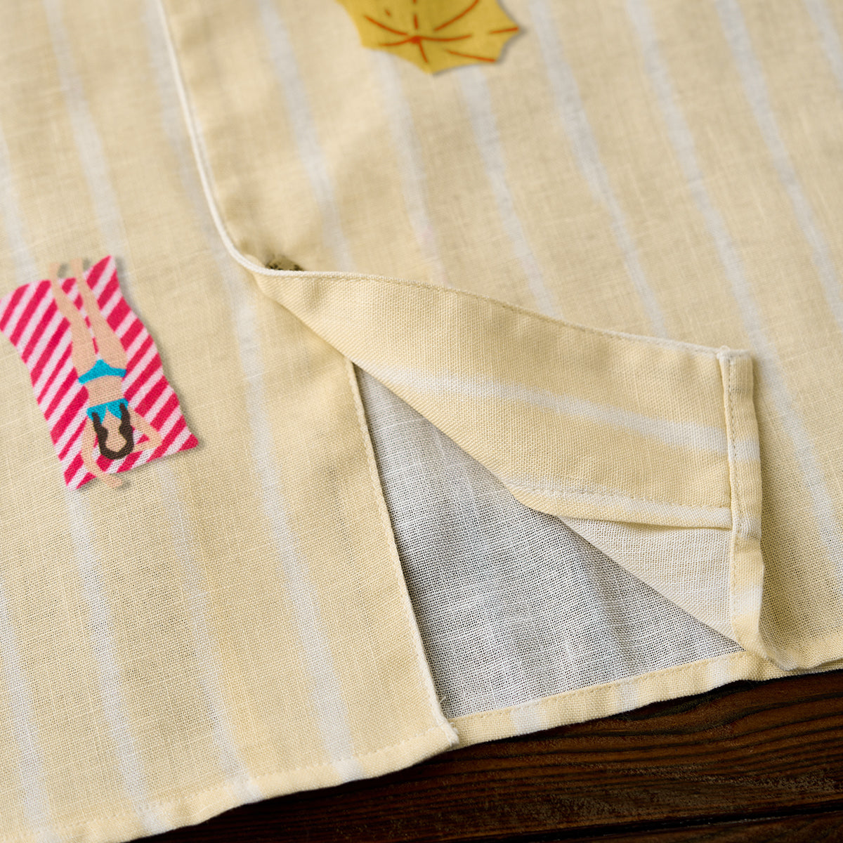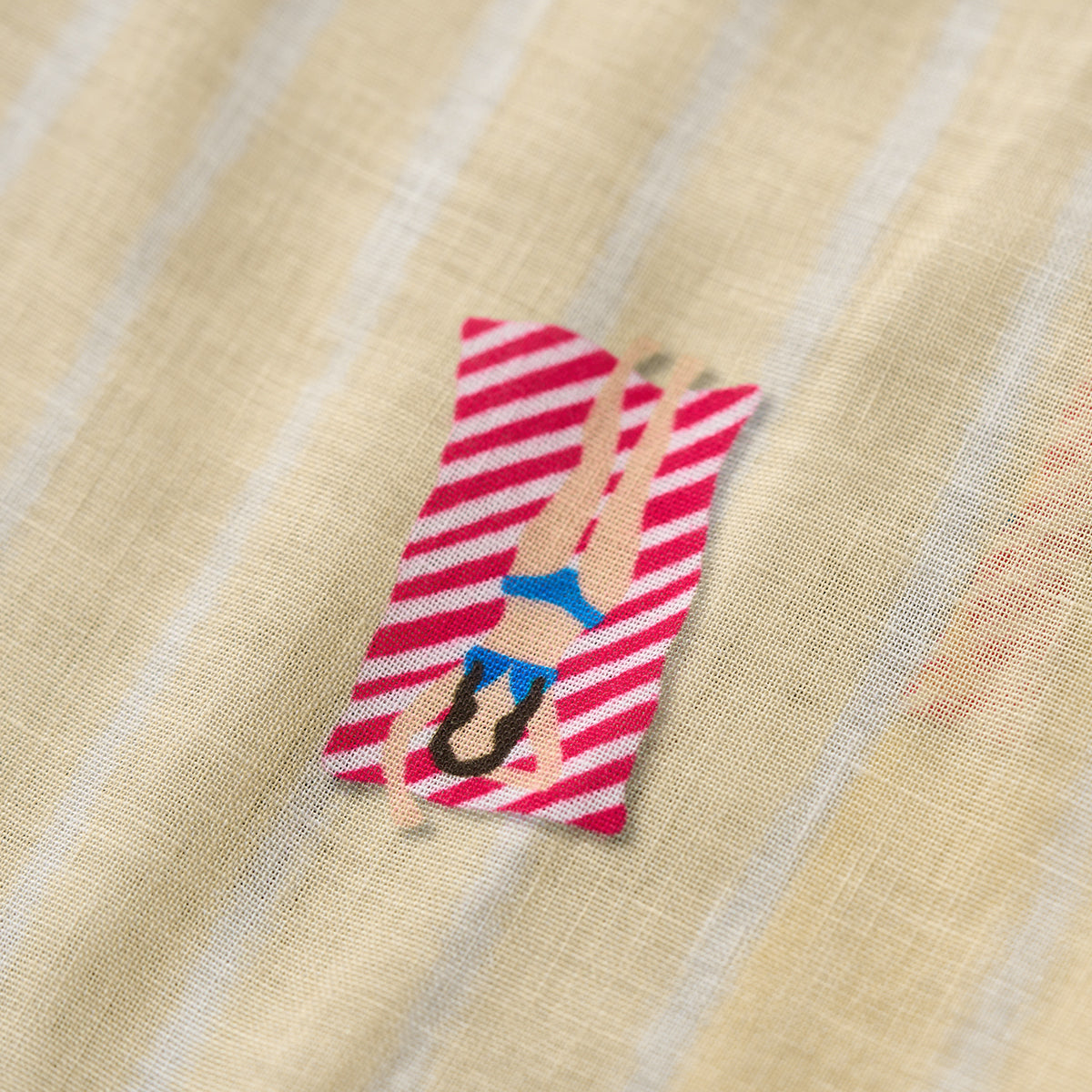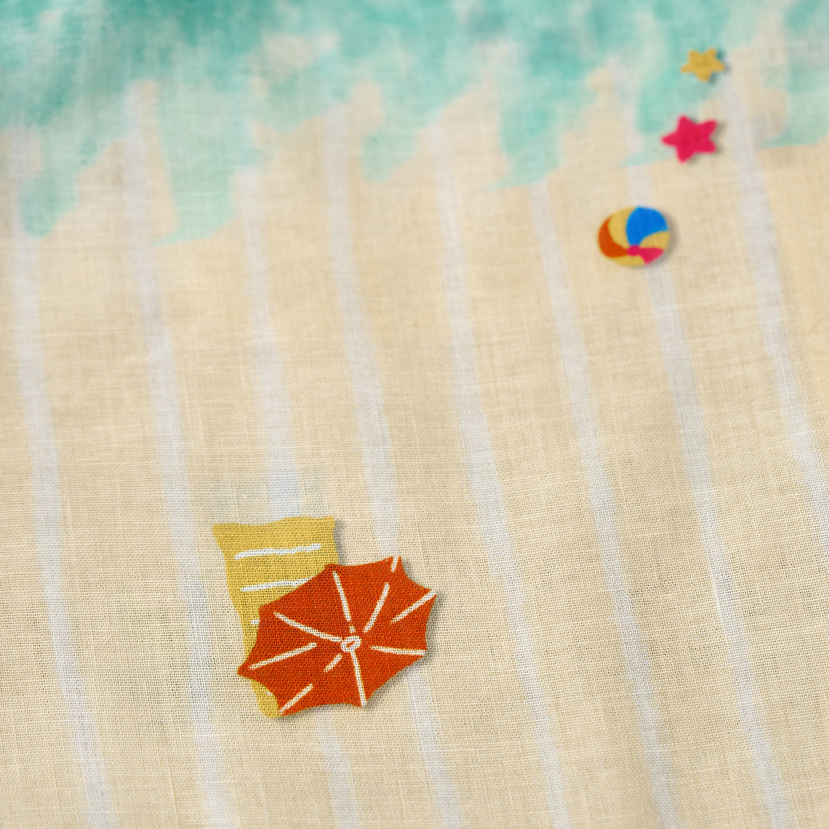 サーファー、パラソル、浮き輪、そして砂浜に横たわる人々など、小さなモチーフがランダムに配置されています。活気あるビーチの物語が見えてくるデザインになっています。