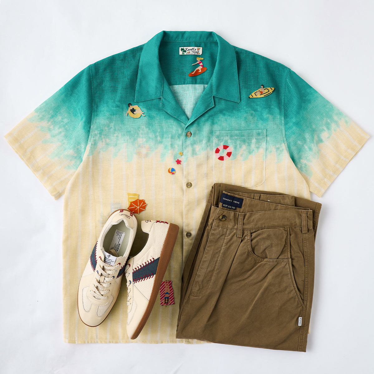 チノパンやグルカサンダル、あるいは白のスニーカーと合わせることで、都会的なリゾートスタイルが完成します。