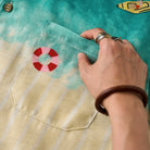 襟元から肩にかけての深いエメラルドグリーンから、裾に向かって柔らかなベージュへと変化するオンブレ染めのようなプリントが、海から陸への境界線を美しく表現しています。