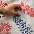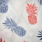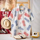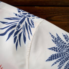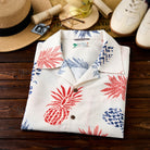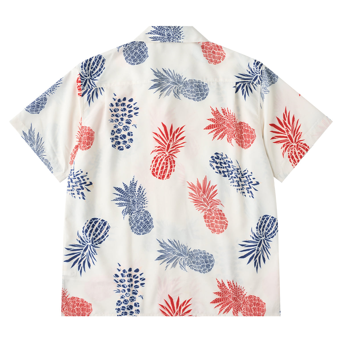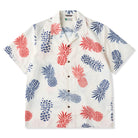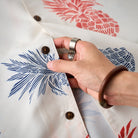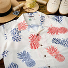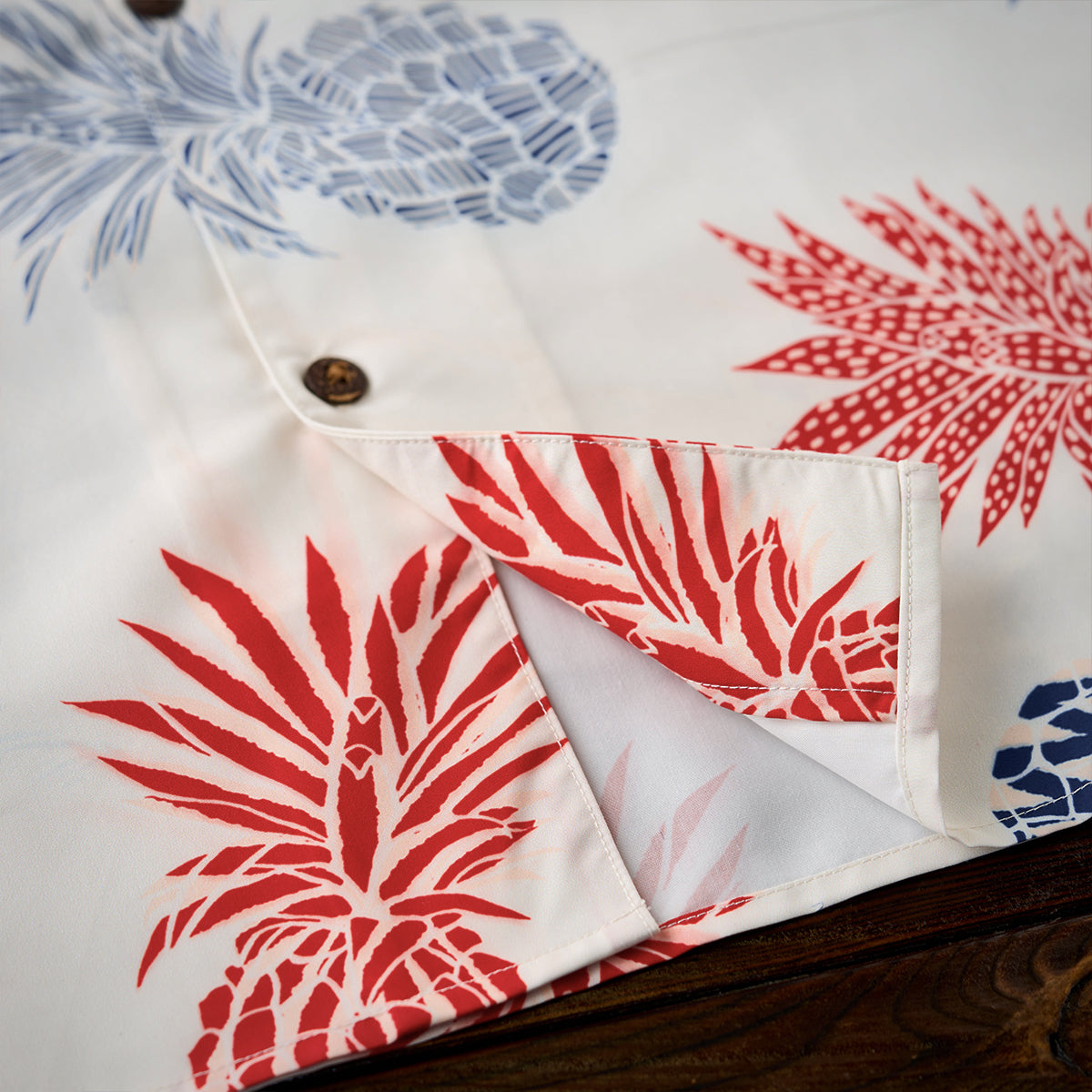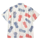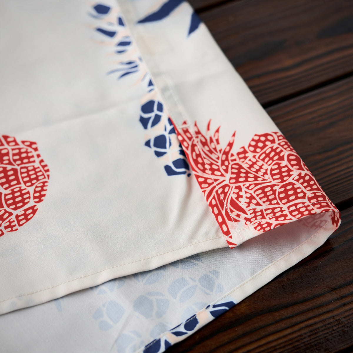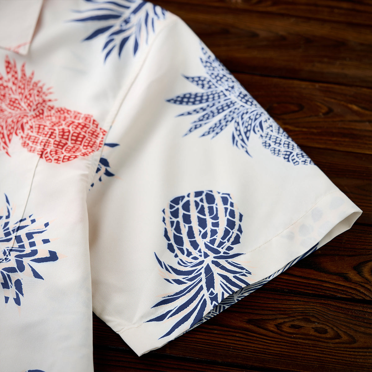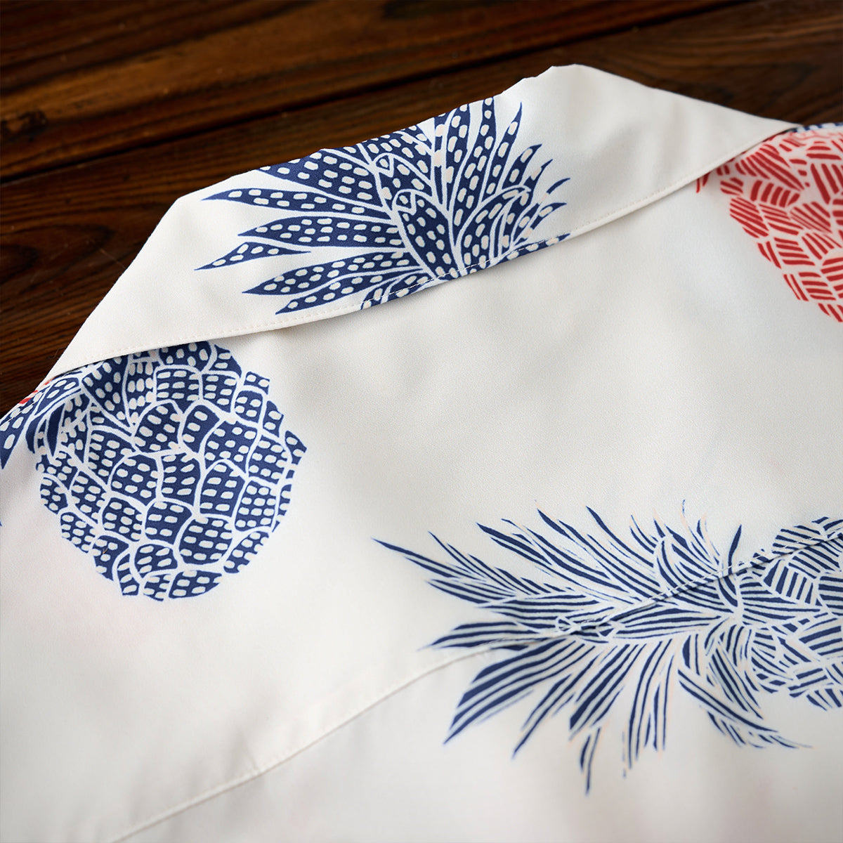 日本らしい紅と藍の伝統色をベースに、ドットやラインなどの幾何学モチーフを組み合わせて描いた“パイナップル”のシルエットが印象的。ユニークな構成要素を絶妙なバランスで散りばめた、ランダム感と統一感を併せ持つ総柄アロハシャツです。ひと目で惹きつけるビジュアルながら、和のエッセンスも感じられる一着は、街でもリゾートでも活躍します。