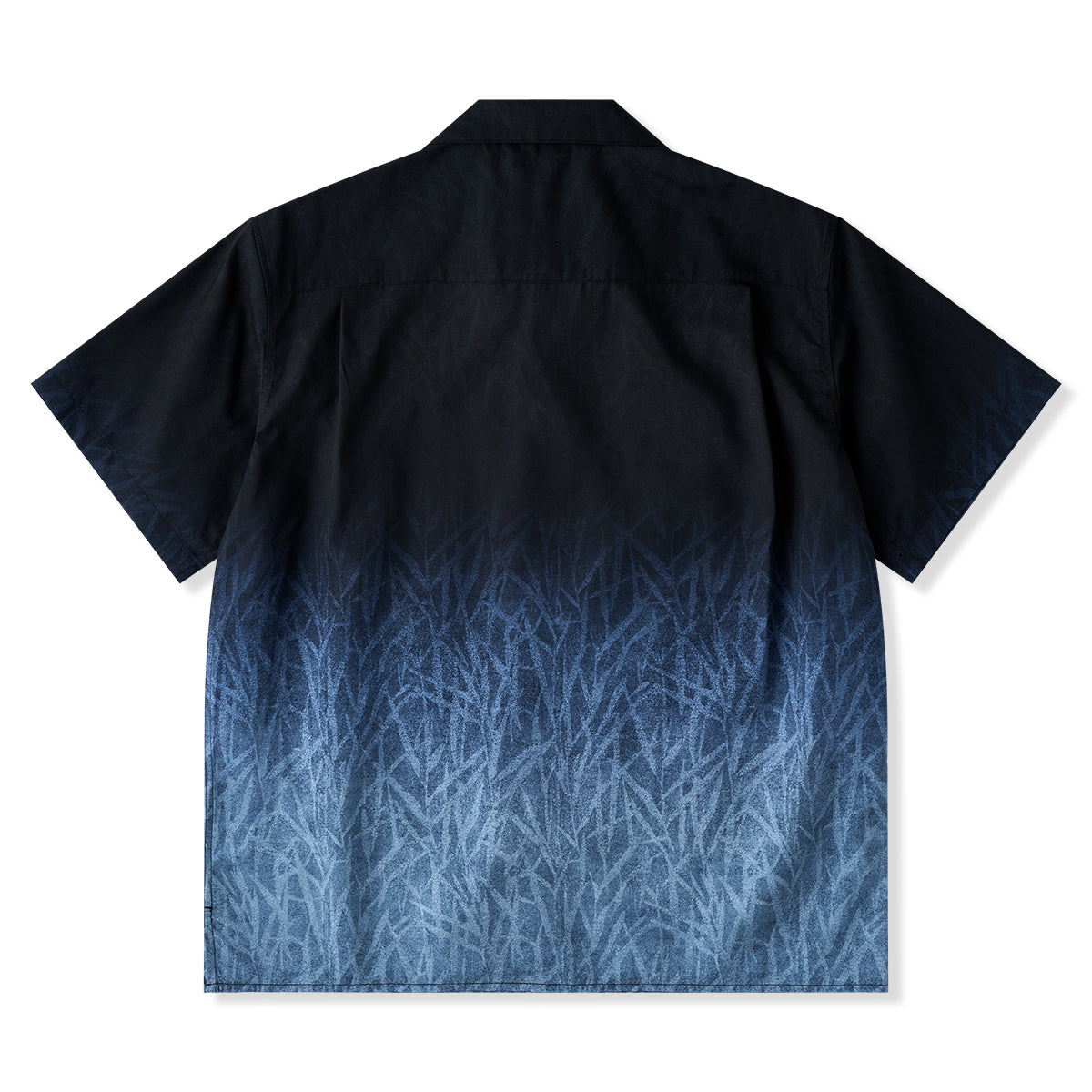 江戸の奇才・葛飾北斎による怪談シリーズ《百物語》より、「お岩さん」の一場面を大胆にプリントした一枚。青から深い藍へと移ろうグラデーションの背景に、静かに揺れる竹の文様をあしらい、闇夜に潜む怪異の気配を演出。身にまとうだけで、江戸の幻想と怪談の世界へと誘う、アートと和の融合が際立つオープンカラーシャツです。さらりと羽織れるフェイクテンセル素材で、夏の夕涼みや夜の散策にもぴったり。和柄好きや浮世絵ファンにも刺さる、語れる一着です。