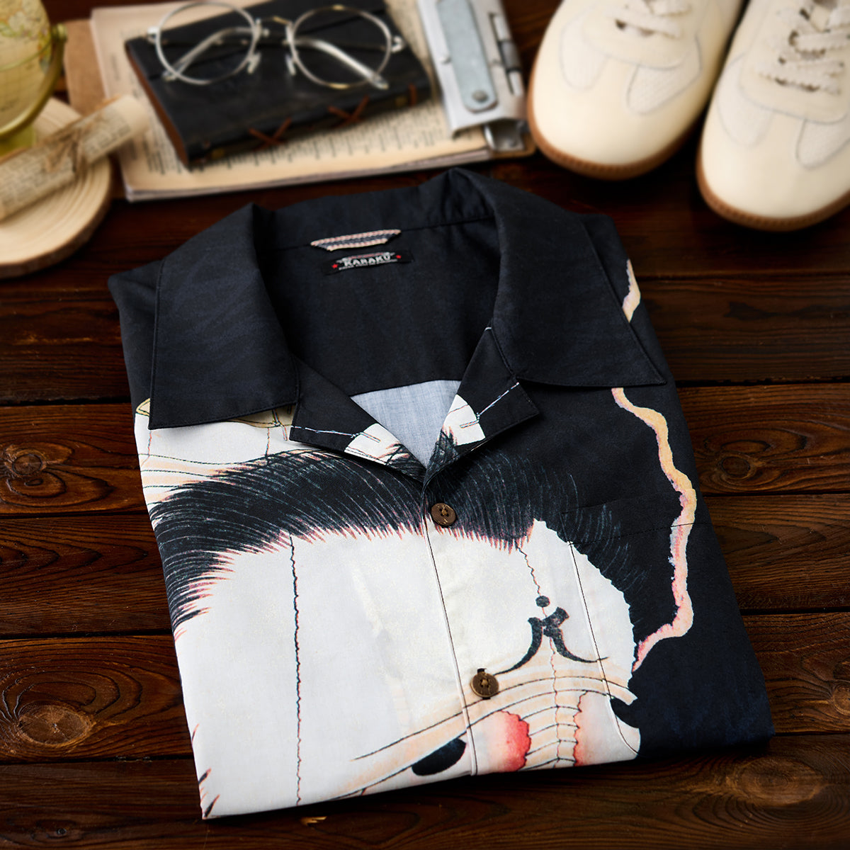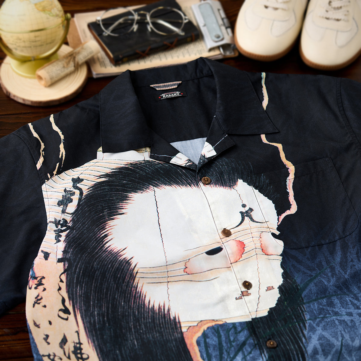 葛飾北斎「百物語・お岩さん」プリント入りオープンカラーシャツ