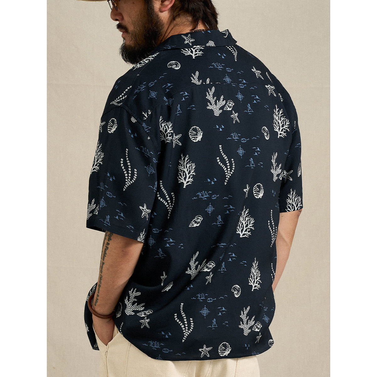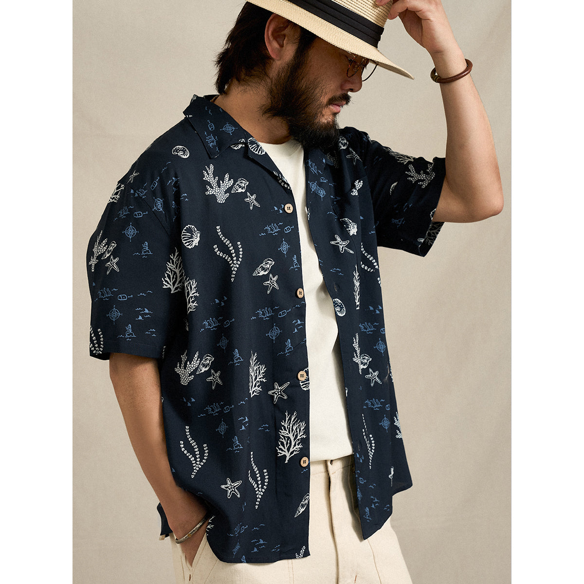 ホワイトとダークネイビーのコントラストが美しい、海底世界をテーマにした総柄アロハシャツ。幻想的な海の底に隠された宝物たちをモチーフに、夏の冒険心をくすぐる一枚に仕上げました。爽やかな配色は、強い日差しの下でも軽やかに映え、リゾートからタウンユースまで幅広く活躍。肌離れのよいさらりとした生地感で、汗ばむ季節も快適な着心地をキープします。一枚で着ても、羽織としても主役になる、夏の装いに彩りを添えるアイテムです。