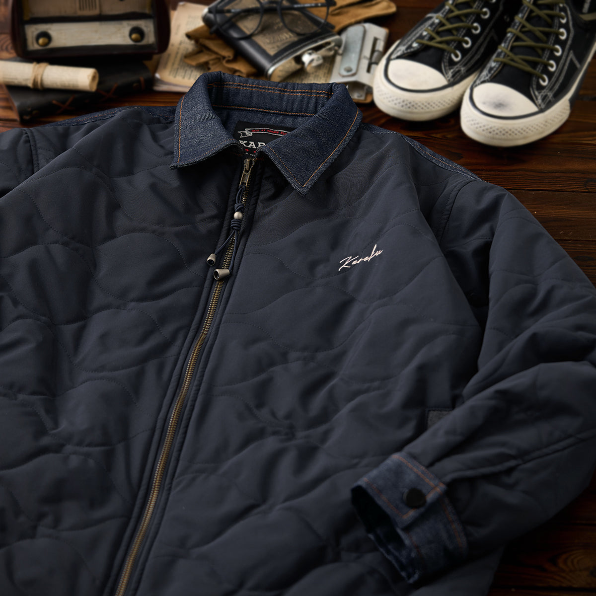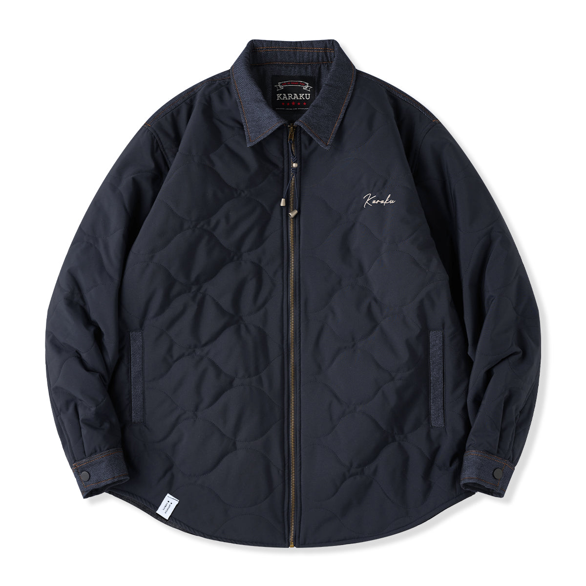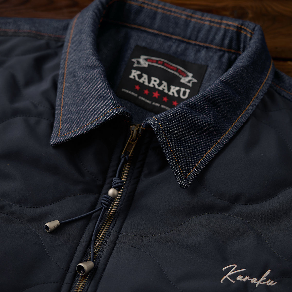 【予約】「KaraKu」ロゴ刺繡 デニム切替ひょうたんキルト中綿ジャケット