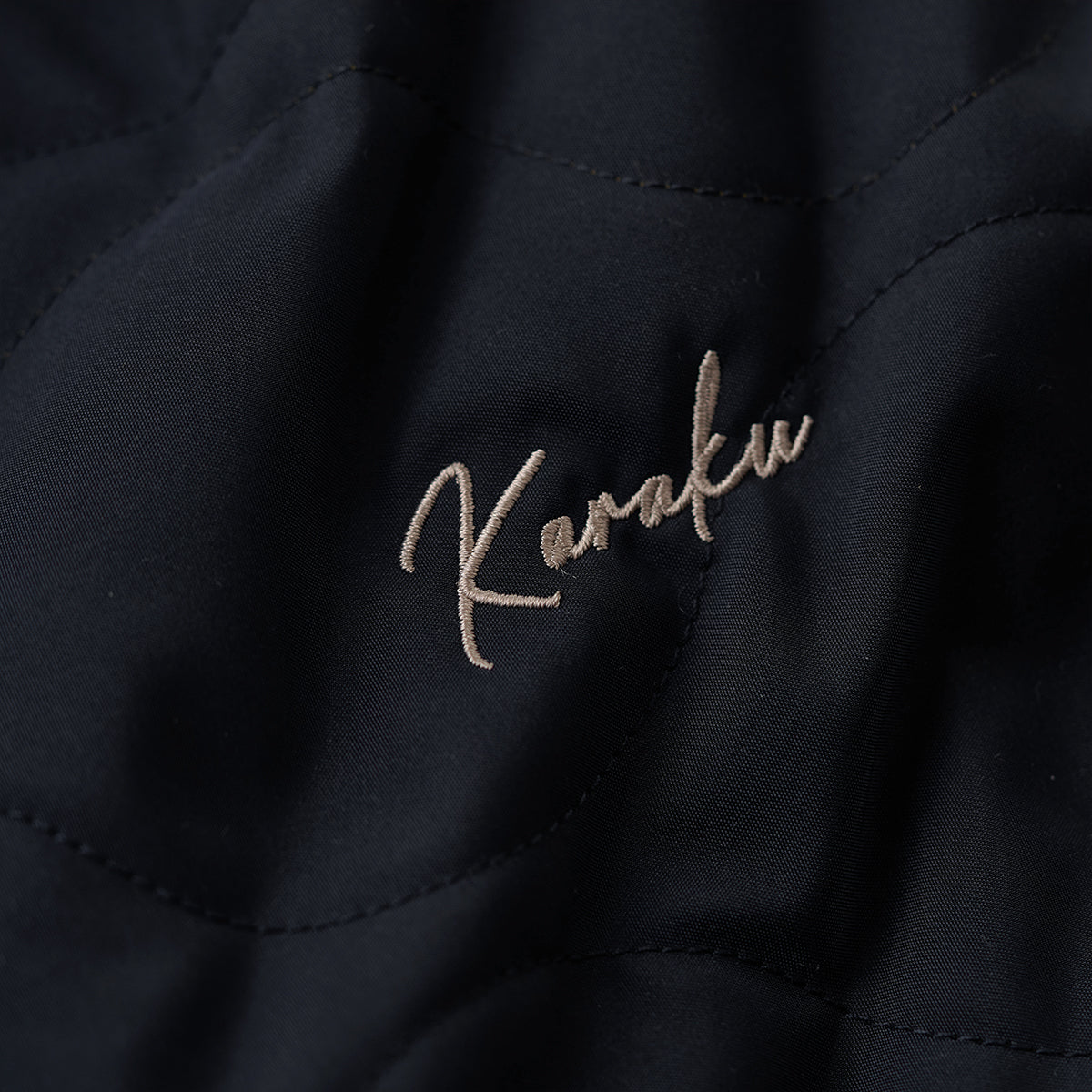 左胸部分に控えめな刺繍で「Karaku」のロゴが配置され、シンプルながらも上品な雰囲気を醸し出し、ミニマルデザインとして全体の調和を損なわないポイントになっています。