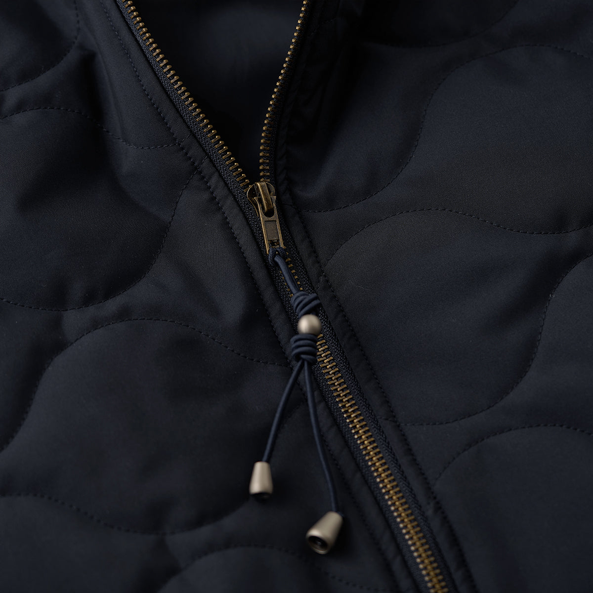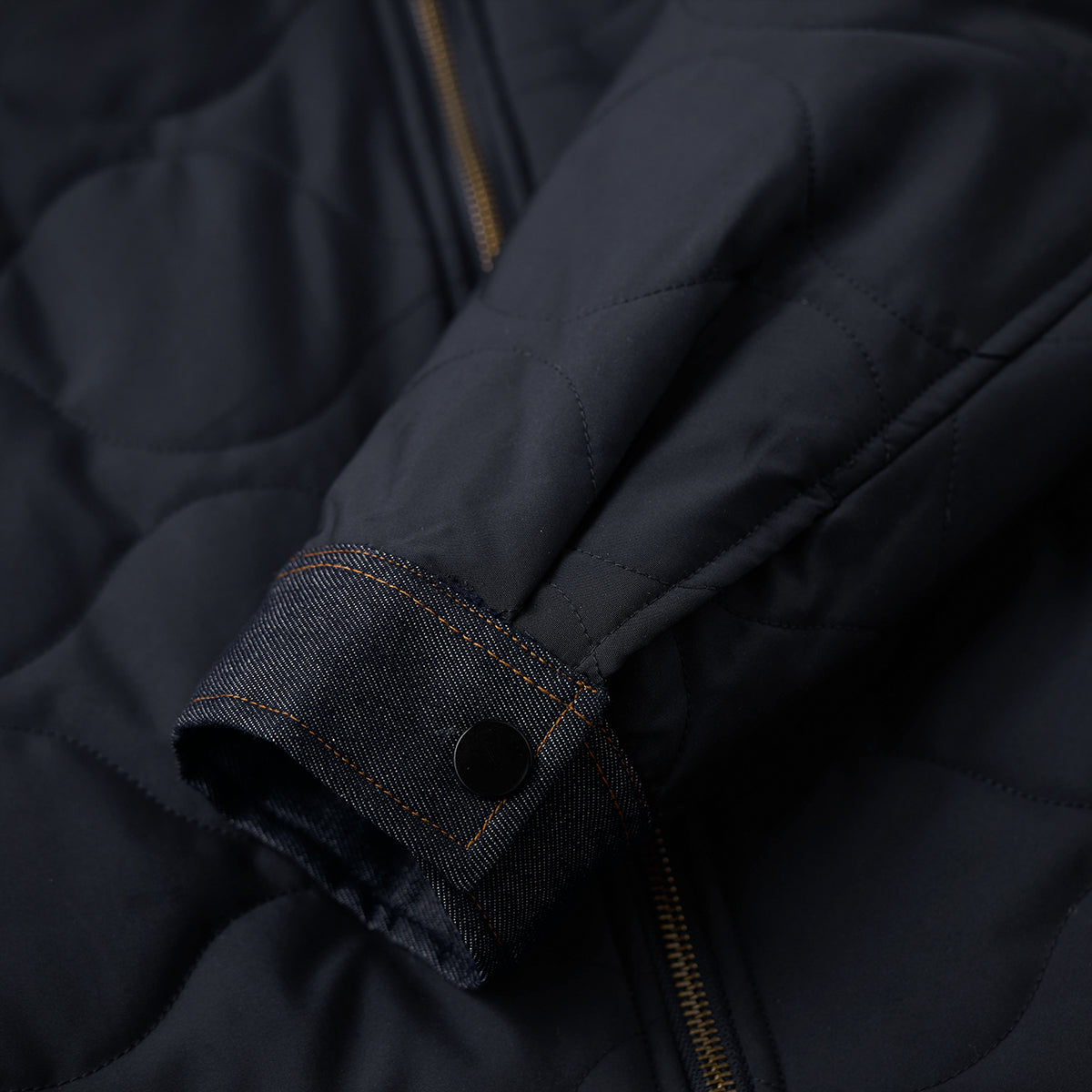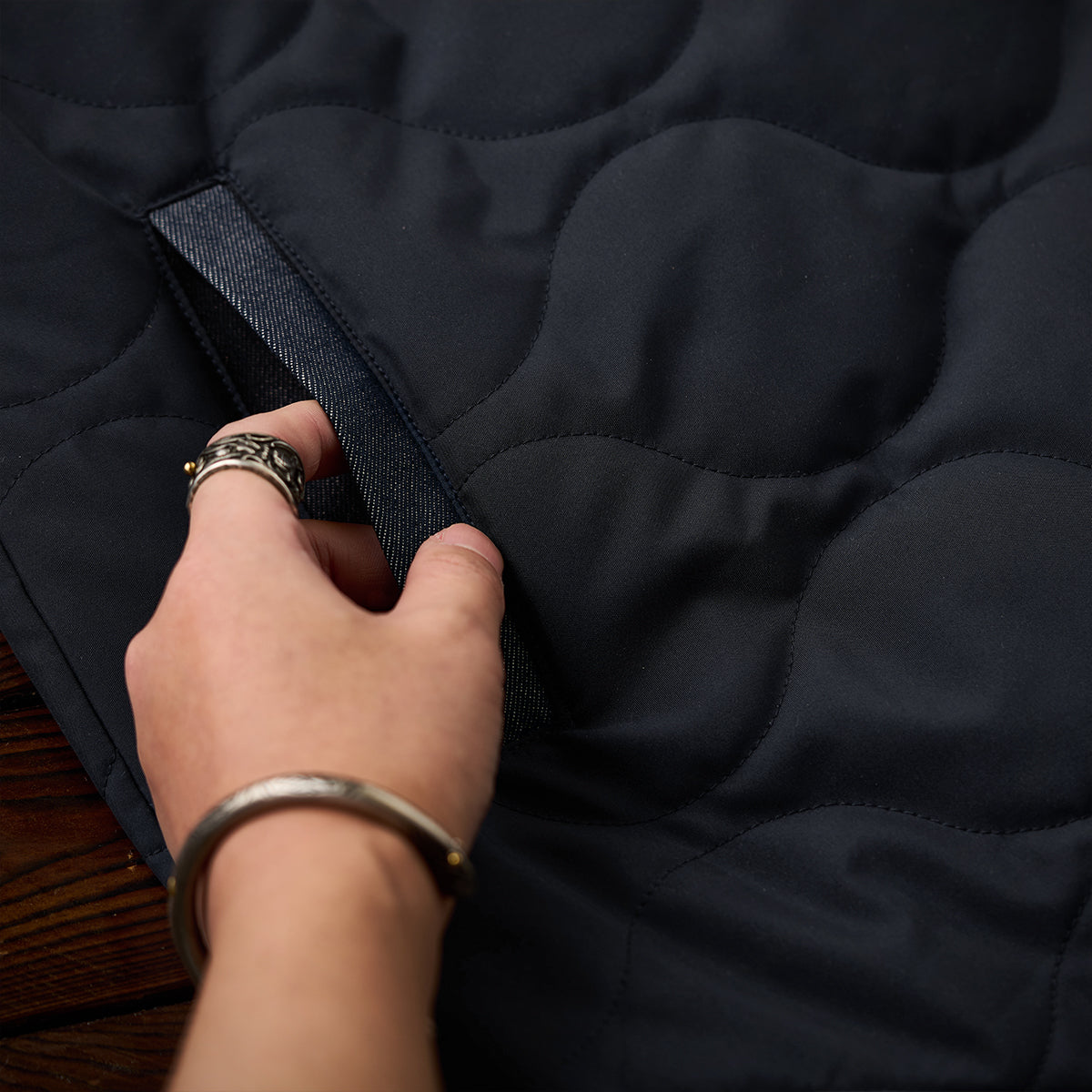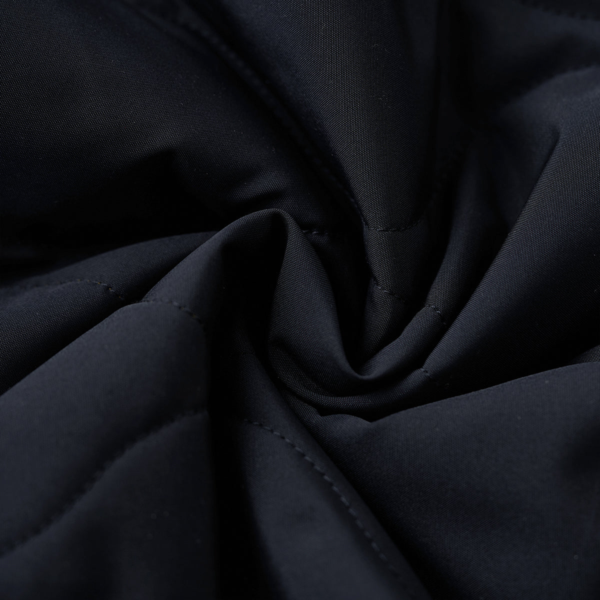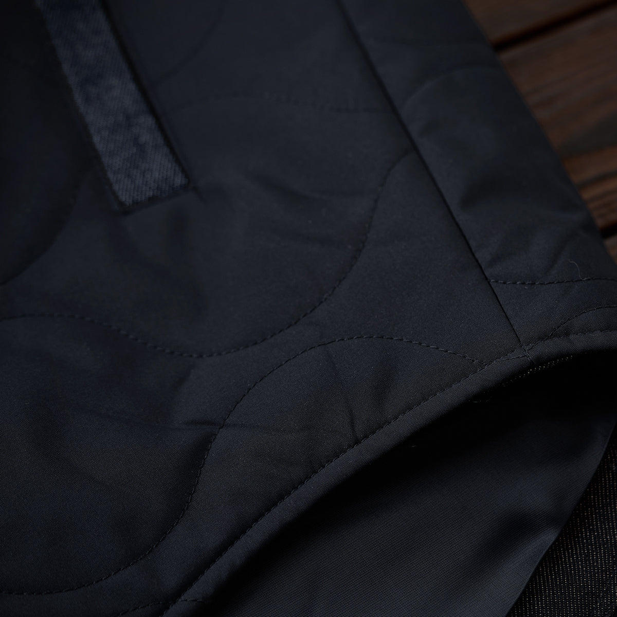 程よい光沢感と高級感のある風合いが持ち味のポリエステルを採用しており、武骨さと耐久性があり、実用的な機能美が魅力的です。中綿が入っているため、保温性が高く、寒い季節でも暖かく着用できます。