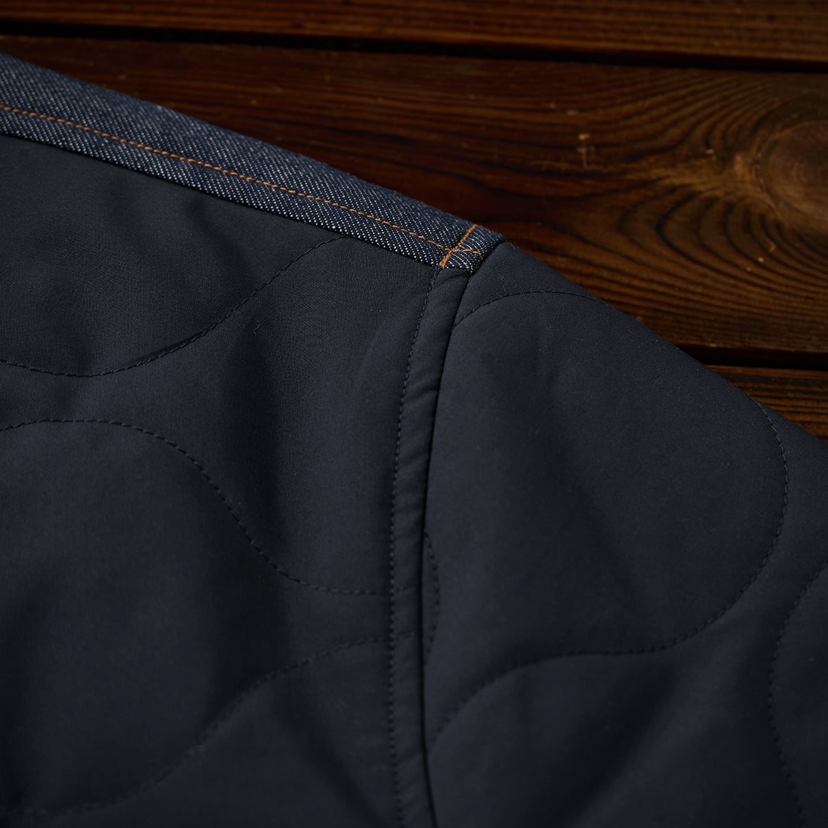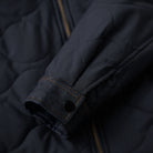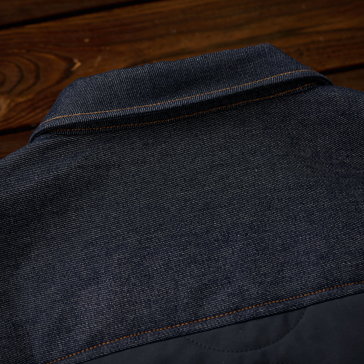 デニムが襟・肩・袖口・ポケット部分に使用されており、これらは摩耗しやすいカ所です。特に肩部分の切り替えは、視覚的なアクセントを生むと同時に、ジャケットのシルエットを引き締めています。