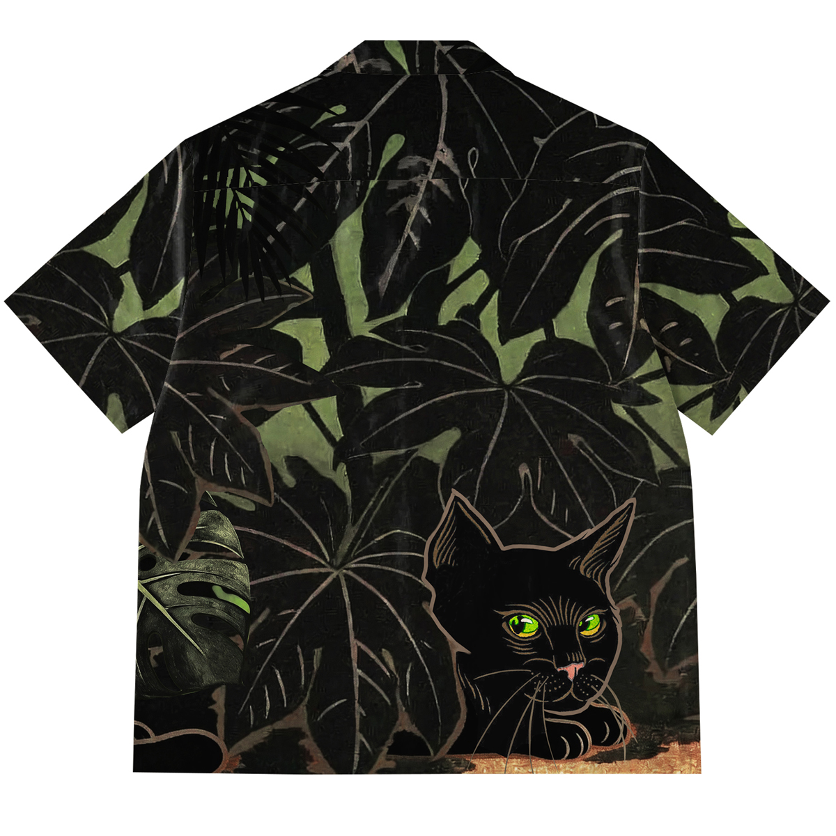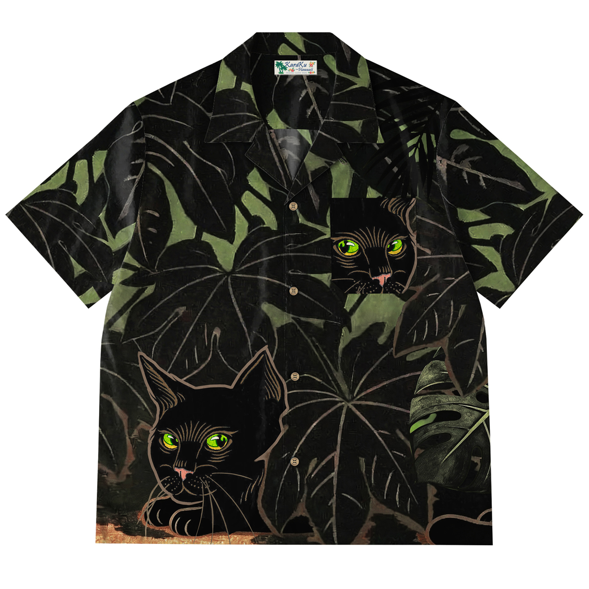 【予約】「猫が葉の中に隠れている」版画風プリントアロハシャツ