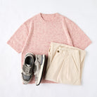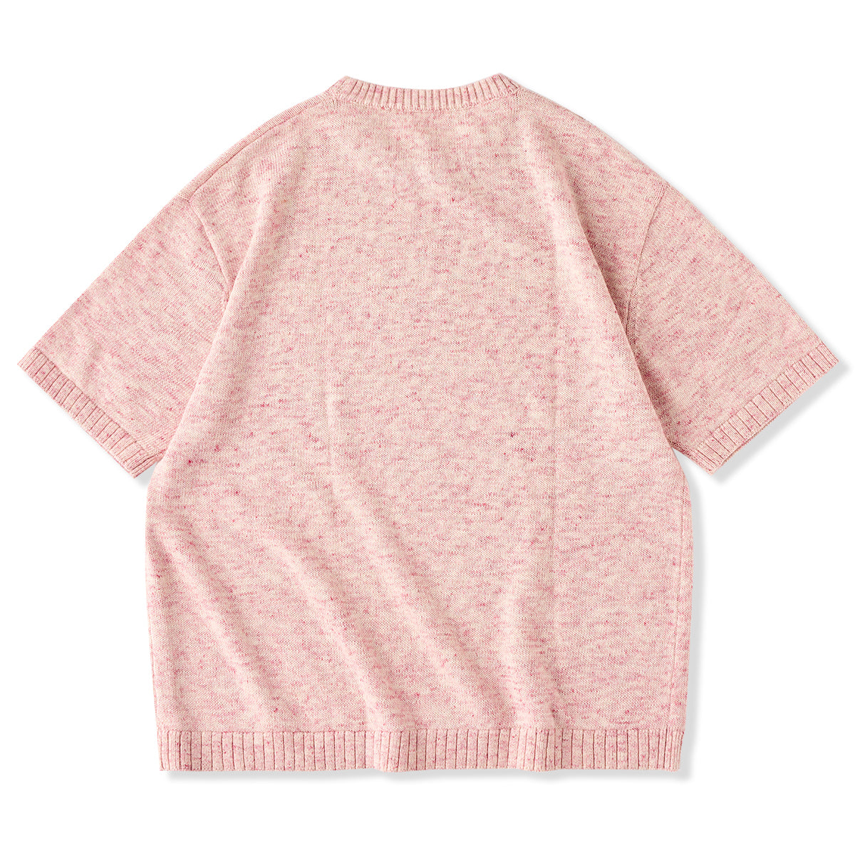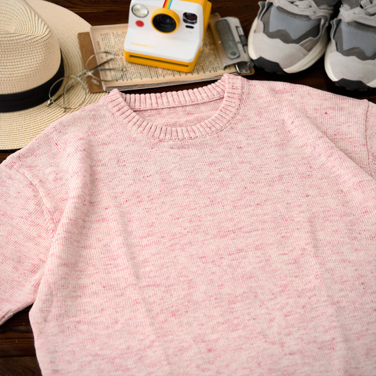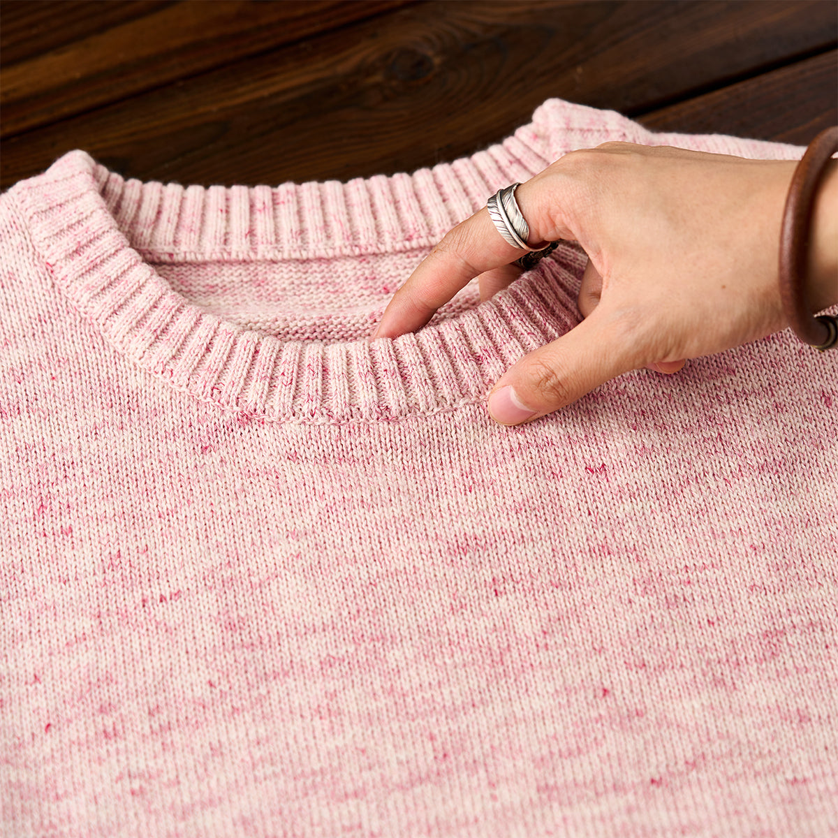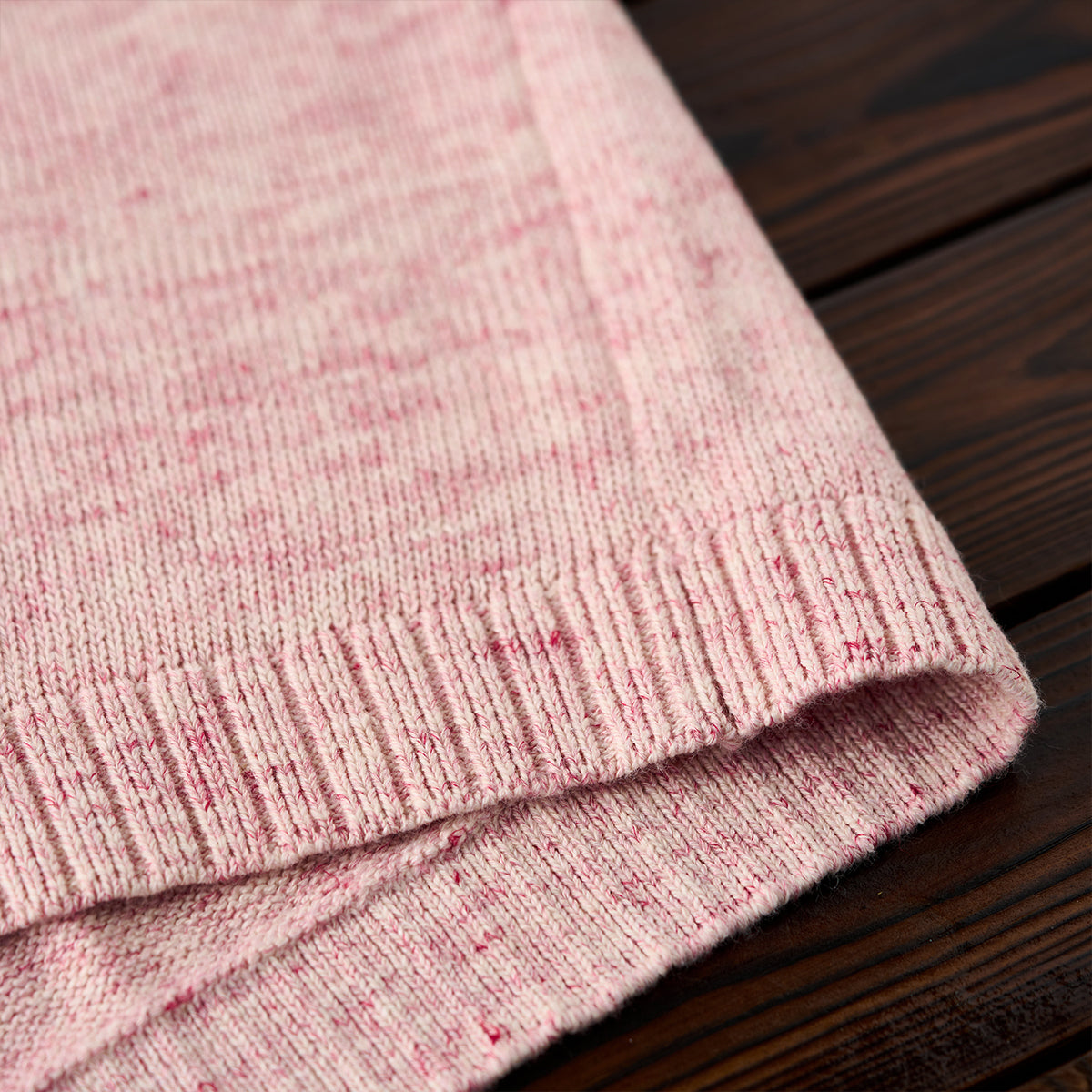 メインカラーは淡いピンクで、清潔感と優しさを感じさせ。ピンクのベースに細かい赤い糸が混ざり、メランジ効果を生み出す、温かみやカジュアル感を演出する。