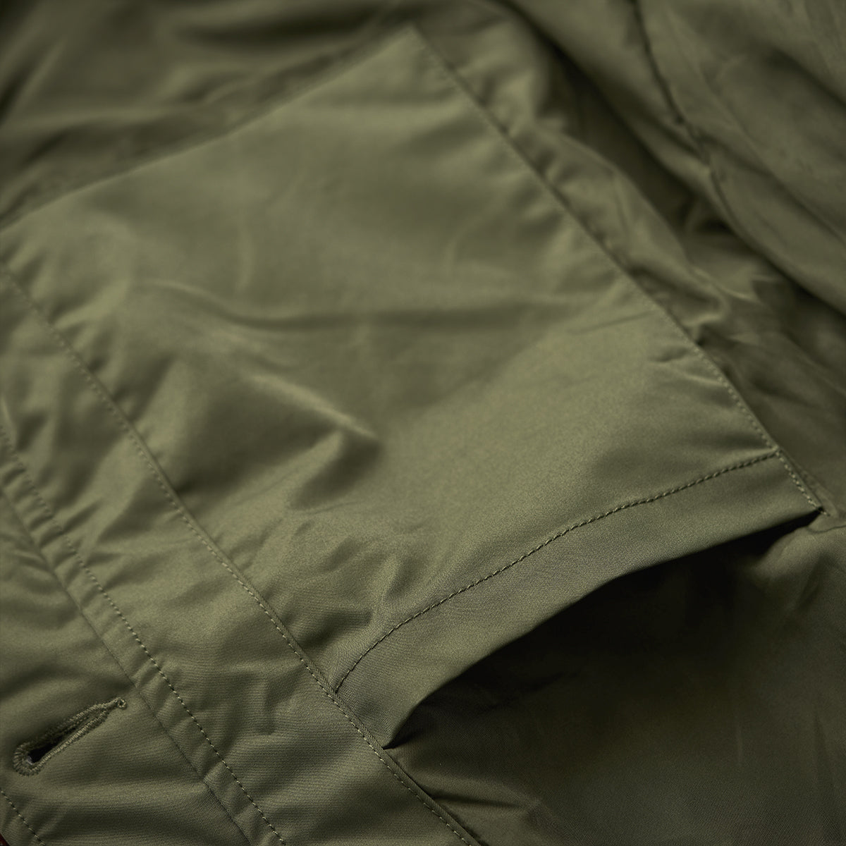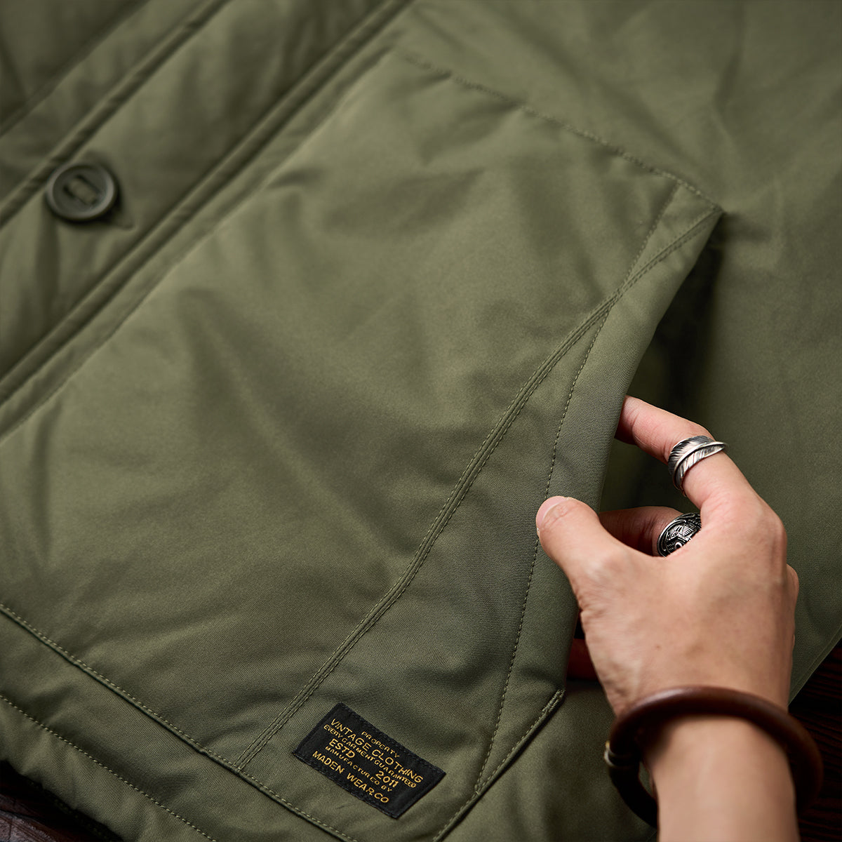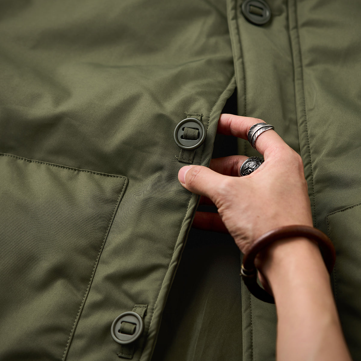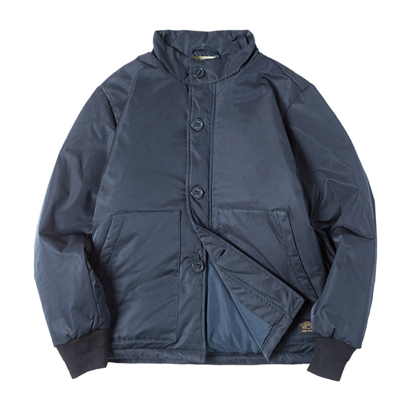 絶妙な光沢感のあるポリエステル生地を使用し、男らしいタフ感があり、耐久性も優れた。程よい高さのある立襟はアジア人の体形とあっています。ジッパーはまだ一般的ではない時代に誕生したA-1について、丈夫なボタンは主役となっていた。防風性がある袖リブも基本のデザインです。本アイテムはボタン式と袖リブを踏襲しつつ、立体的なシルエットと短めの着丈はテキパキで、身長全体も長く綺麗に見えます。
