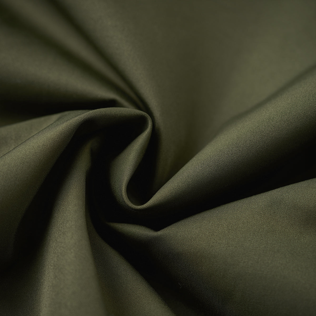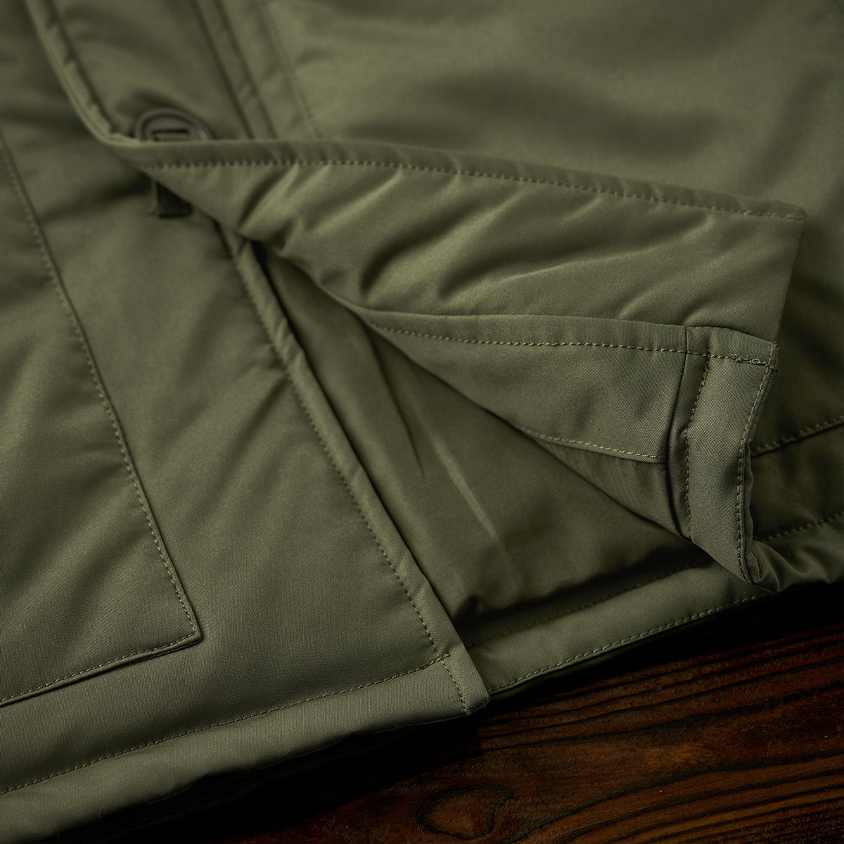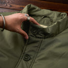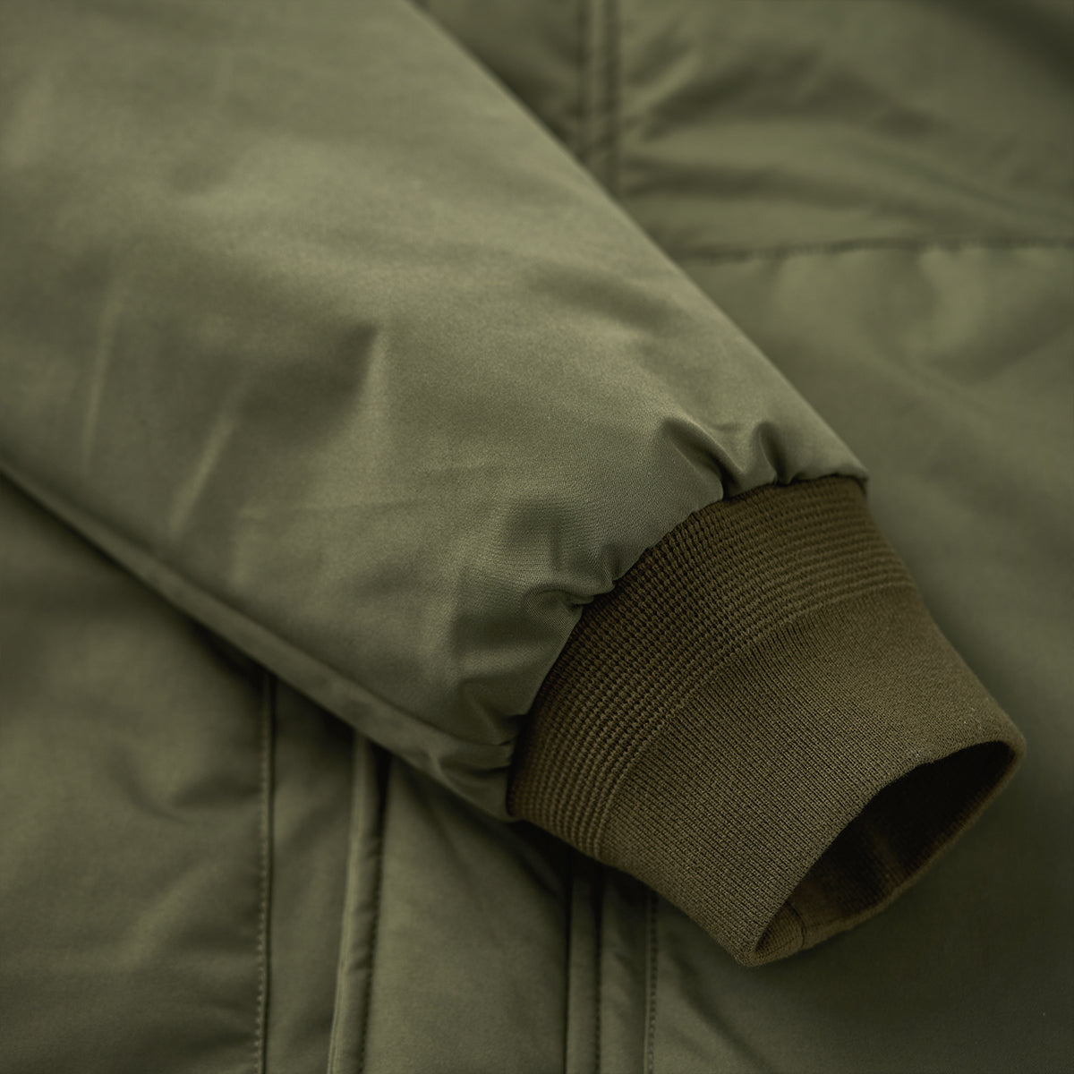 絶妙な光沢感のあるポリエステル生地を使用し、男らしいタフ感があり、耐久性も優れた。程よい高さのある立襟はアジア人の体形とあっています。ジッパーはまだ一般的ではない時代に誕生したA-1について、丈夫なボタンは主役となっていた。防風性がある袖リブも基本のデザインです。本アイテムはボタン式と袖リブを踏襲しつつ、立体的なシルエットと短めの着丈はテキパキで、身長全体も長く綺麗に見えます。