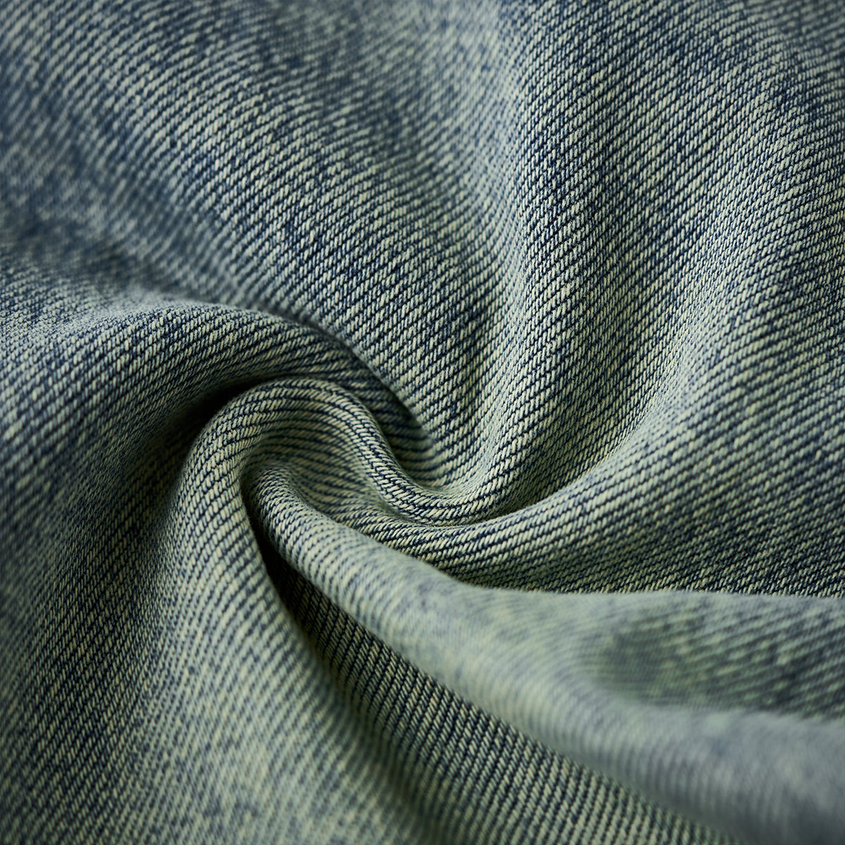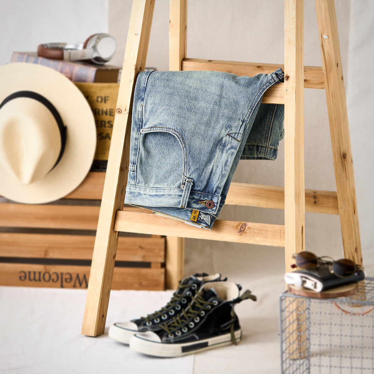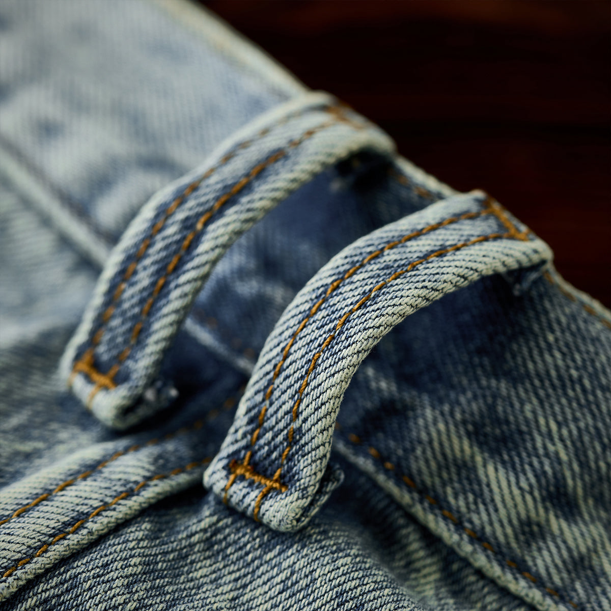 丈夫で耐久性のあるデニム生地で作られて、快適な着心地と頑丈さを提供。全体的にウォッシュがかかって、色落ちやフェードが施されて、ヴィンテージライクな風合いが強調されている。