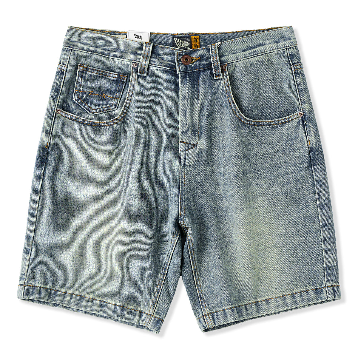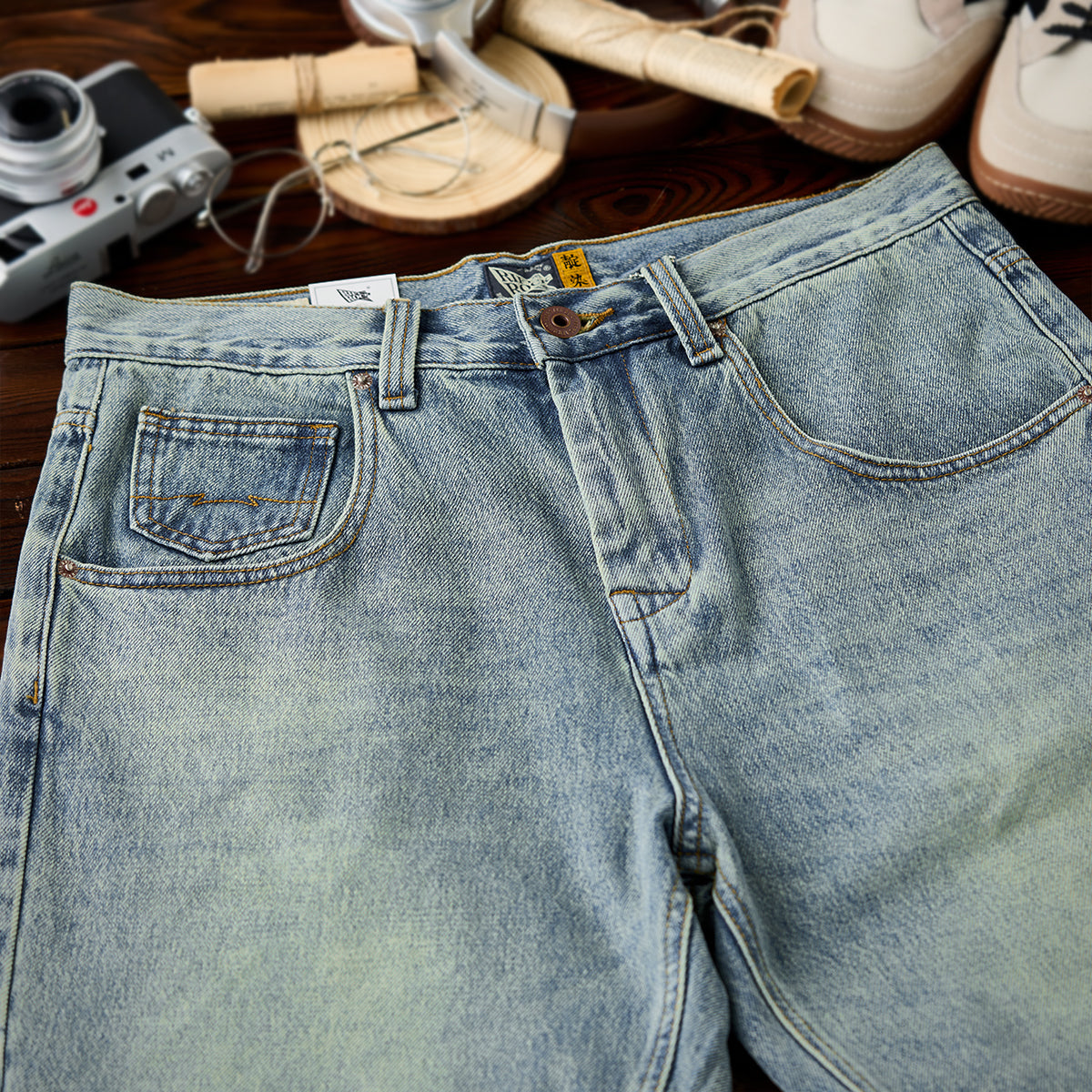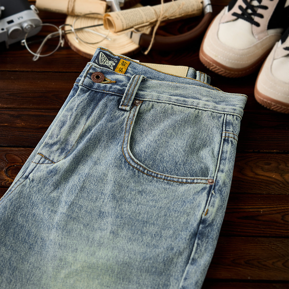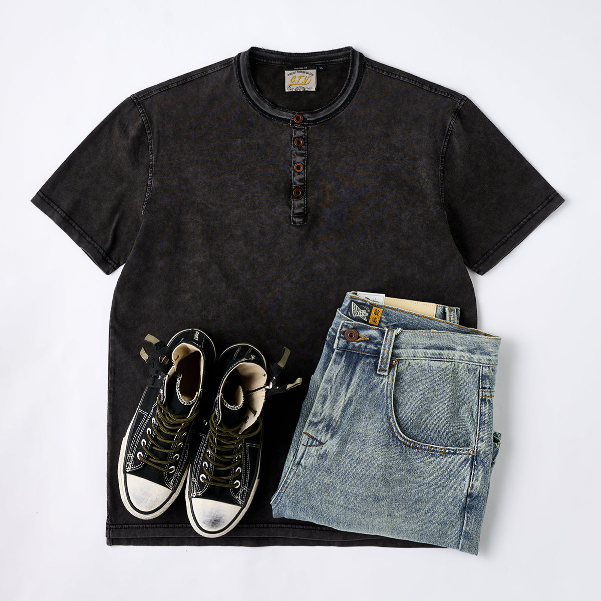 丈夫で耐久性のあるデニム生地で作られて、快適な着心地と頑丈さを提供。全体的にウォッシュがかかって、色落ちやフェードが施されて、ヴィンテージライクな風合いが強調されている。