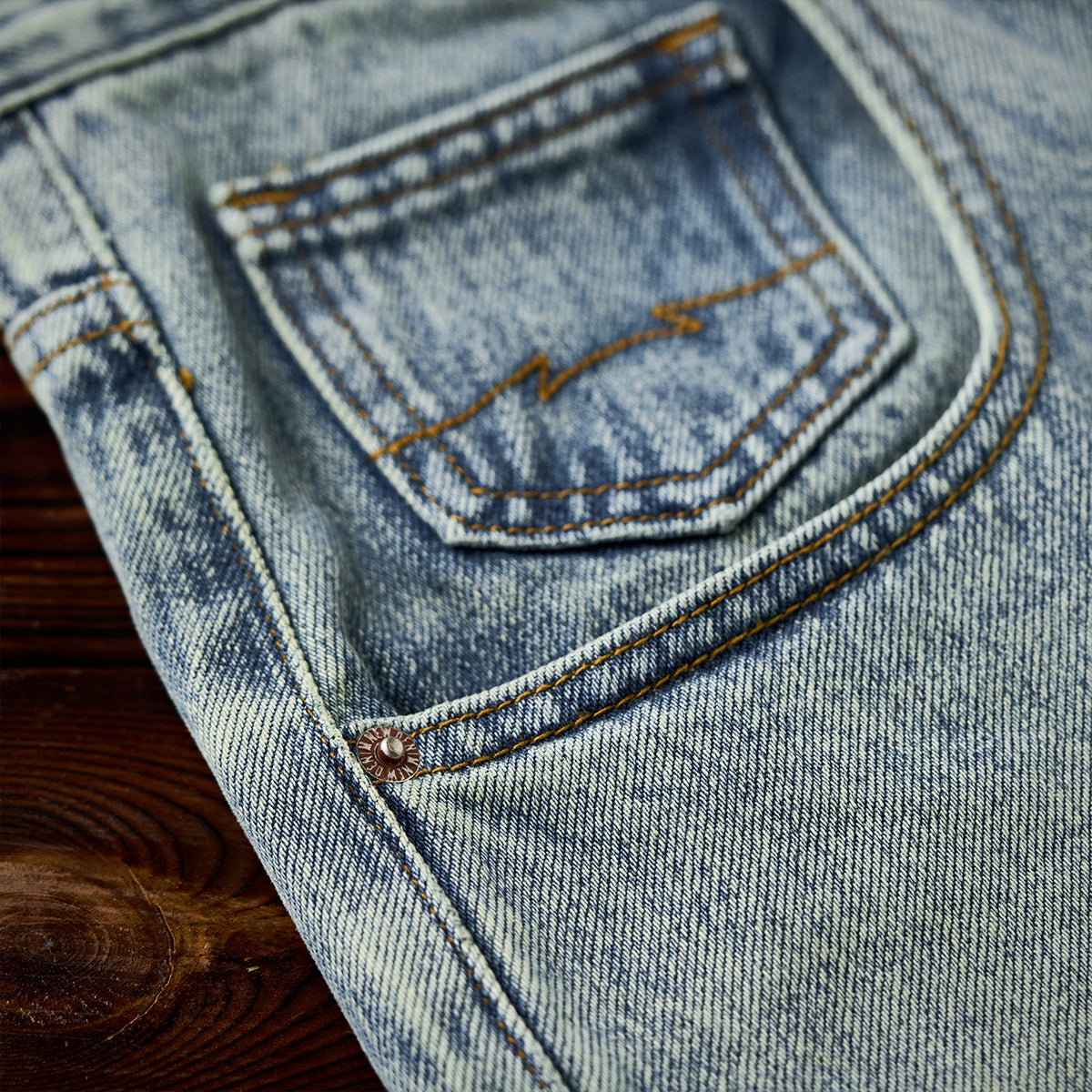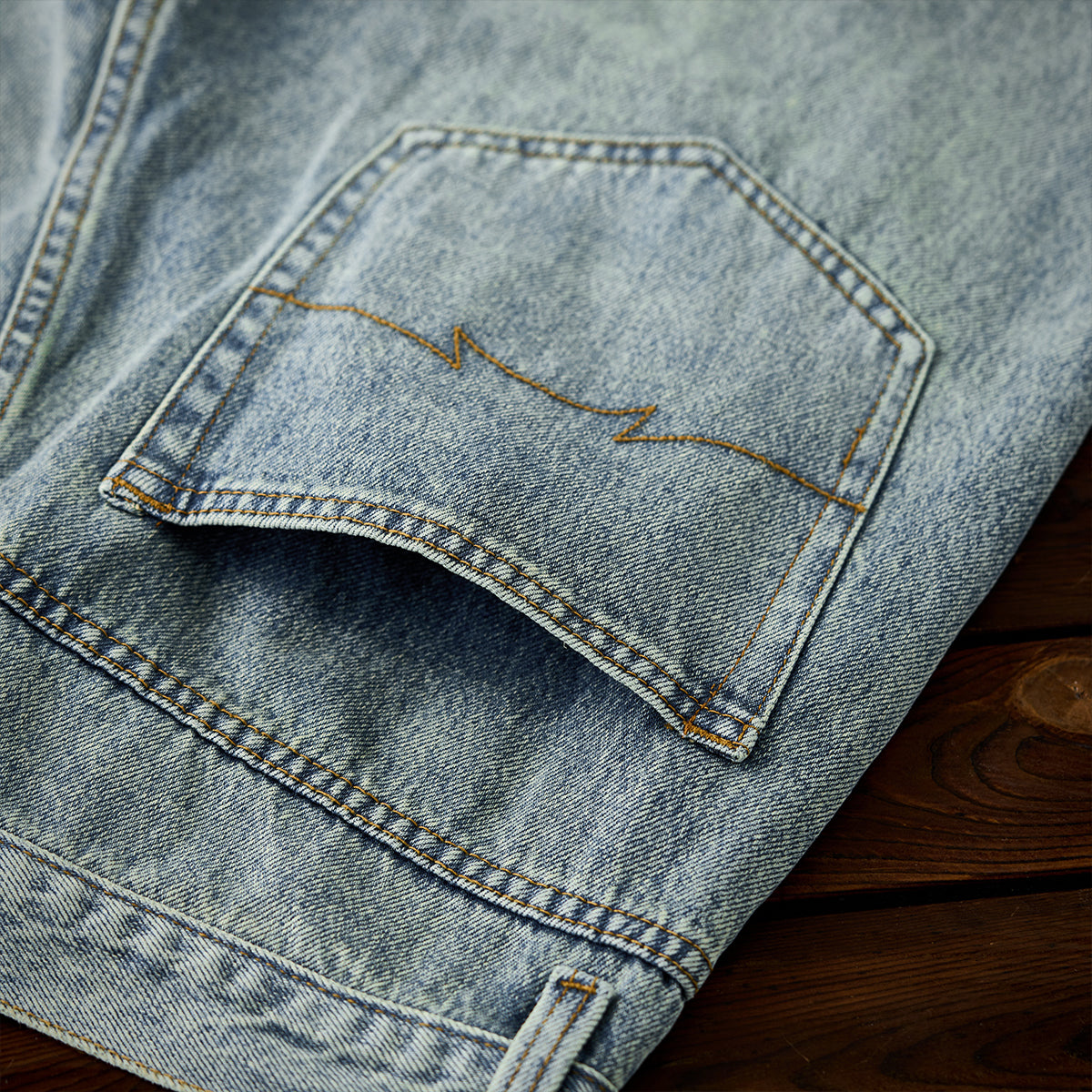 後ろのポケットには、波型のステッチが施されている。このデザインは視覚的な個性を強調し、ブランドの独自性を表現している。フロントポケットの縁取りやリベットが、デニム特有のタフさをアピールしている。