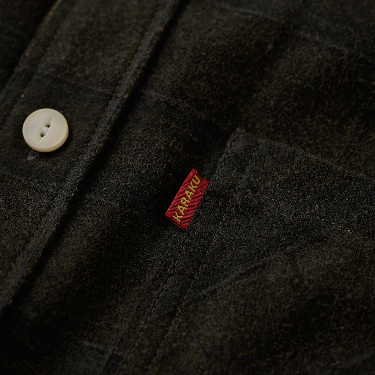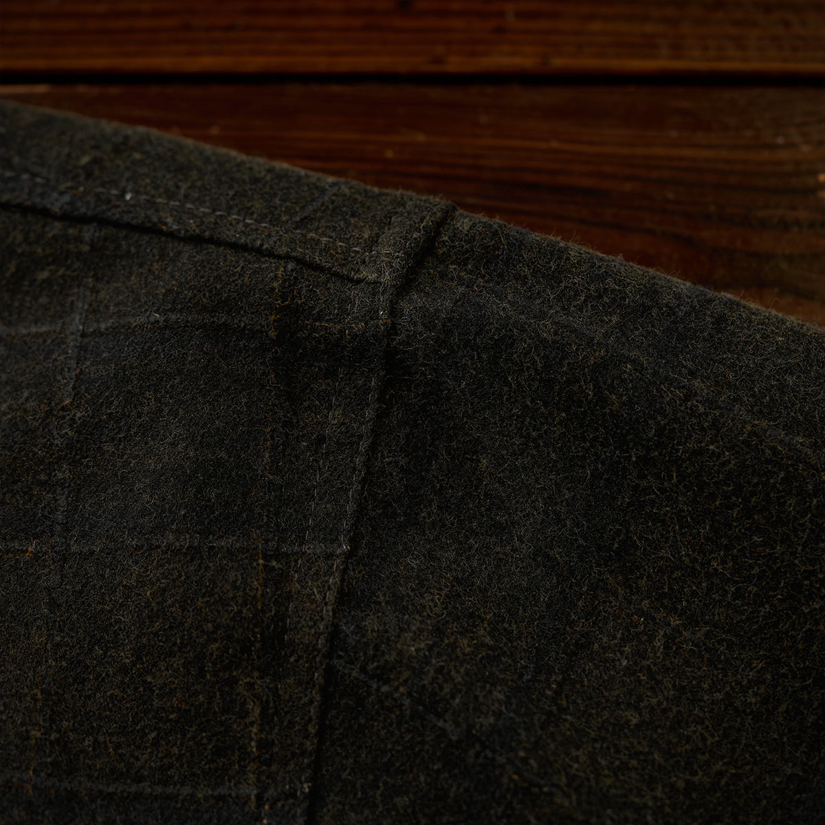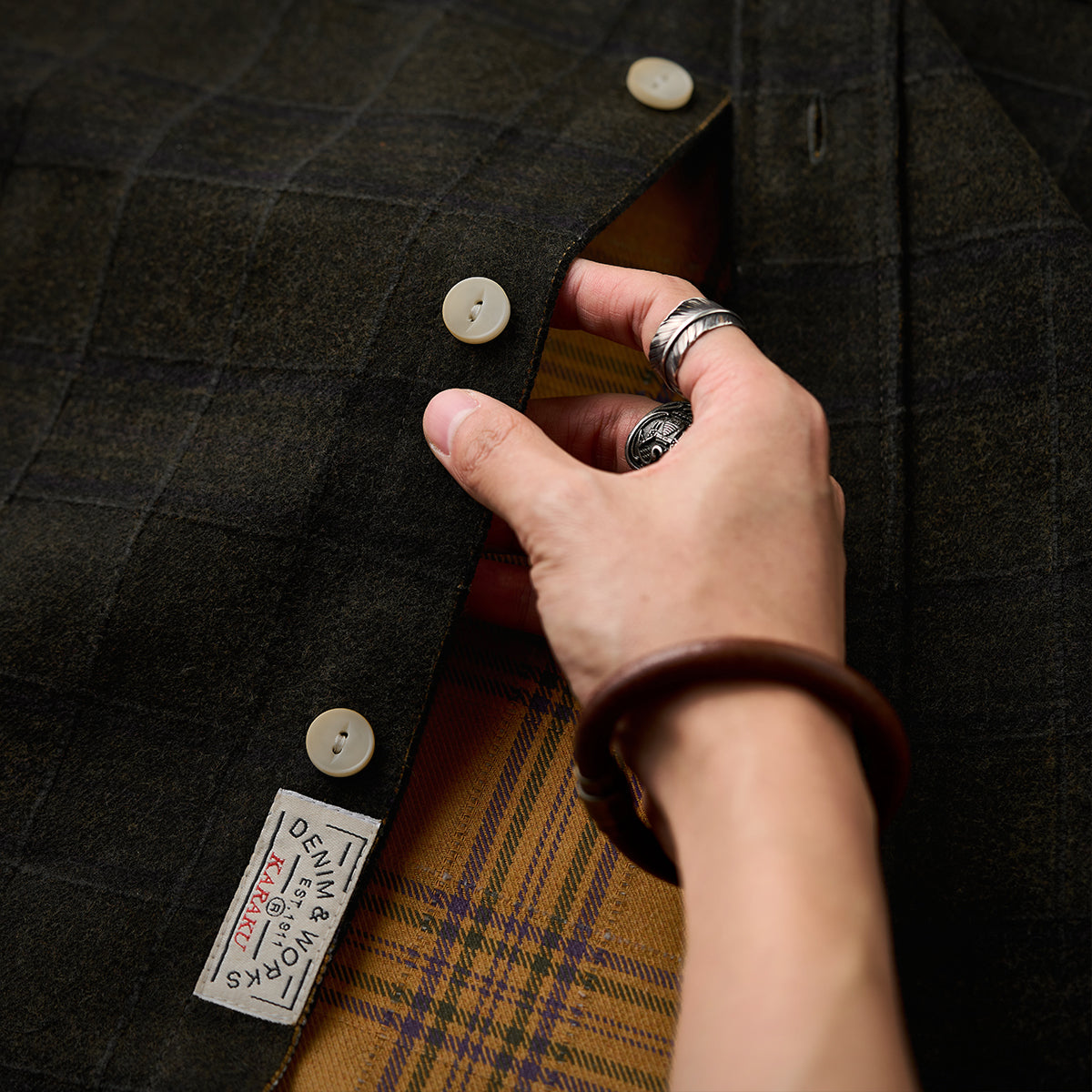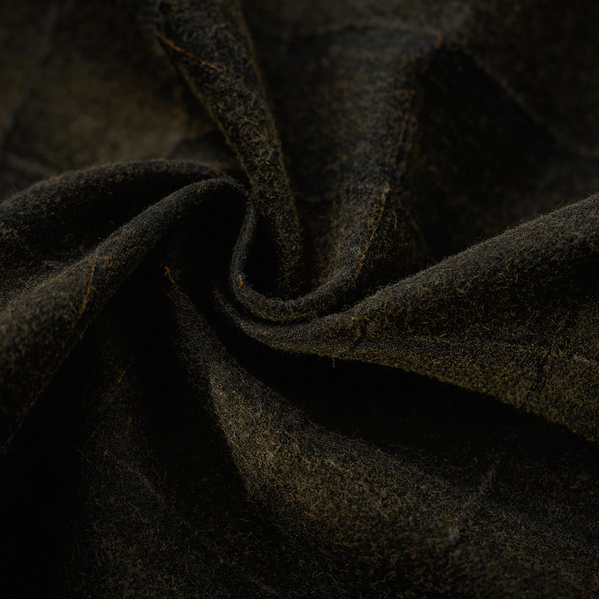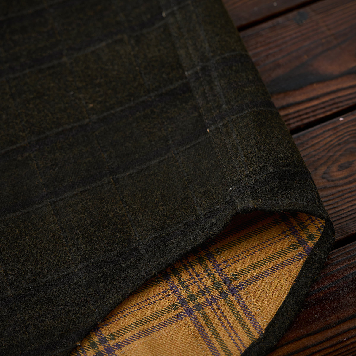 表地には、フロッキーコーティングが施されたチェック柄の生地が使用されています。柔らかく起毛した質感が生まれ、温かみのある印象を与えています。