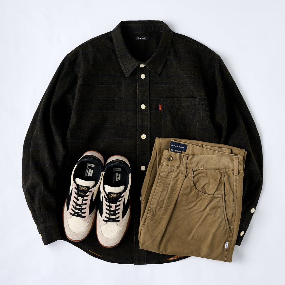 デニムパンツやチノパンと合わせて、リラックスしたカジュアルスタイルになります。インナーにシンプルなTシャツやタートルネックを合わせることで、アウターとしても活用可能です。