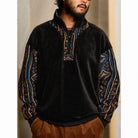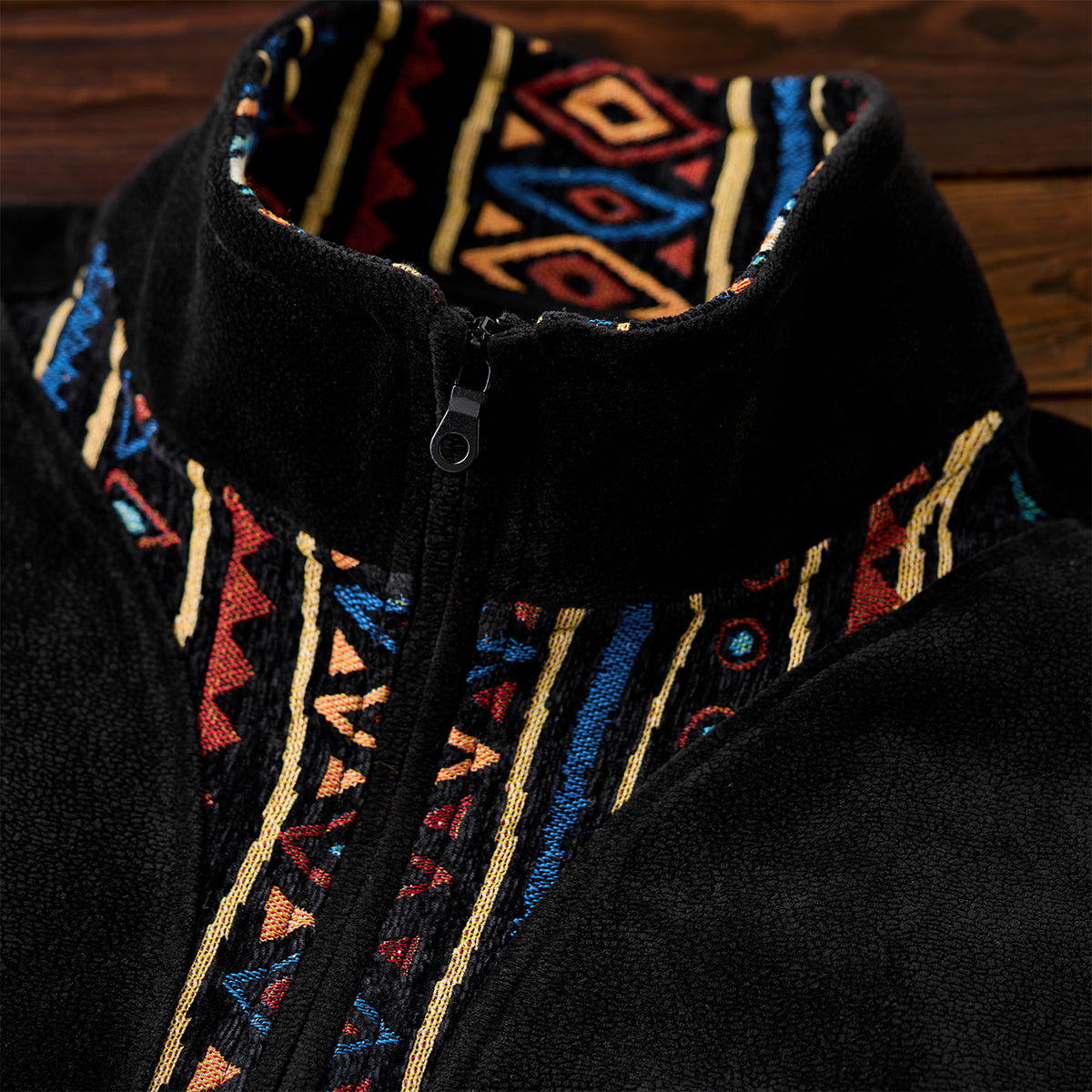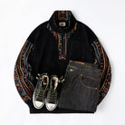 暖かみのあるポーラーフリースをベースに、袖にはシェニール素材を採用。その上から民族調のジャカード柄を織り込むことで、独特の立体感と重厚な表情を生み出しました。異素材のコンビネーションが目を引くデザインで、シンプルなシルエットながらも存在感抜群。ハーフジップ仕様により温度調整が容易で、アウトドアからタウンユースまで幅広く対応します。伝統的な民族モチーフと現代的なスポーティー要素が融合した、秋冬シーズンの主役となる一着です。