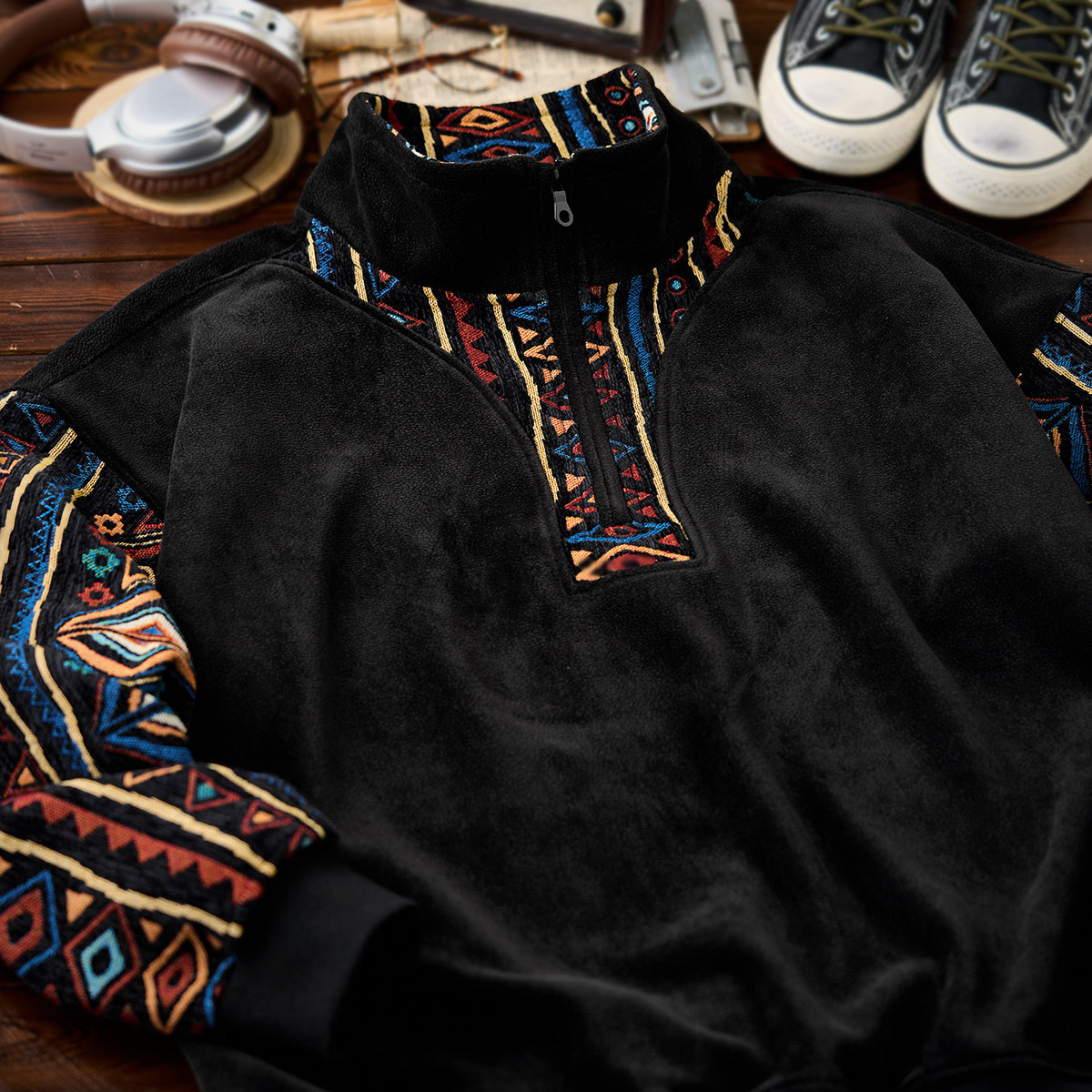エスニックジャカード織りコンビ ハーフジップポーラーフリーススウェット