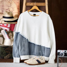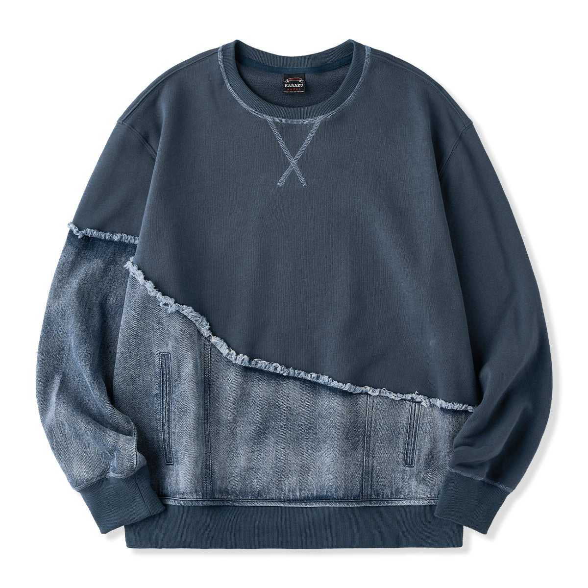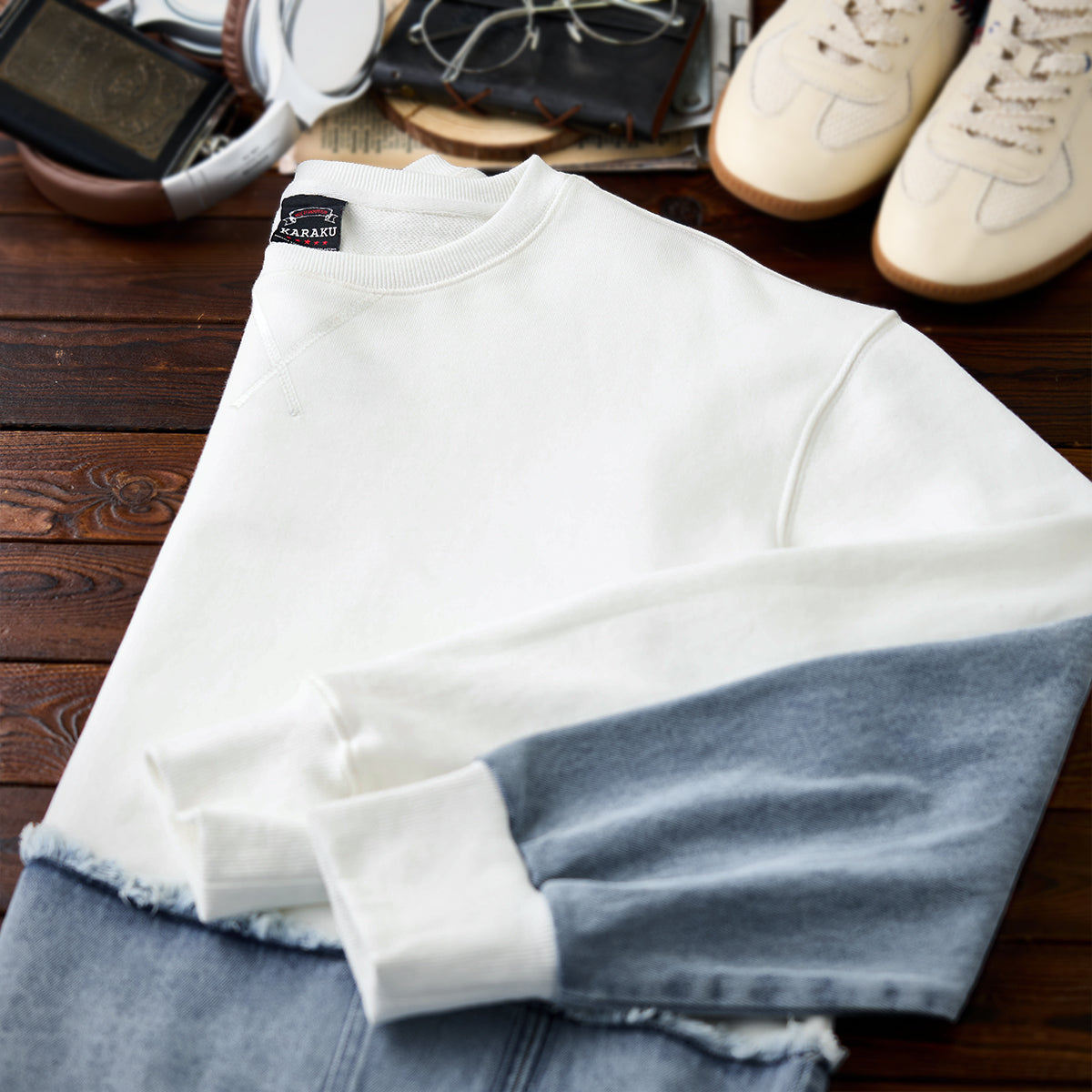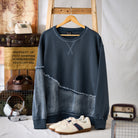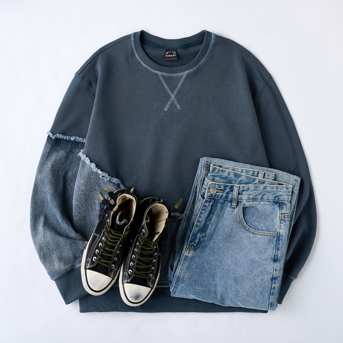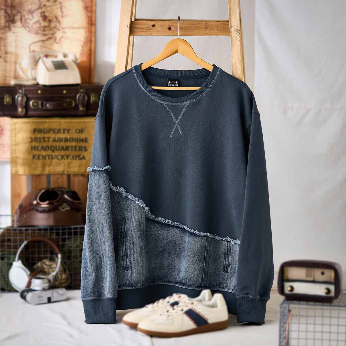 ヴィンテージ感漂うウォッシュドデニム切替が目を引く、クルーネックコットンスウェット。胸元にはクラシックなスウェットの象徴ともいえる「Vガゼット」をあしらい、首まわりの補強とデザイン性を両立。両サイドにはフェイクポケットをあしらい、実用性ではなく装飾としてのアクセントをプラスしています。程よく肉厚なコットン生地は柔らかな肌ざわりで、着込むほどに馴染む風合いを楽しめます。ボディとデニムの異素材切替が、カジュアルながらも個性を感じさせる一枚です。デニムパンツからチノまで、幅広いスタイリングにマッチします。