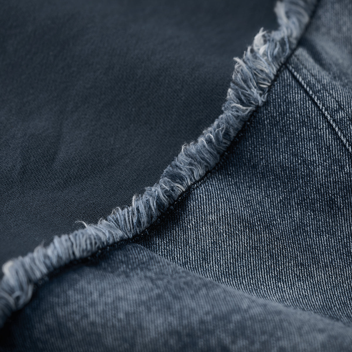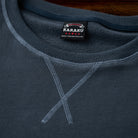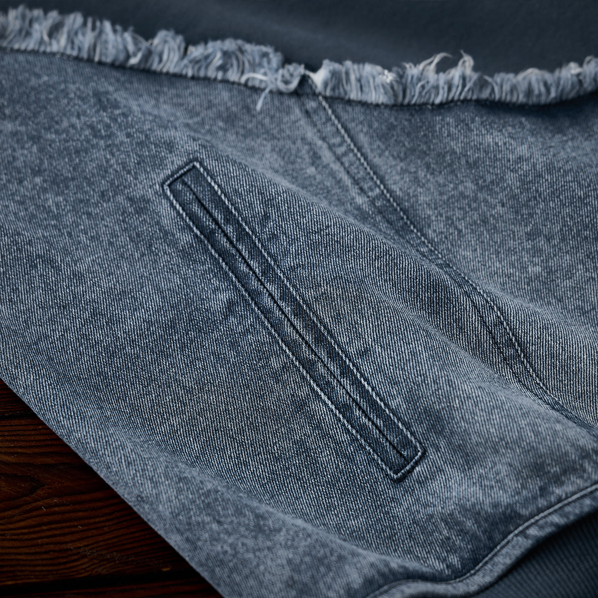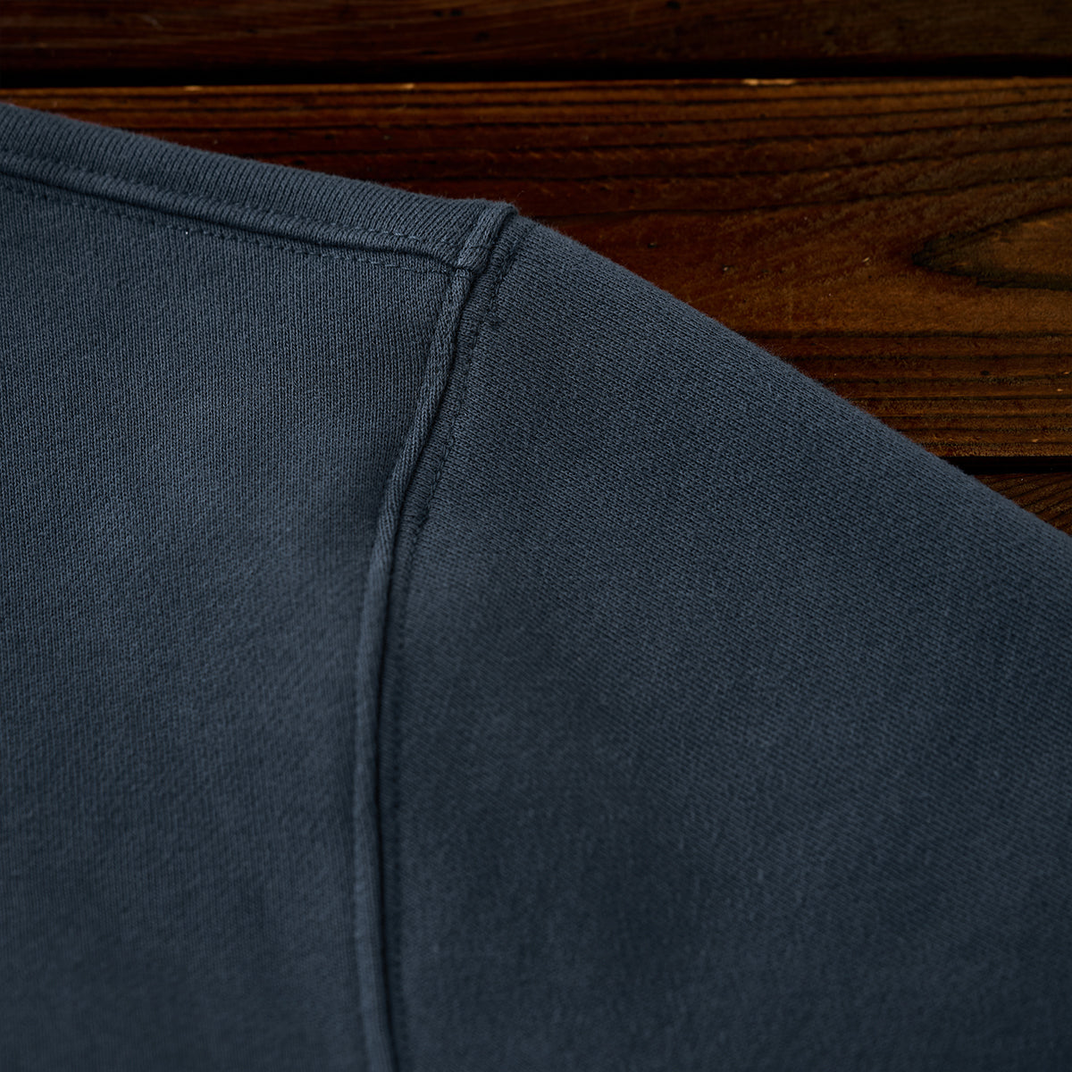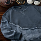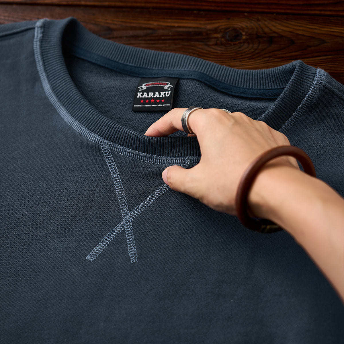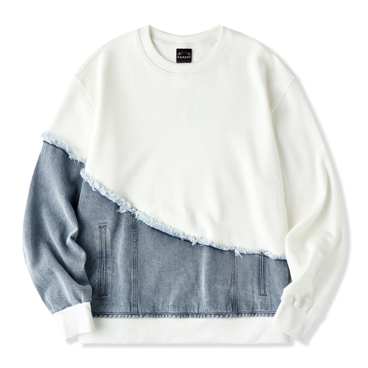 ヴィンテージ感漂うウォッシュドデニム切替が目を引く、クルーネックコットンスウェット。胸元にはクラシックなスウェットの象徴ともいえる「Vガゼット」をあしらい、首まわりの補強とデザイン性を両立。両サイドにはフェイクポケットをあしらい、実用性ではなく装飾としてのアクセントをプラスしています。程よく肉厚なコットン生地は柔らかな肌ざわりで、着込むほどに馴染む風合いを楽しめます。ボディとデニムの異素材切替が、カジュアルながらも個性を感じさせる一枚です。デニムパンツからチノまで、幅広いスタイリングにマッチします。