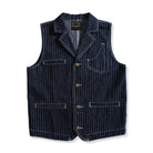 このベストはシャンブレーシャツ等のワークシャツは勿論、ボタンダウンシャツ等のキレイ目感の有るシャツとも合わせていけますし、ヘンリーネック等のカットソーにも良くあうベストです。またGジャンやレザージャケット、テーラードジャケットやフライトジャケット等のインにも幅広く使え、オールシーズンに活躍するアイテムです。インディゴ染めの為、経年変化の味わい深さにも定評があります。