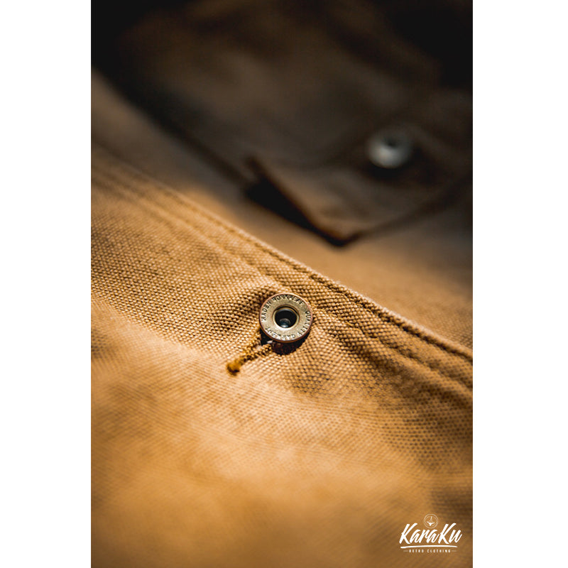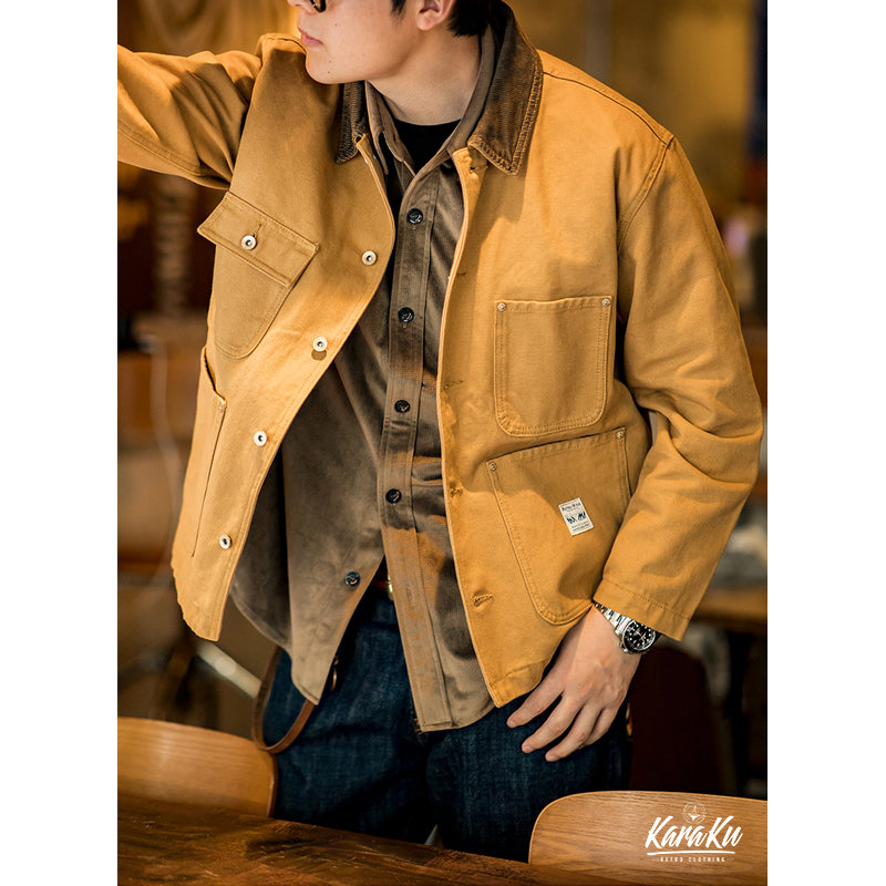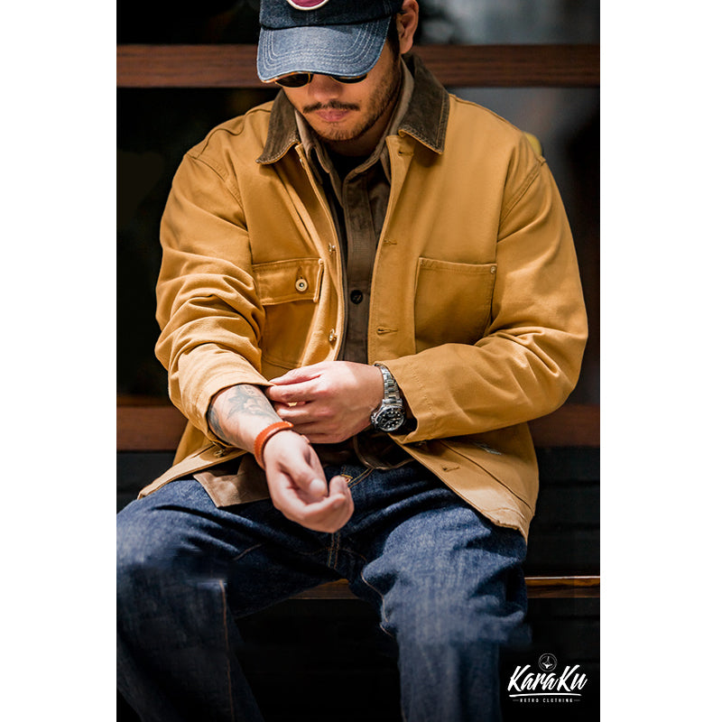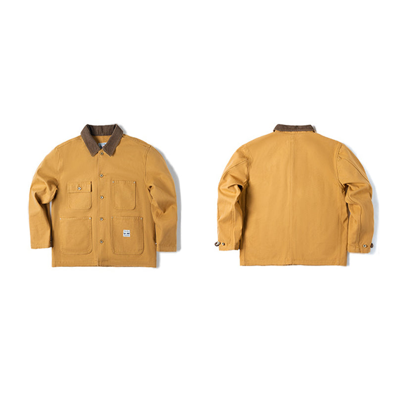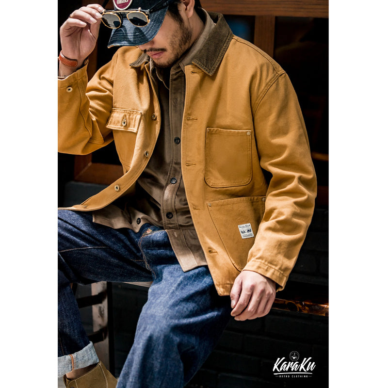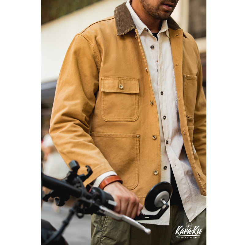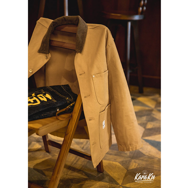 本アイテムはミシガンチョアコートのベースであるWork Styleに忠実なディテールの一着です。ボディは440gヘビーウェイトコットン100%のキャンバス生地で作られていますが、 キャンバス生地は摩耗すると柔らかくなり、あなただけの着心地のジャケットを作ります。 全てがキャンバスではなく、襟のコーデュロイの素材は見た目から秋冬のアクセントとなります。シルエットは洗練されたスッキリとしたシルエットとなっています。コントラストのあるボタンとリベットのディテールは、クラシックなワークウェアの美学から引き出されています。ボタン付きフロントクロージャー、正方形のラベル、クラシックのフロント4つのポケットなど....ディテールを忠実に復刻した一点。シンプルなので、チノパンやジーンズ、スウェットにトレーナーやシャツとの重ね着などどんなコーデも素敵にスタイリングしてくれます