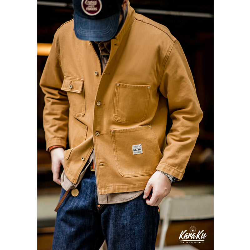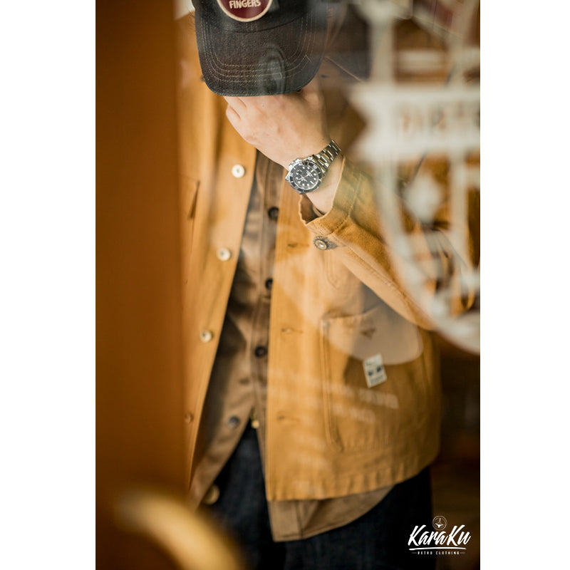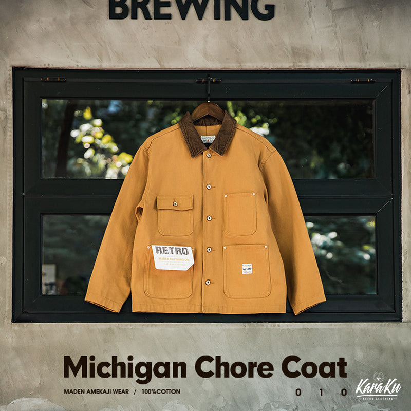 19世紀にフランス労働者が着ていた作業着が元のミシガンショアコートです。カバーオールタイプのジャケットであって、チョアコートとも呼ばれます。ワークウェアの定番アイテムの一つで、シンプルなカバーオールタイプです。