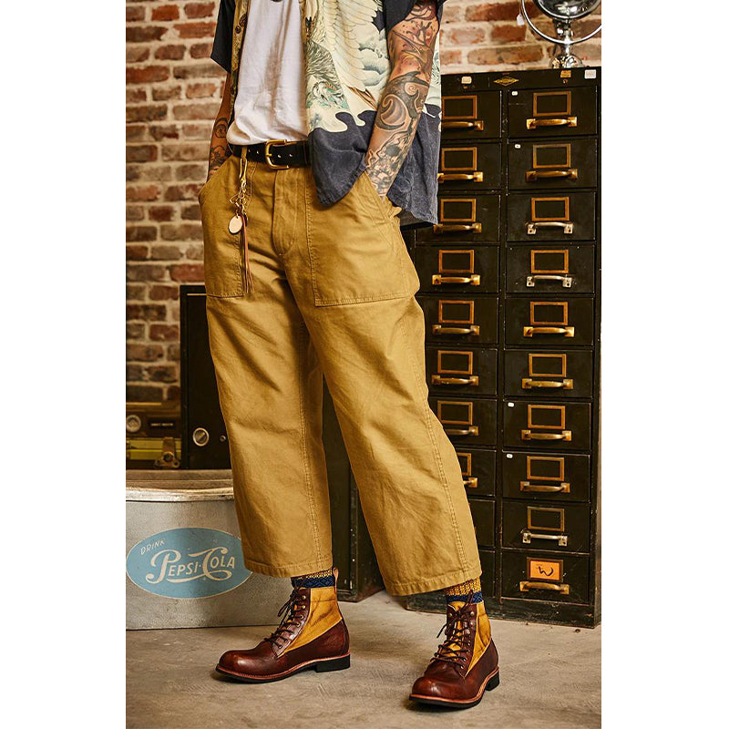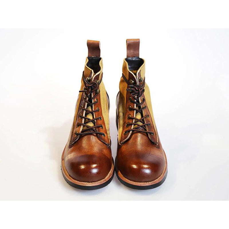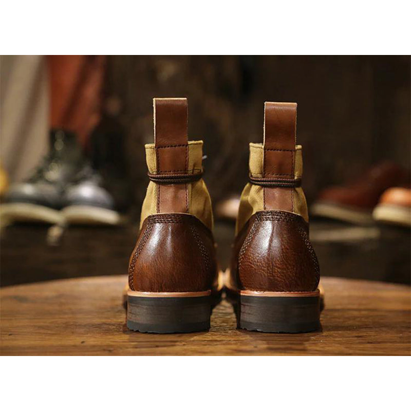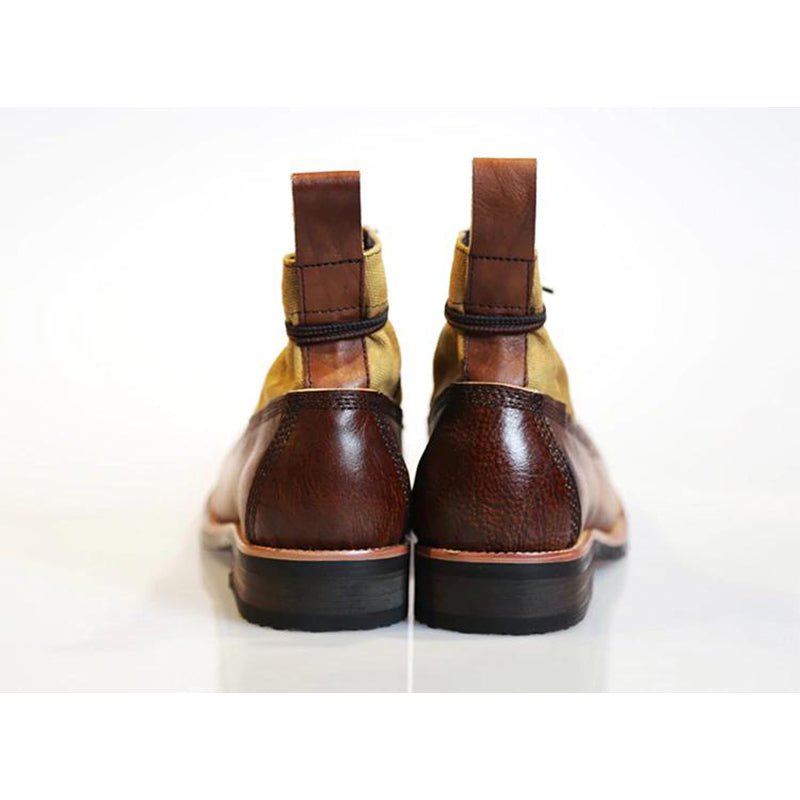 本アイテムはは色々なデザインと靴形を研究して、開発できたものだ。手作り中に一番難しいのはカラーラビング工芸のが特徴、顔料の調合は技術が必要で、ほどよいカラートーンをできるかどうかも職人のレベルによりますので、かなり時間と工夫をかかる。現在このようなオリジナル作り方で作られる工芸商品はまずらしくて、手作りは非常に時間かかって、大規模で生産ラインで生産のは難しい。仕上げったものは絶妙な色ト質感で表現さる。作り中は百回以上のカラーラビングする必要があり、自然乾燥させ、また同じ工程を繰り返す。職人は一から手作り物なので、一足ずつは違った表情のも魅力。こちらのブーツのレザーもキャンバスも、カラーラビングされてからまた水洗いの処理もされ、またカラーラビングを繰り返す。それで自然と絶妙なユーズド感を作り出す。