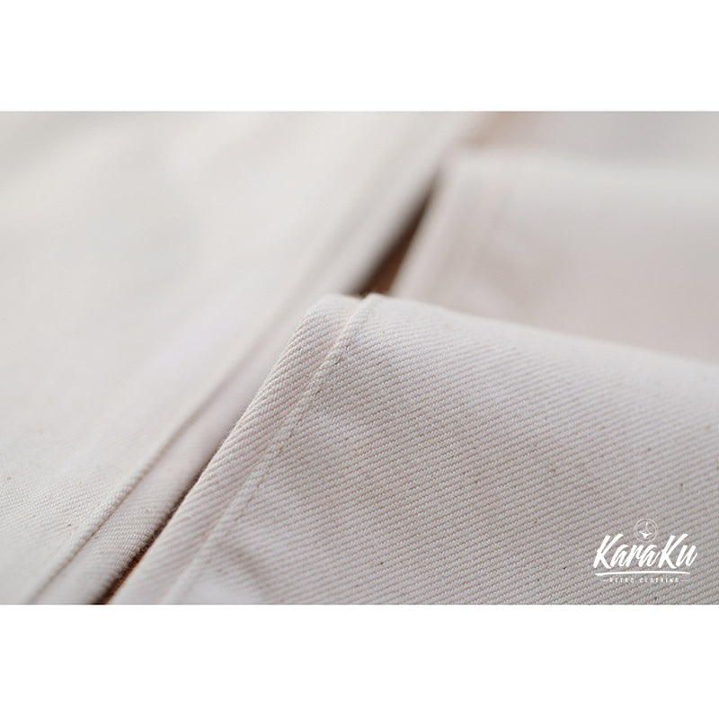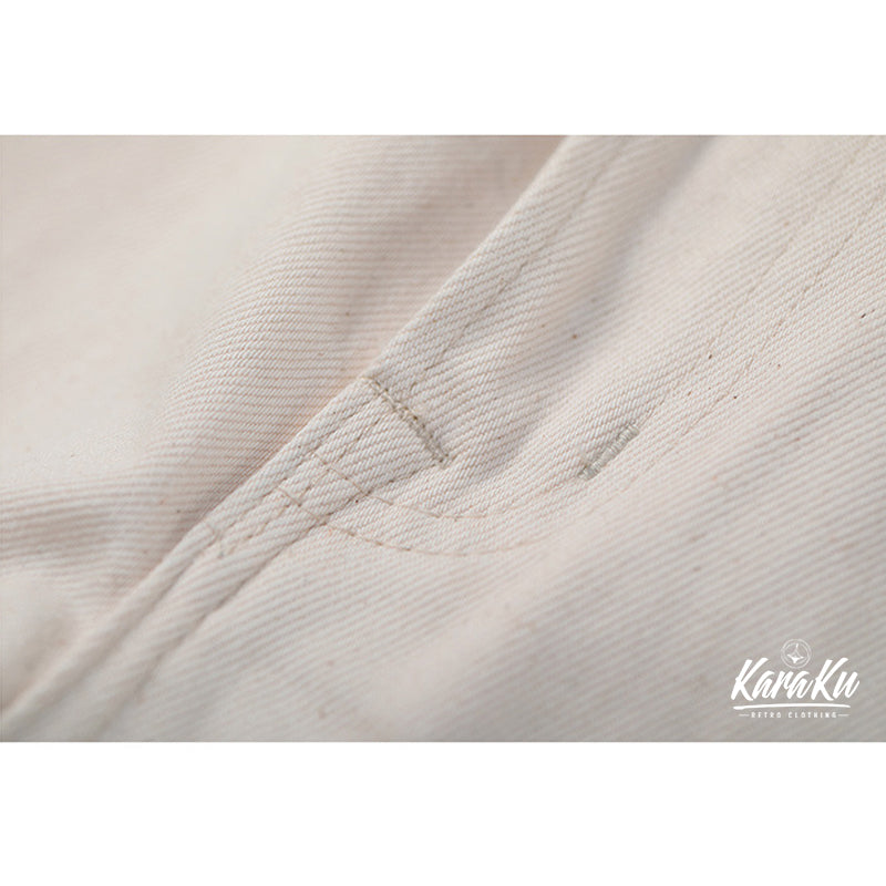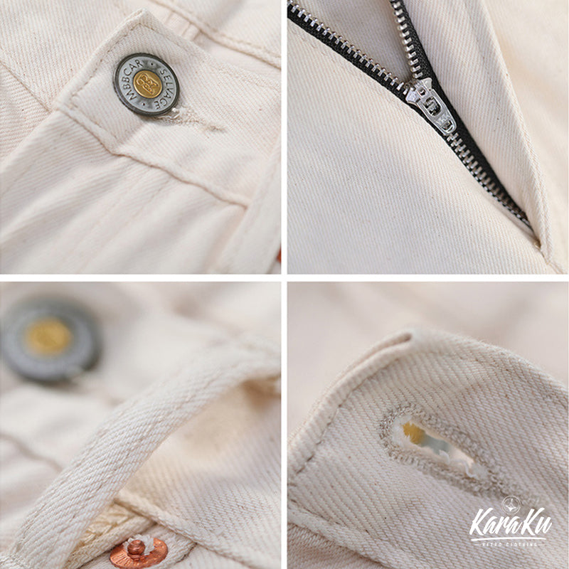 本アイテムは、12oz赤耳ホワイトデニムを使用、コットンの殻や綿実が残っている一番オリジナルの状態で表現して、真っ白ではなくオフホワイトを使用し、絶妙なビンテージ感が溢れる。オーダーメイドしたYKKジッパーとボタン付き、フロントにビッグポケット2つ、背面にパッチポケット2つ を配置、機能性が満載。レザーパッチは植物タンニン鞣を使用し、ブランドに誕生し、今も引き継がれているレザーパッチマークです。